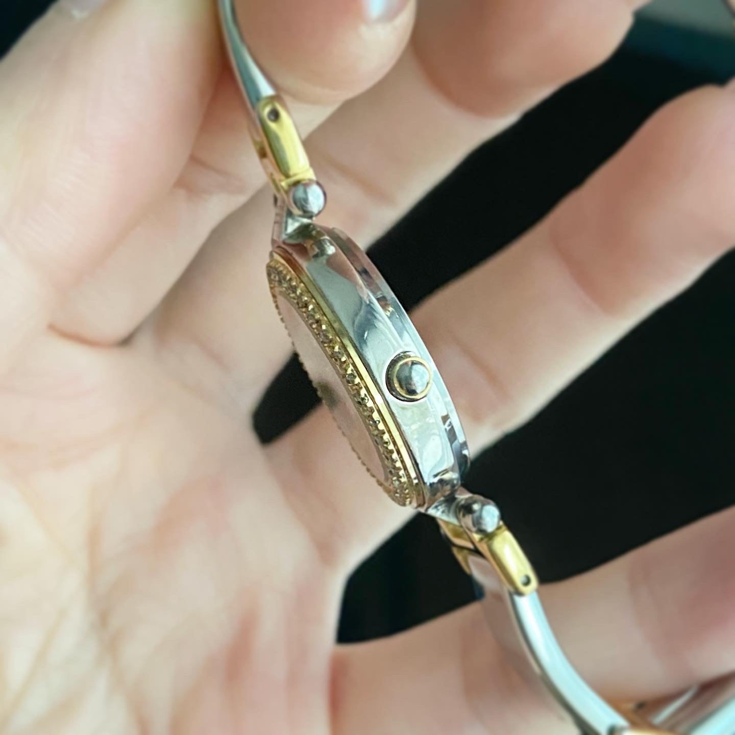 Dial: Gold tone dial with 2 gold tone hands and natural stone indexes.