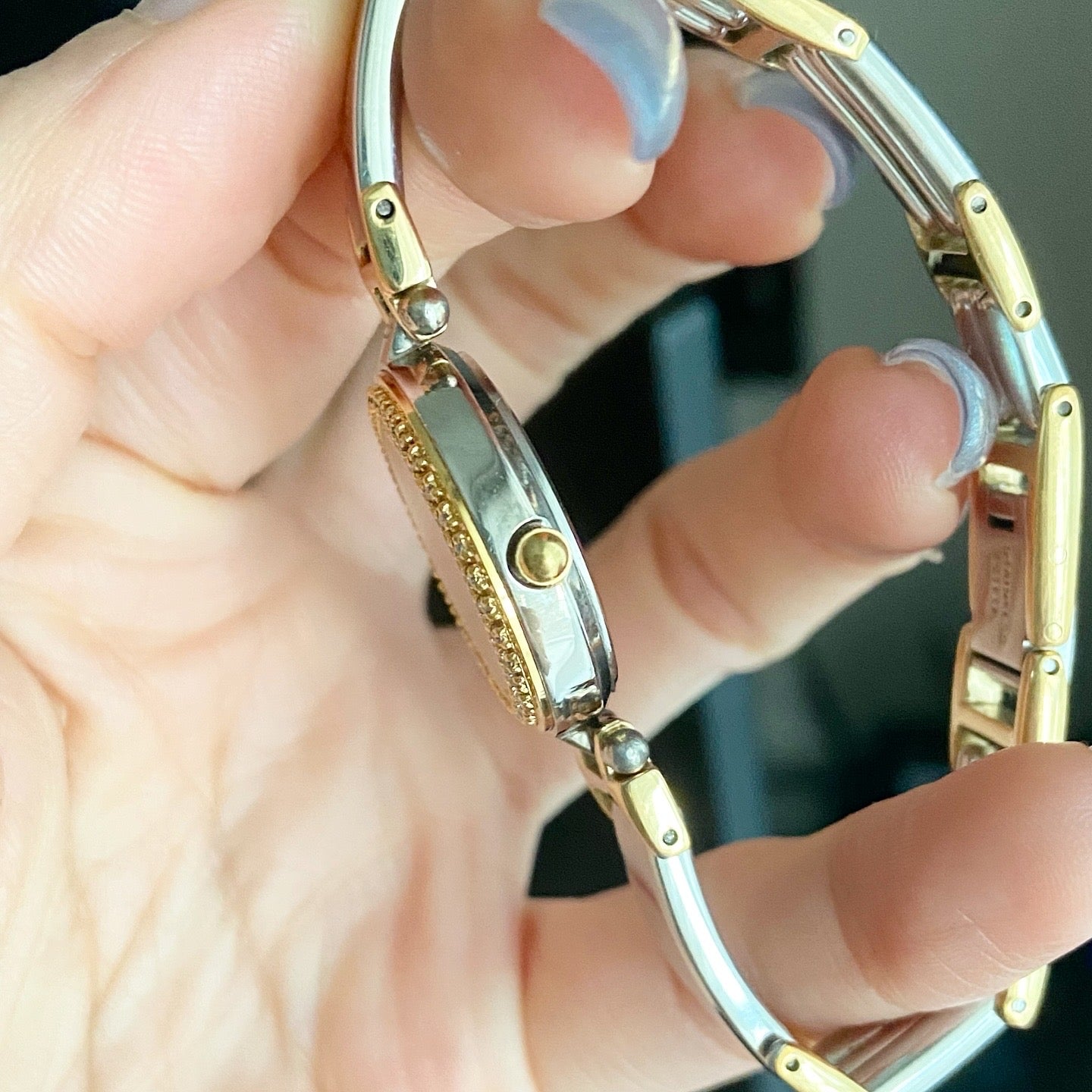 Dial: Gold tone dial with 2 gold tone hands and natural stone indexes.