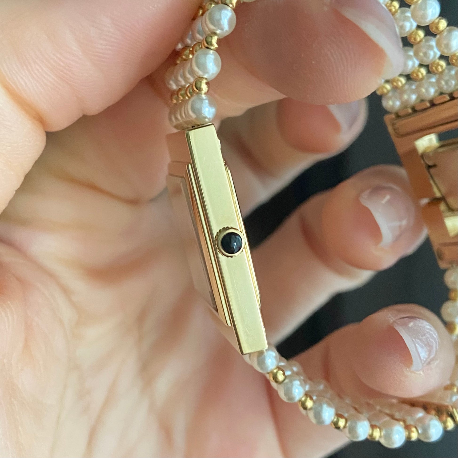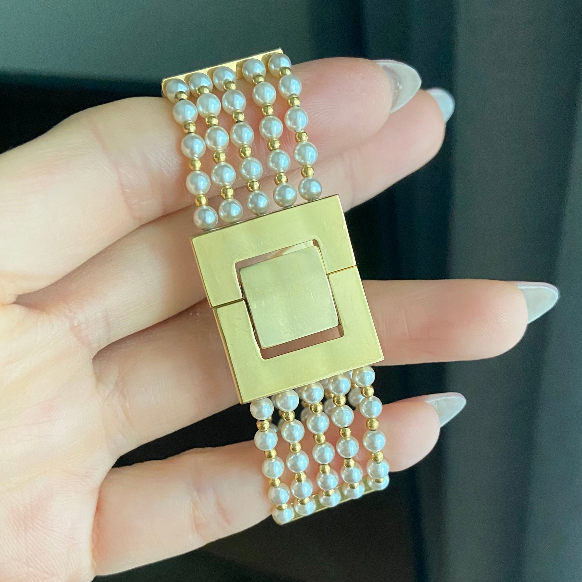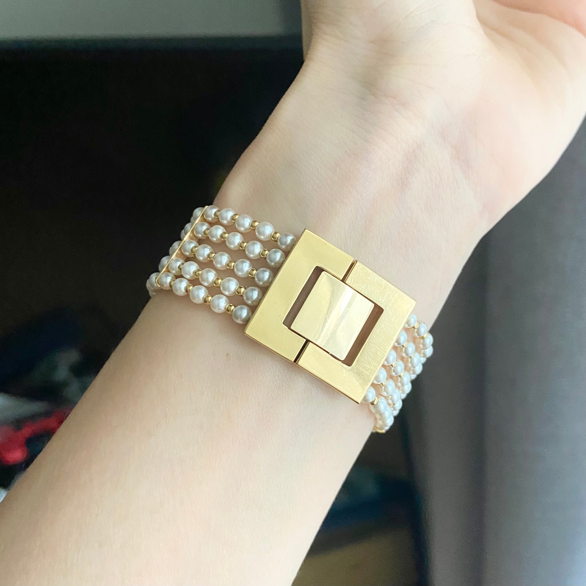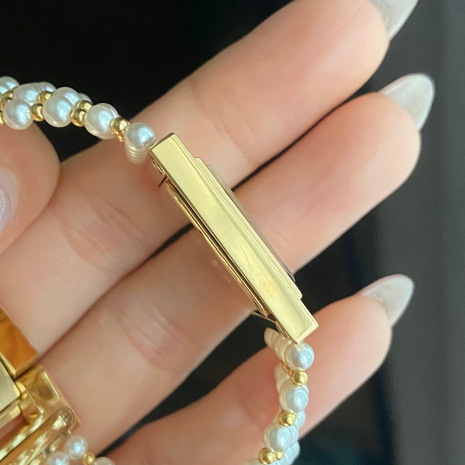 Bracelet material: Gold Plated Stainless Steel with Pearls.