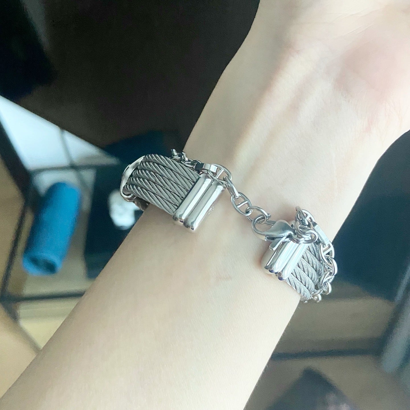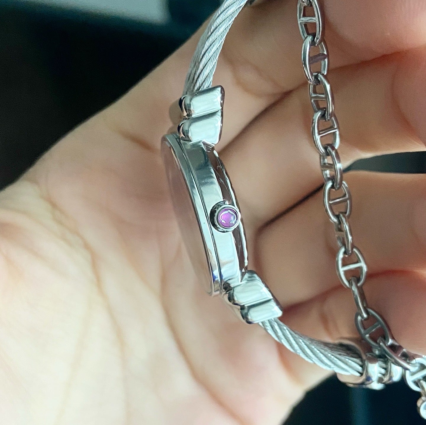 Dial: Purple MOP dial, 2 silver tone hands. Outer part is also purple MOP with mixed indices (roman/stick).
