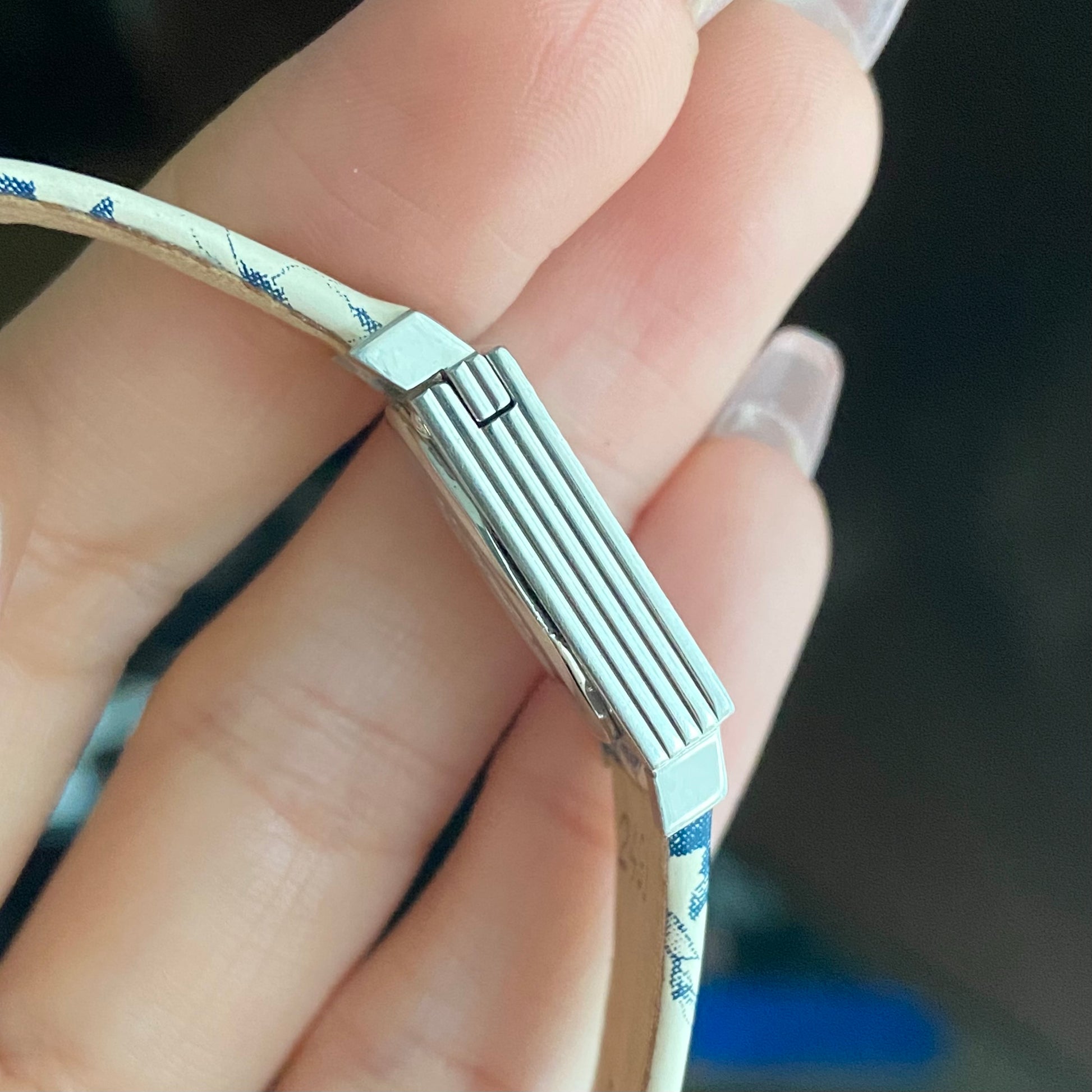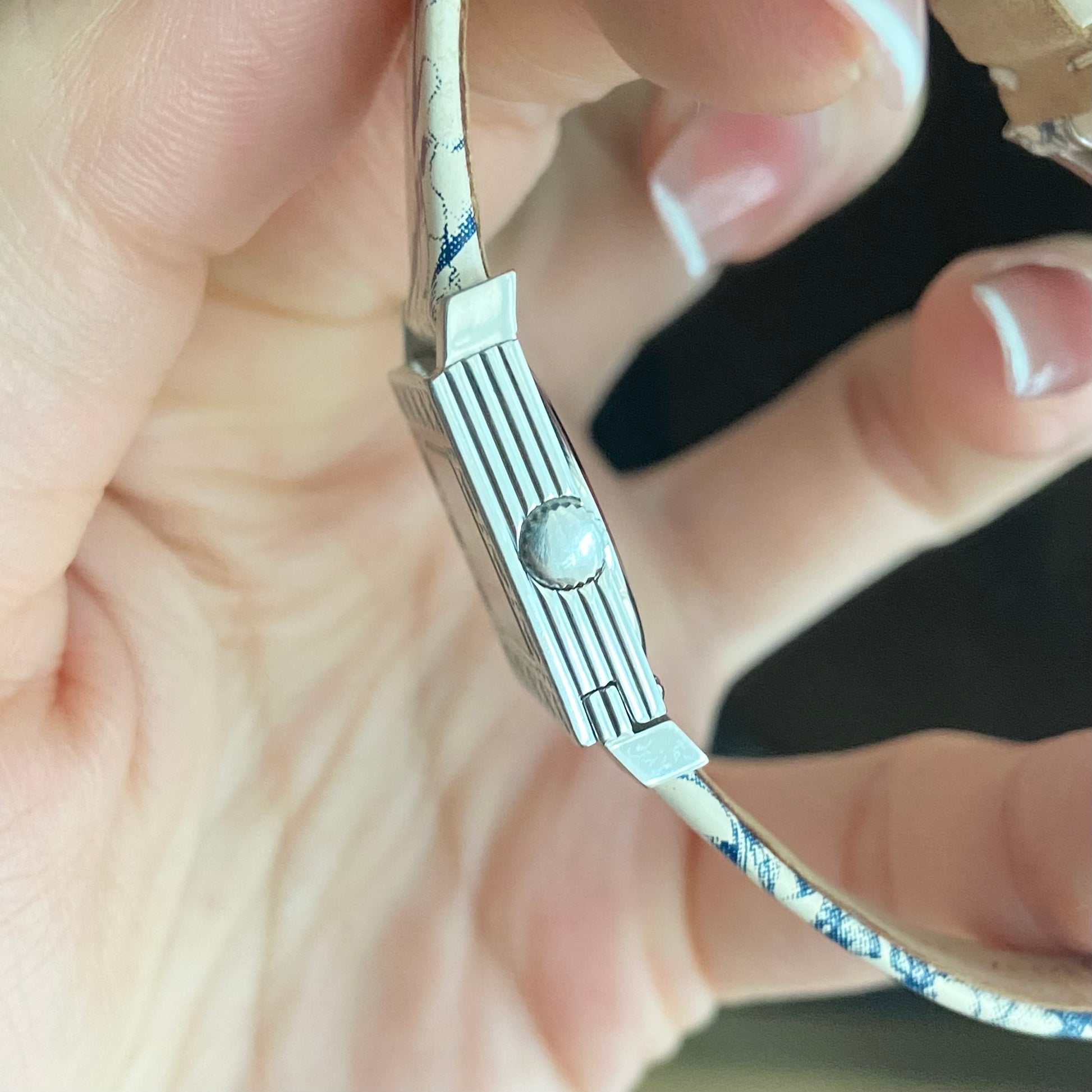Strap: Leather with flowery art on ivory white strap. (New condition)