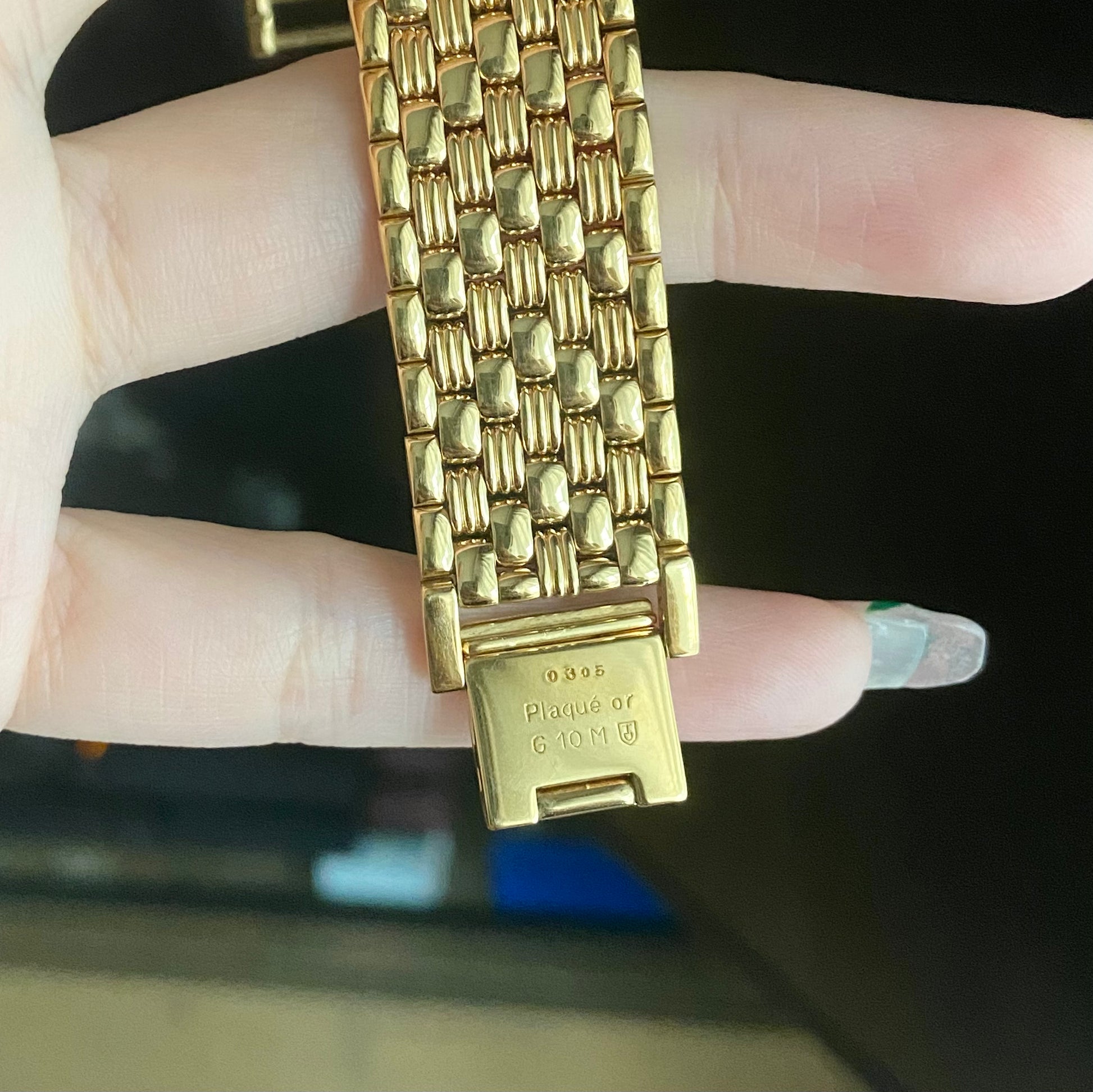 Dial: Matte gold tone with texture, 2 gold tone hands. Date complication. Stones indices.