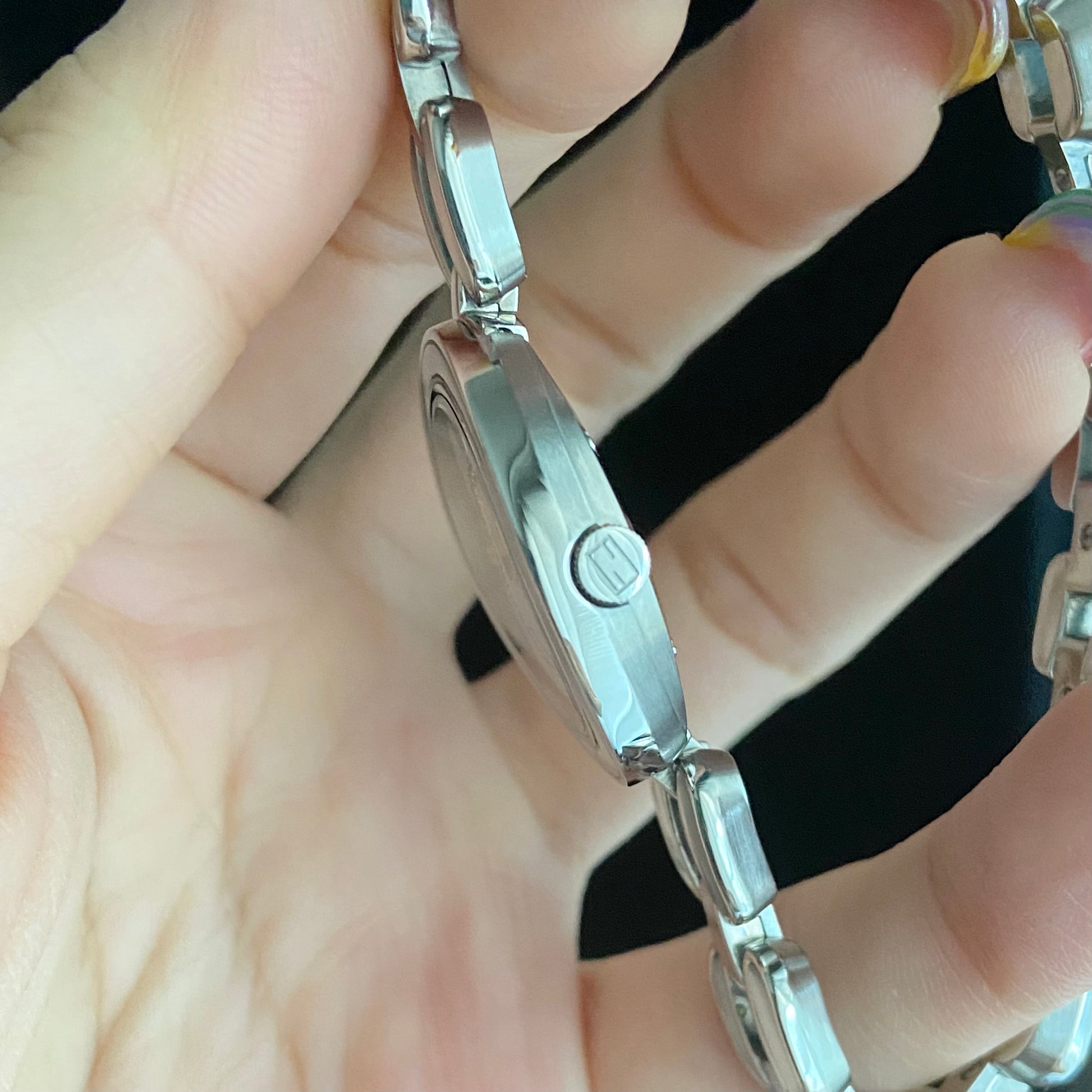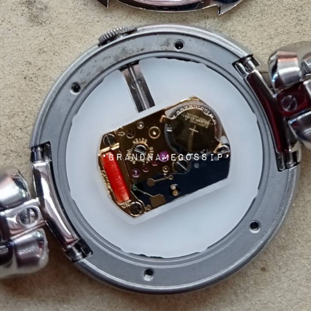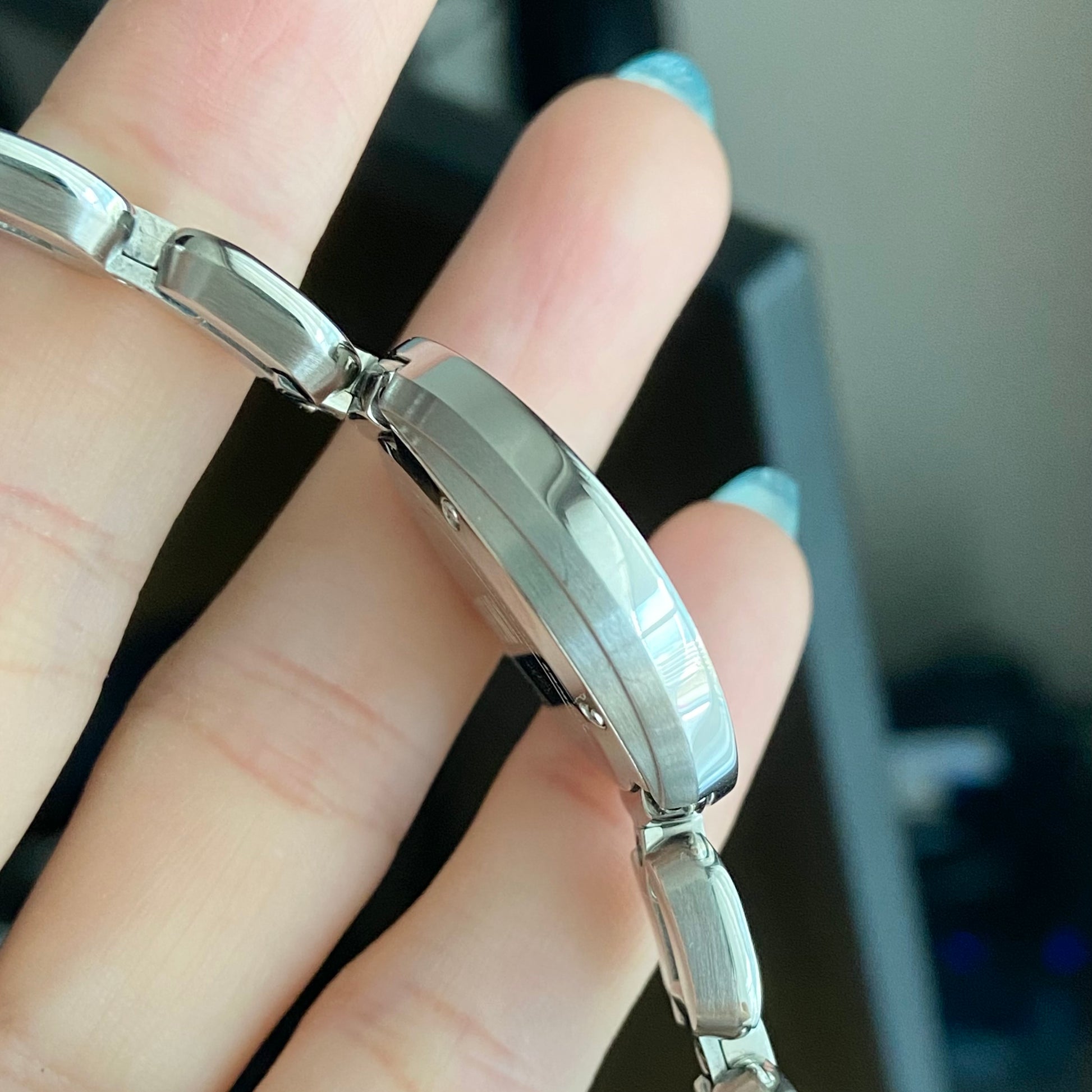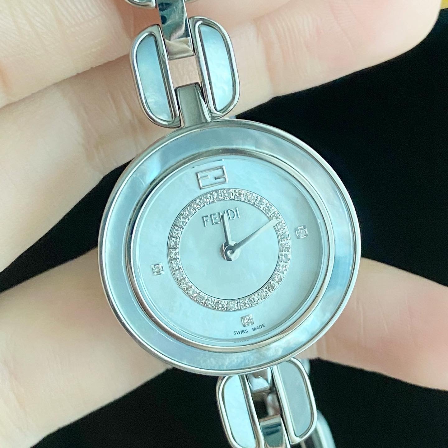 Dial: White mother of pearl dial with 2 silver tone hands, a circle of 32p diamonds (~0.32cts), and diamond indices (~0.01ct).