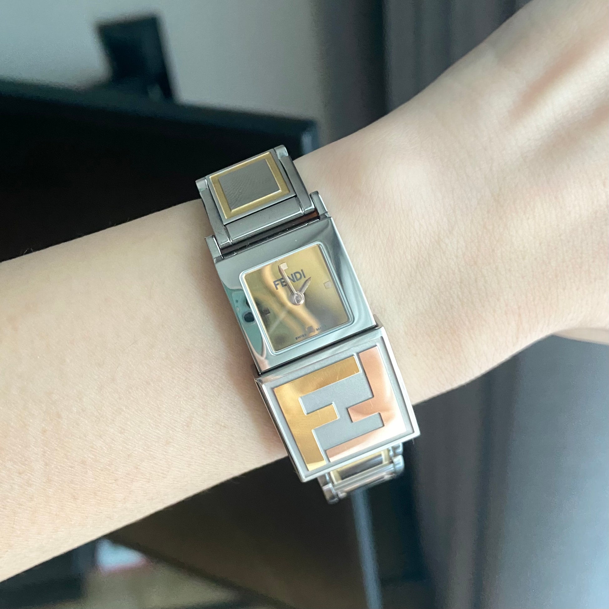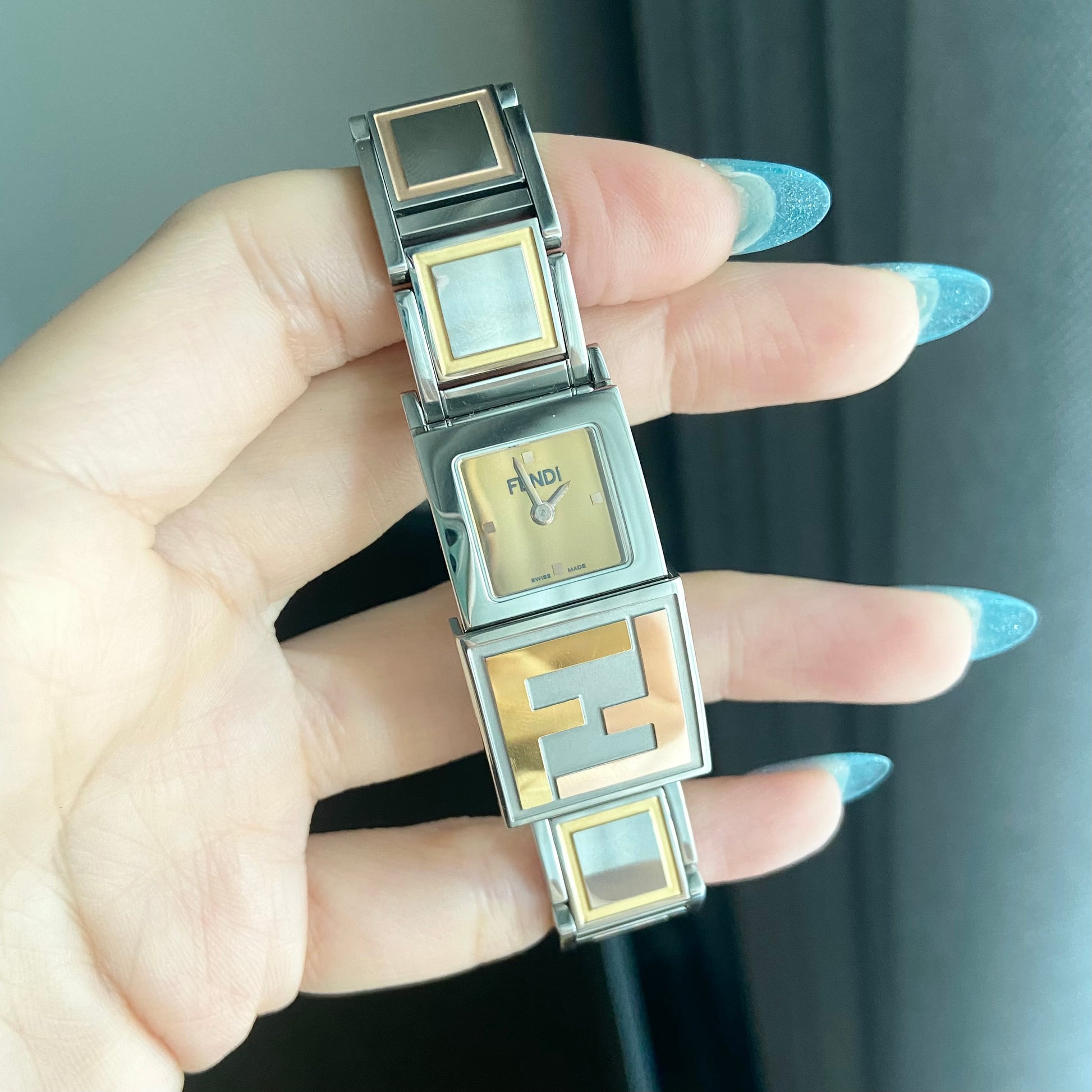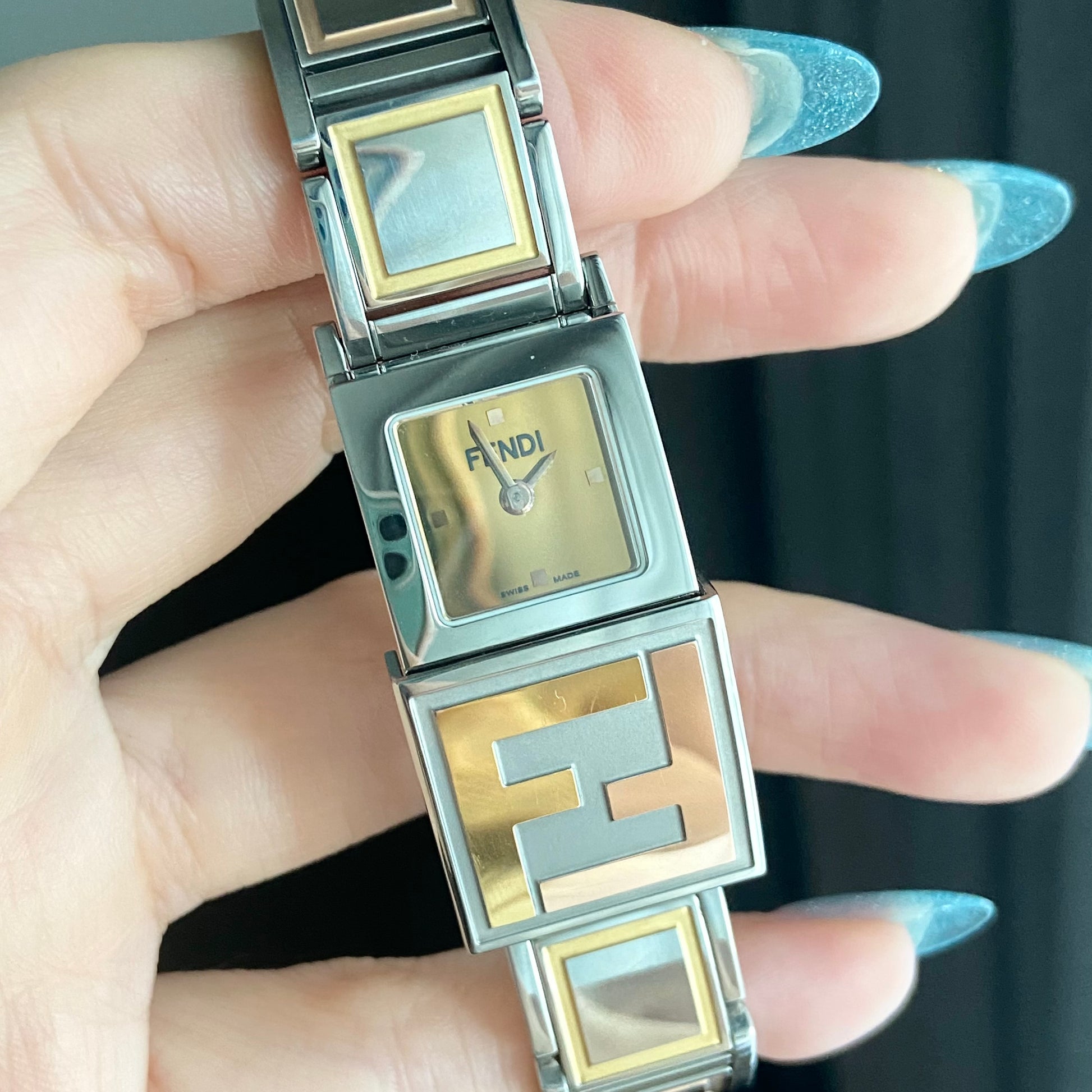 Case material: Stainless steel with 'FF' embossed in gold tone and rosegold tone on slidable case cover partially.