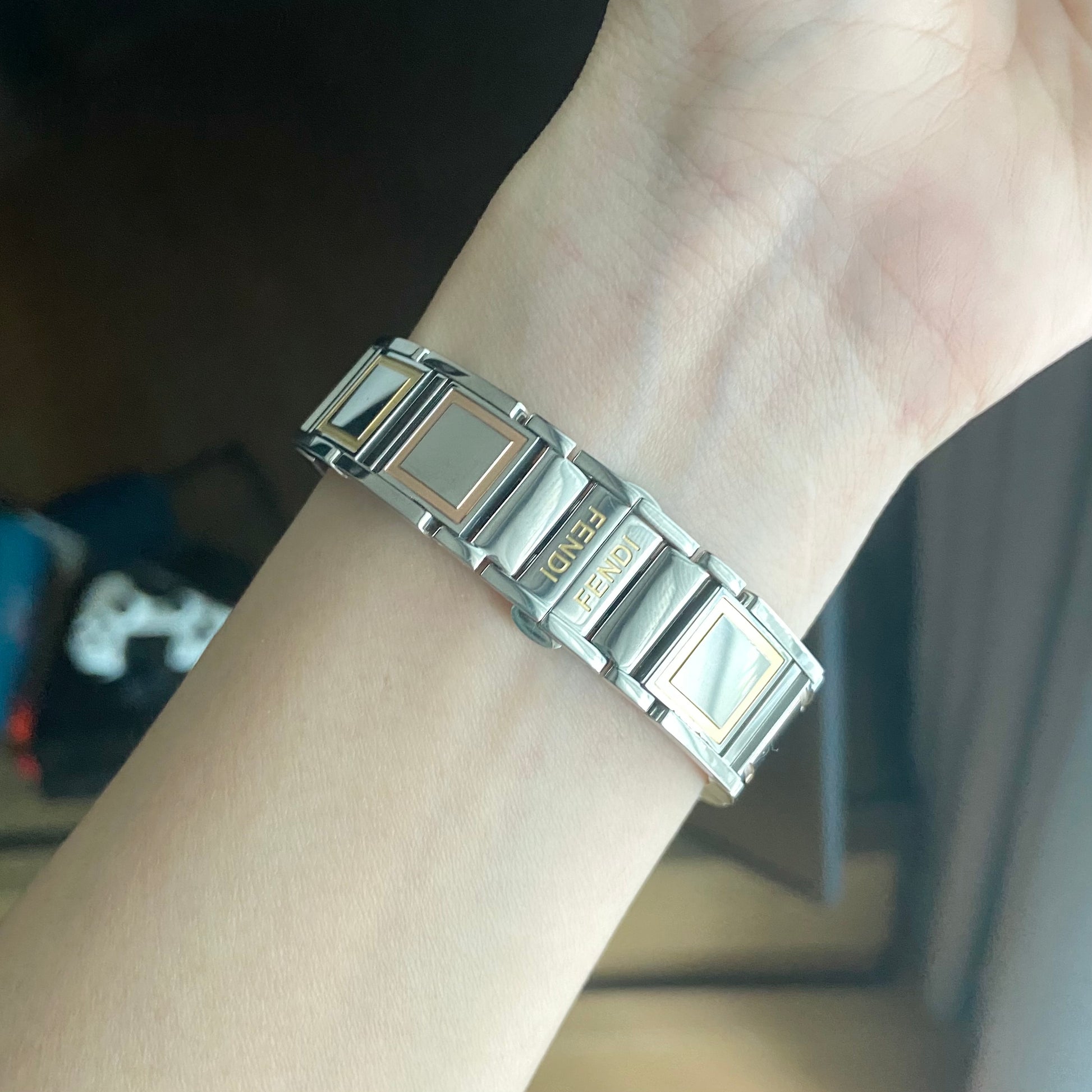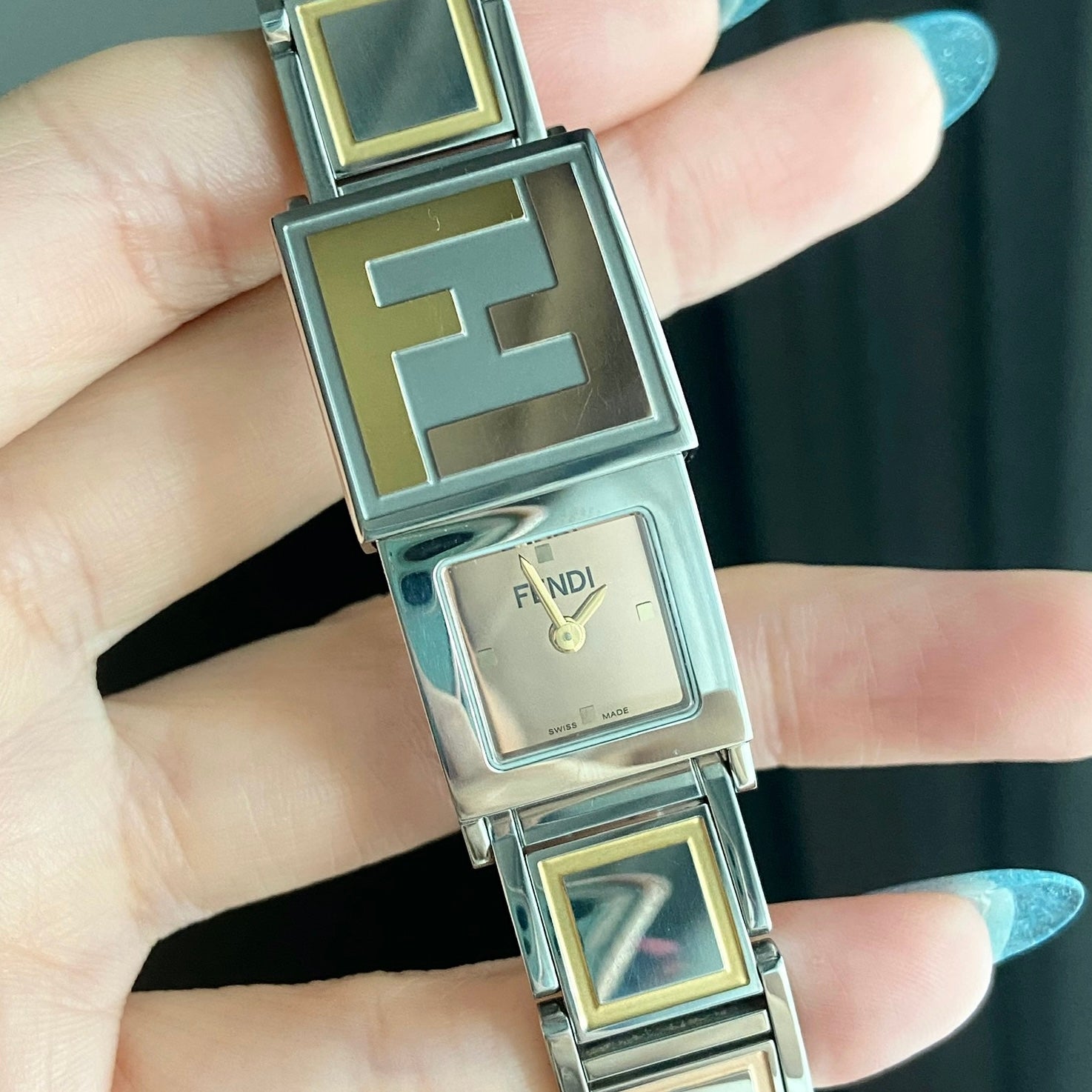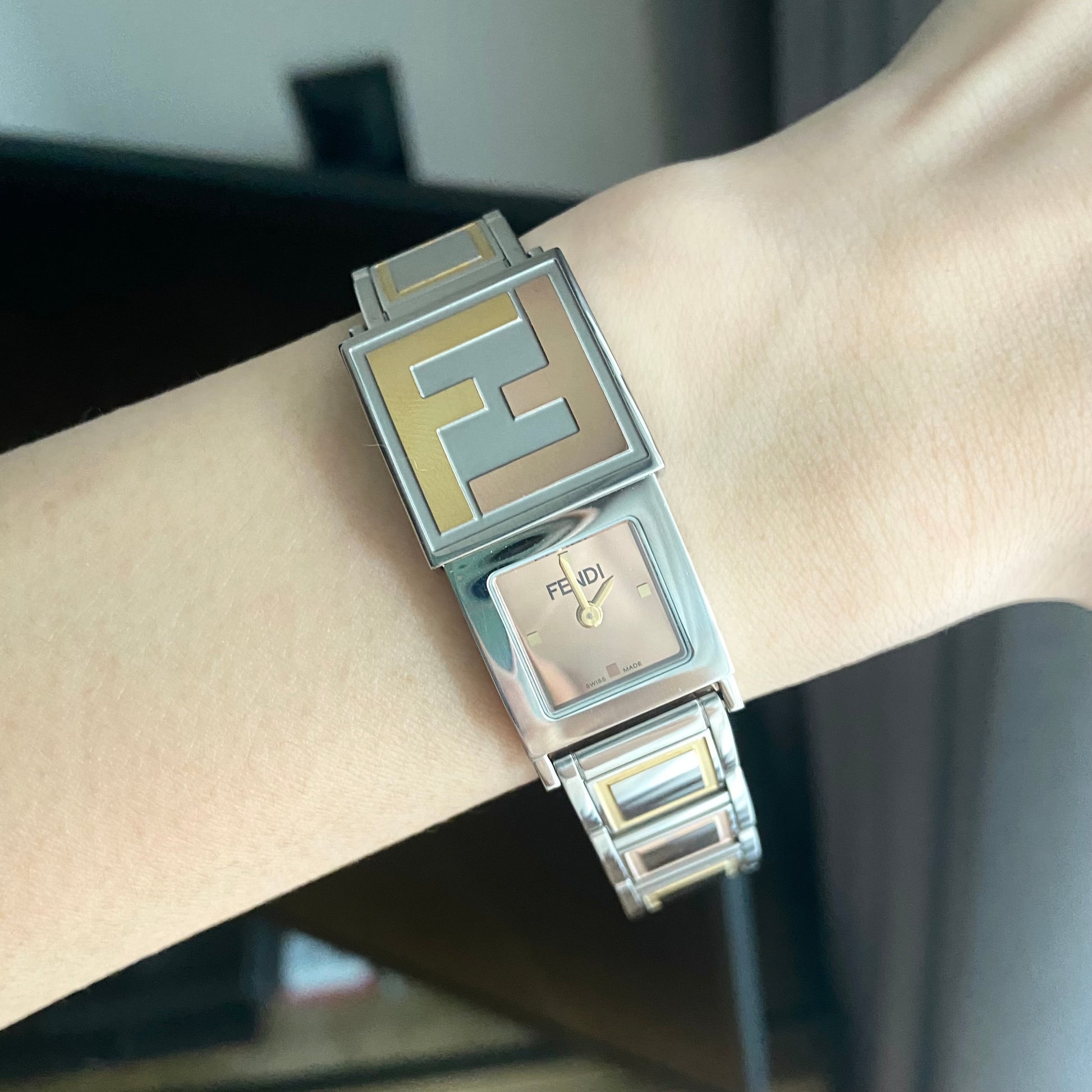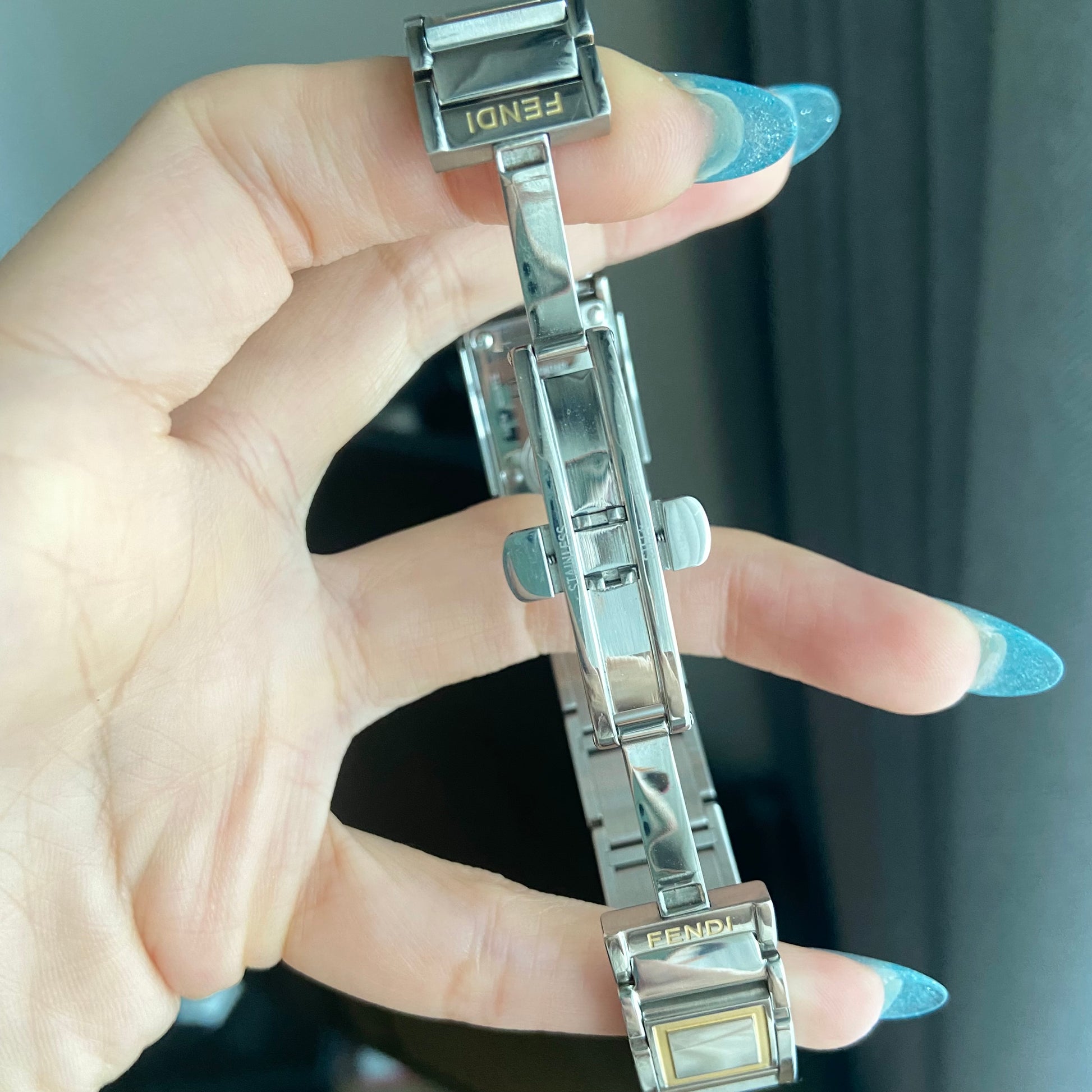 Case material: Stainless steel with 'FF' embossed in gold tone and rosegold tone on slidable case cover partially.