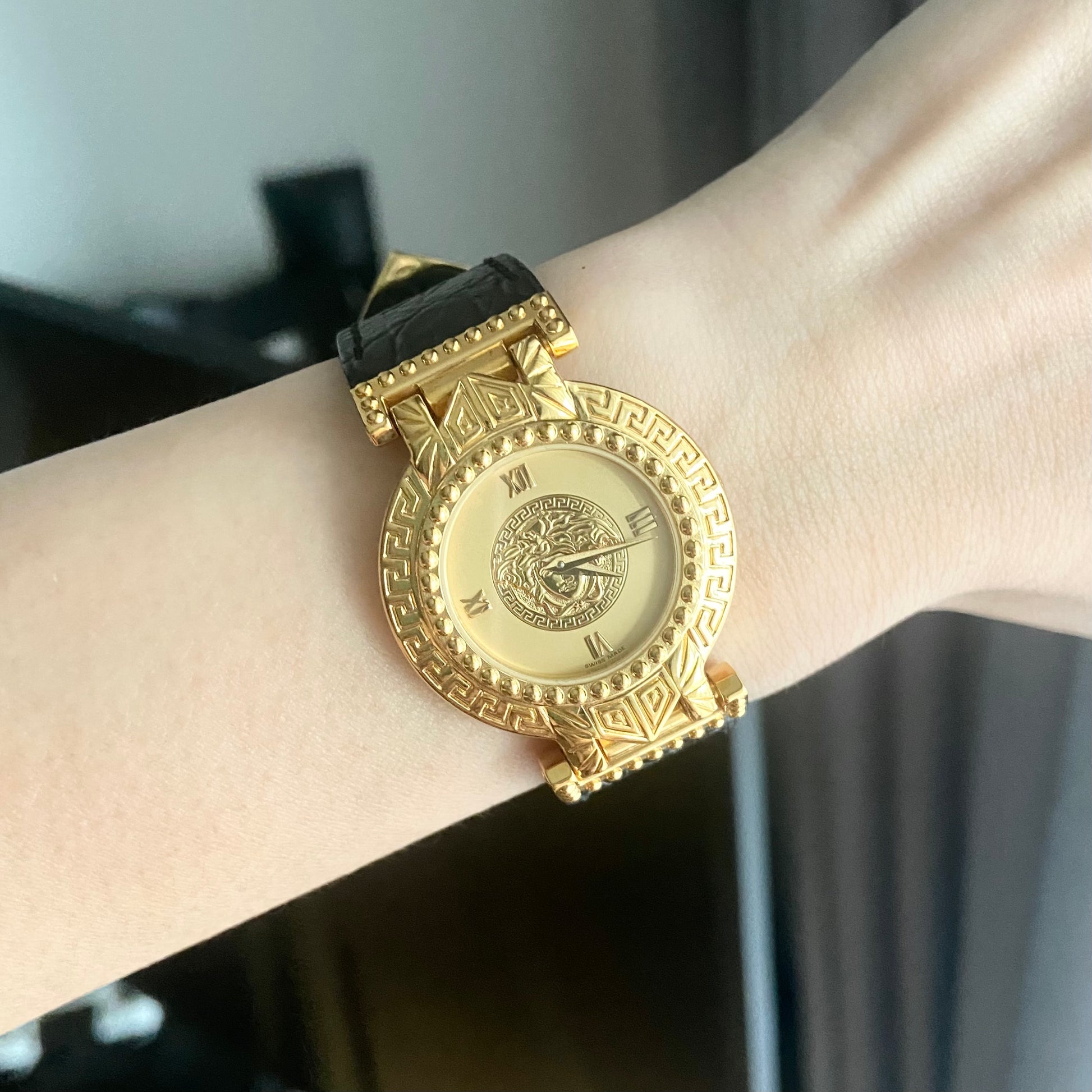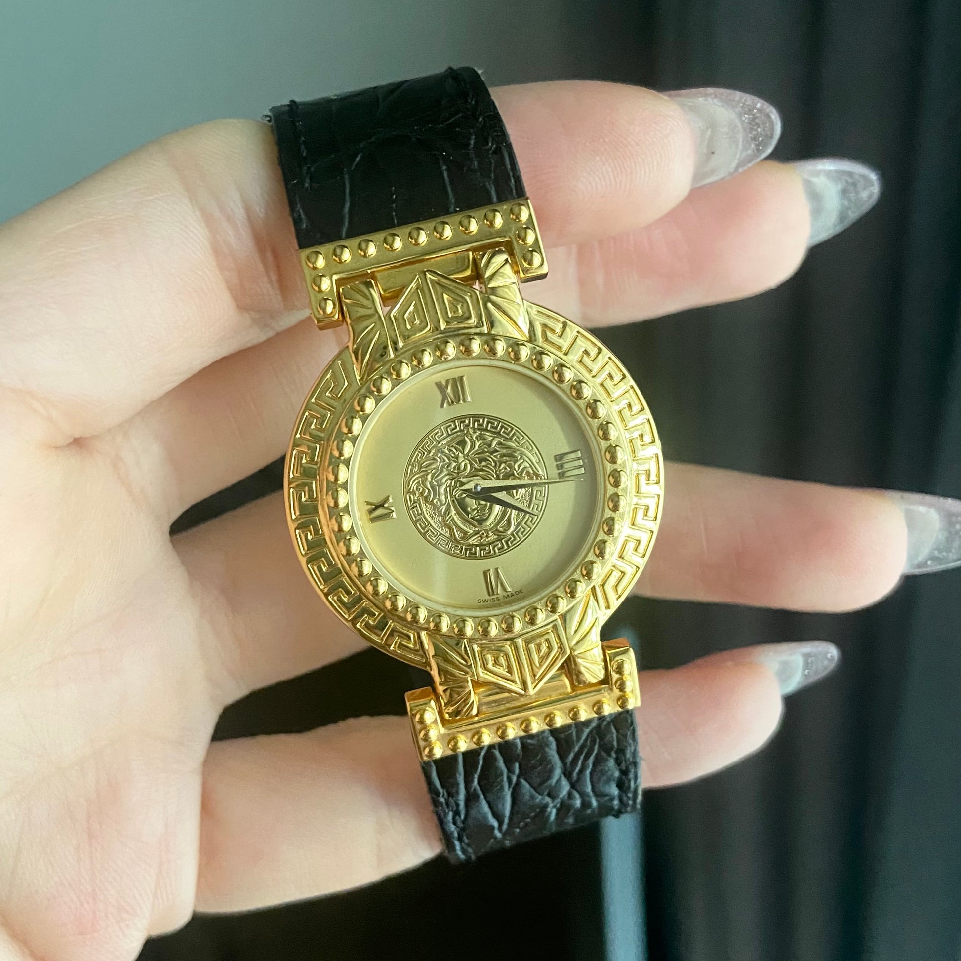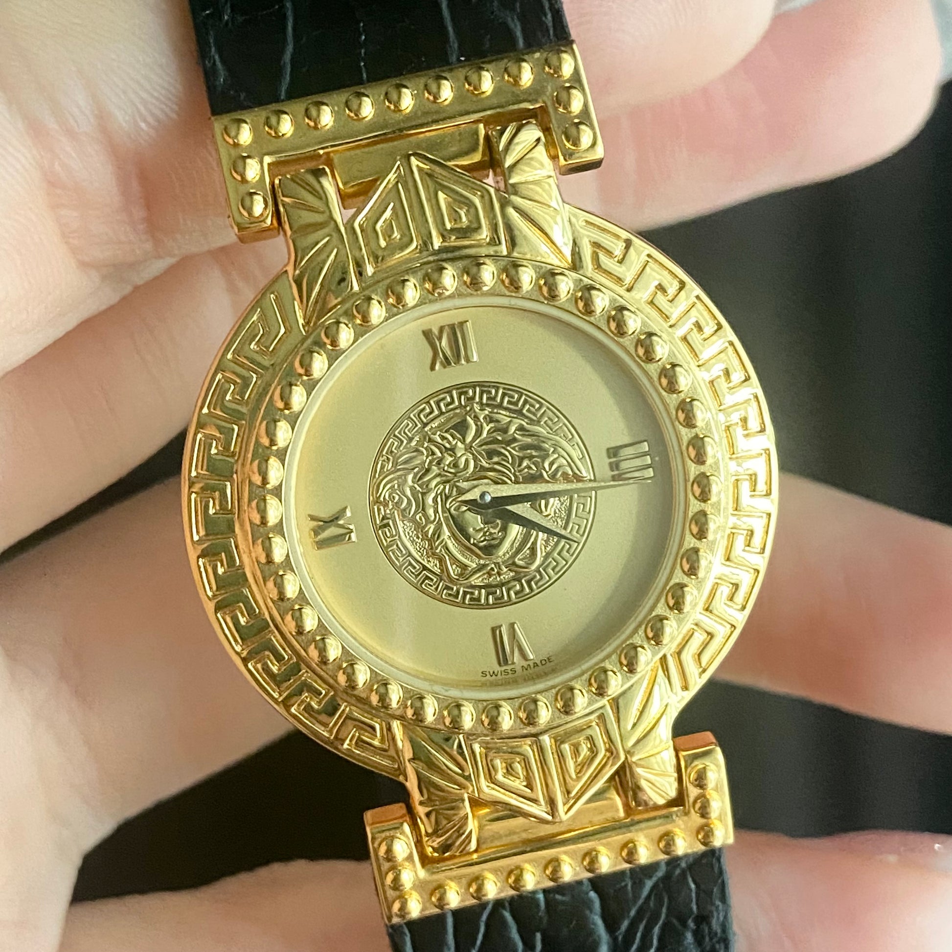 Dial: A gold-tone Medusa dial with Versace’s signature pattern on a matte gold background, and 2 gold tone hands.