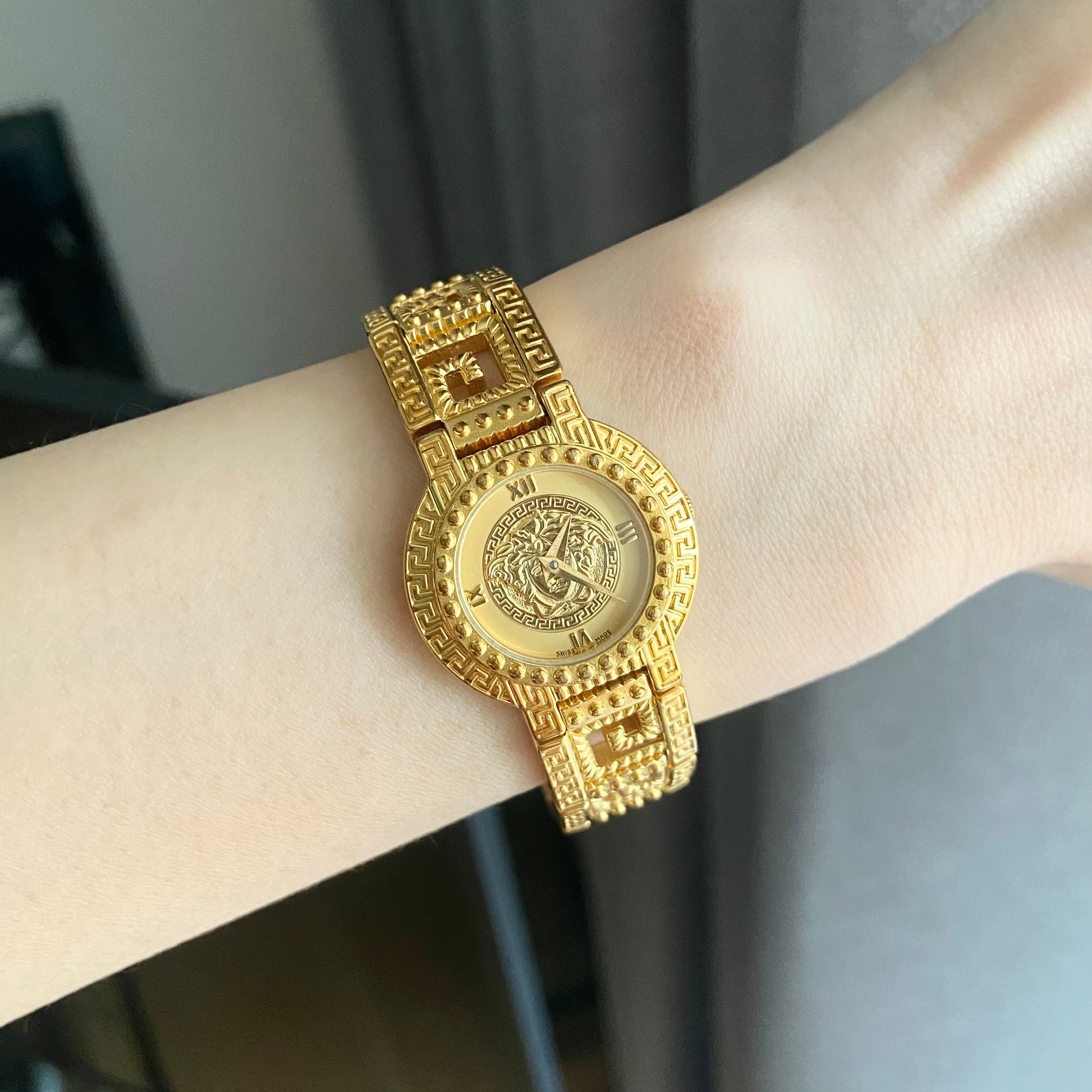 Dial: Medusa in shining gold tone with matte gold tone around, roman numerals with 2 gold tone hands.