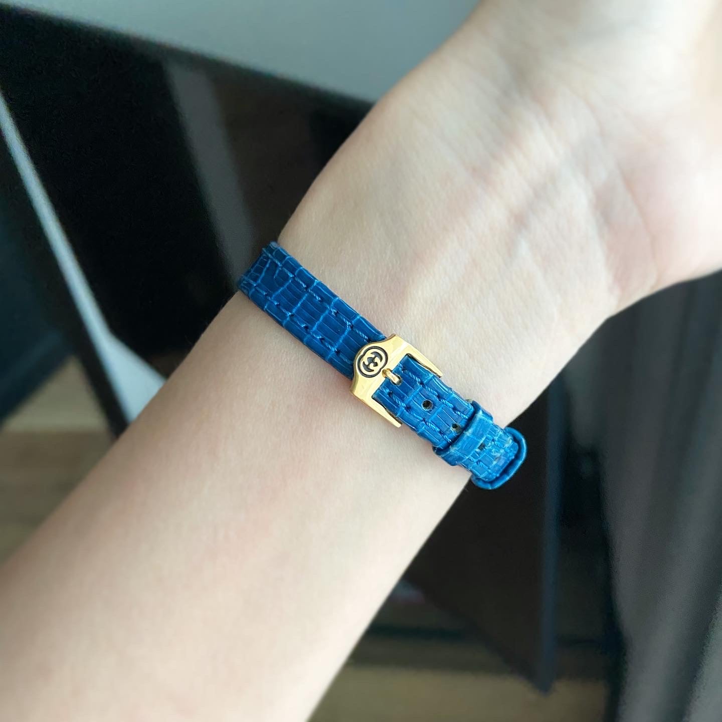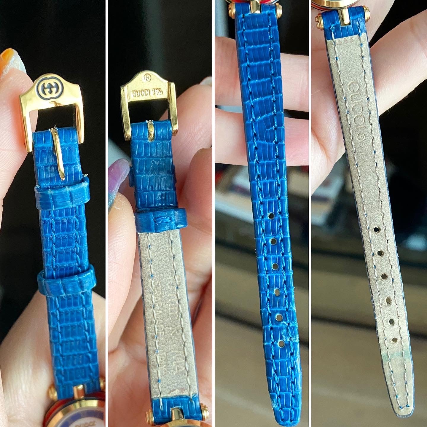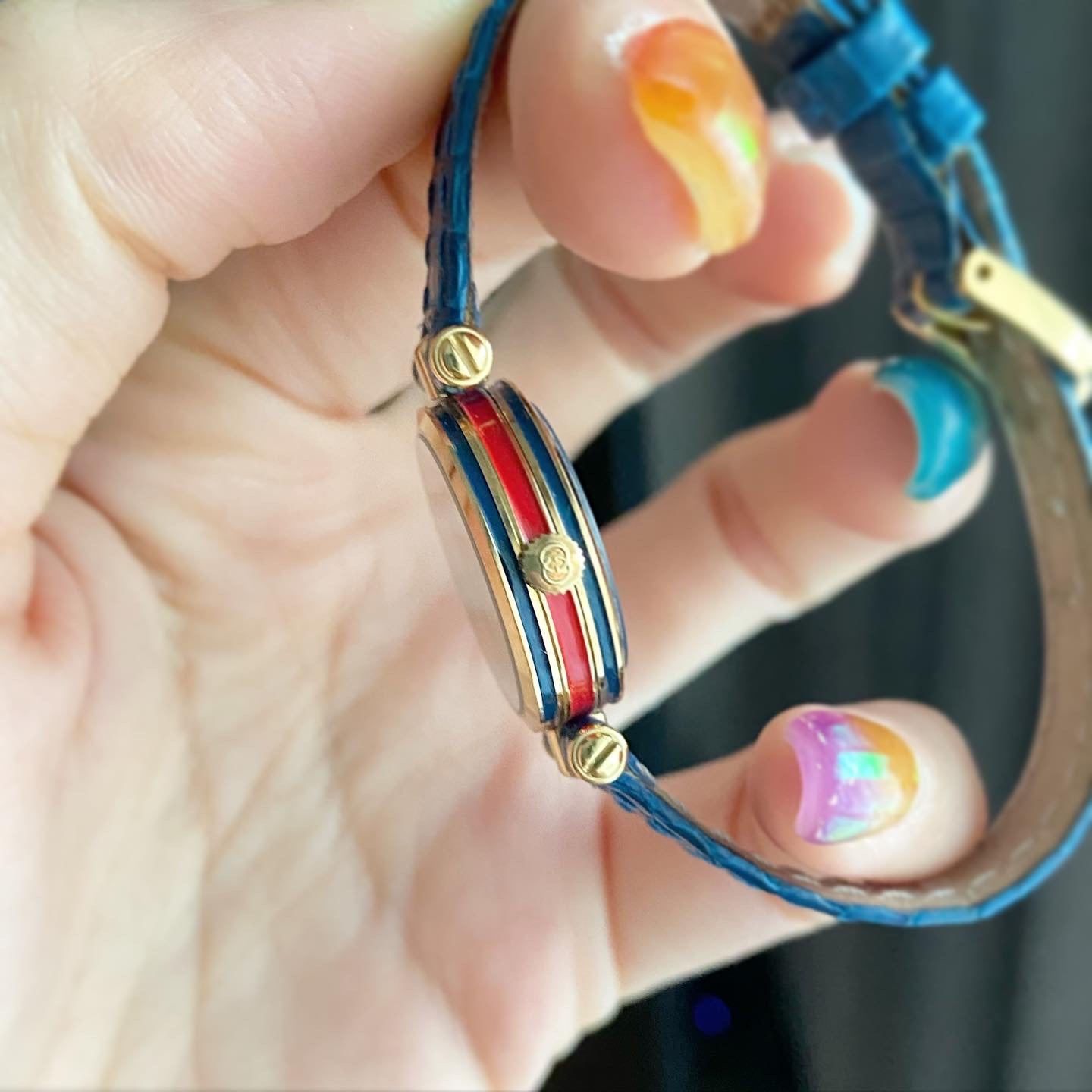 Case material: 18K Gold Plated 10M with green/red/green Gucci's signature colors.