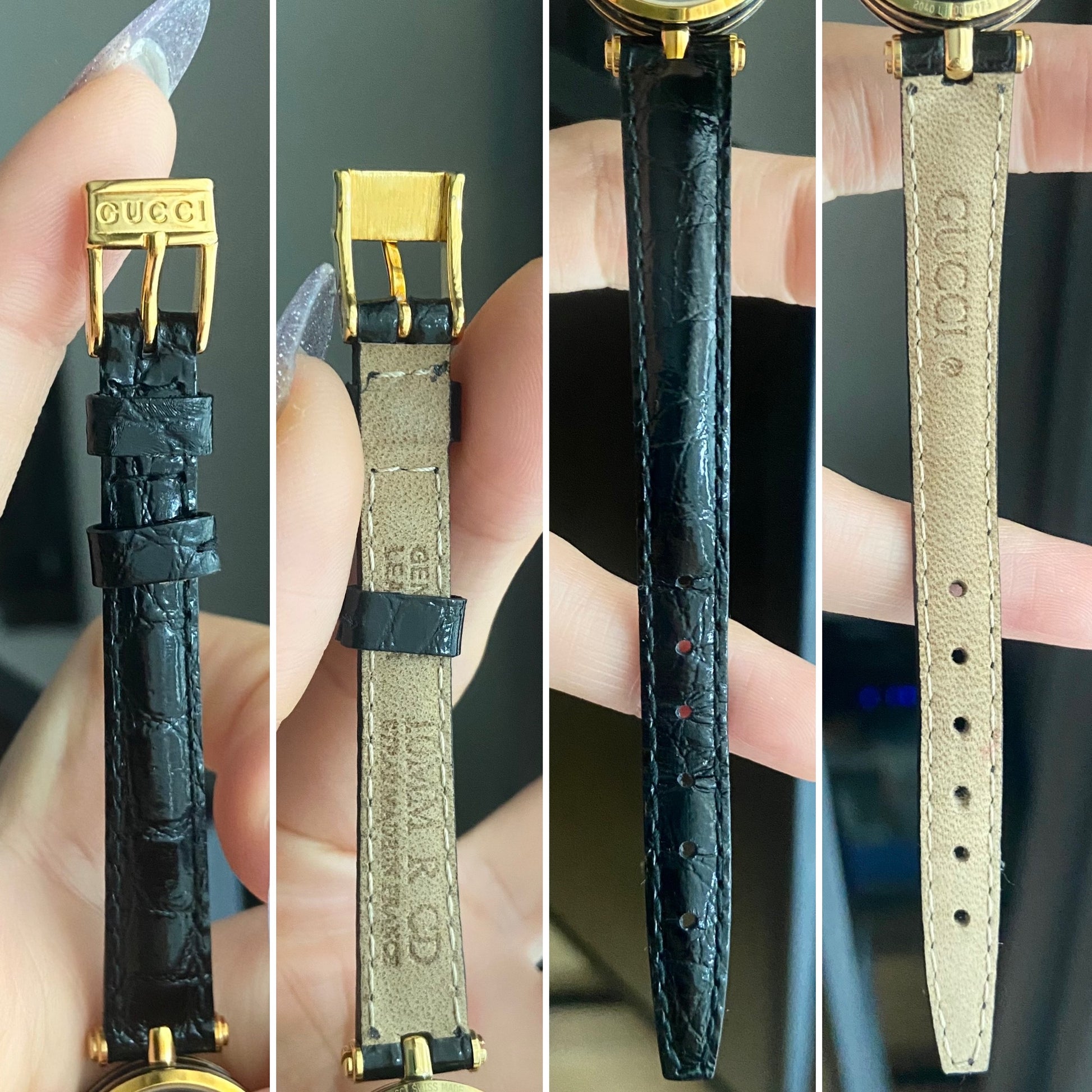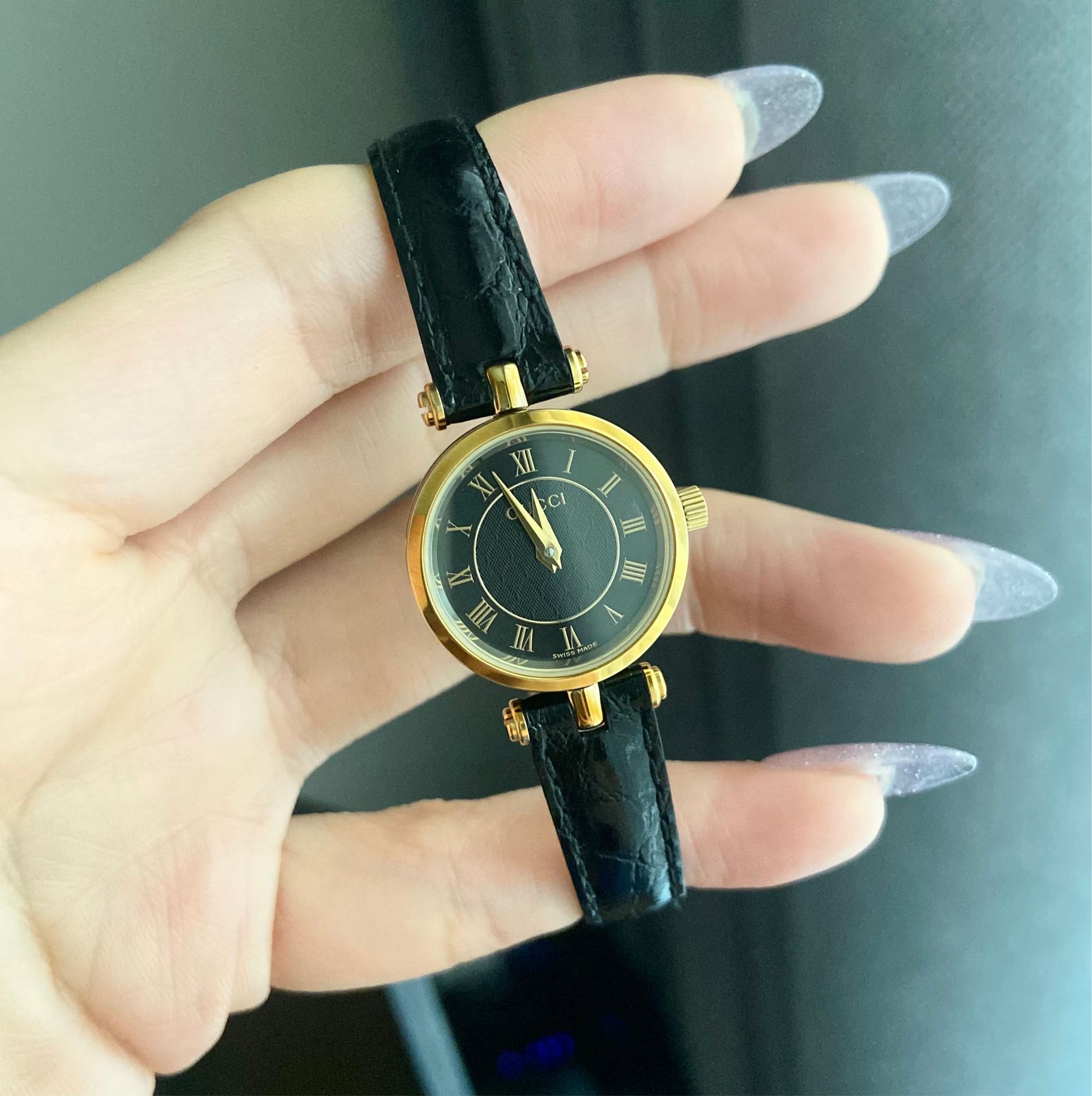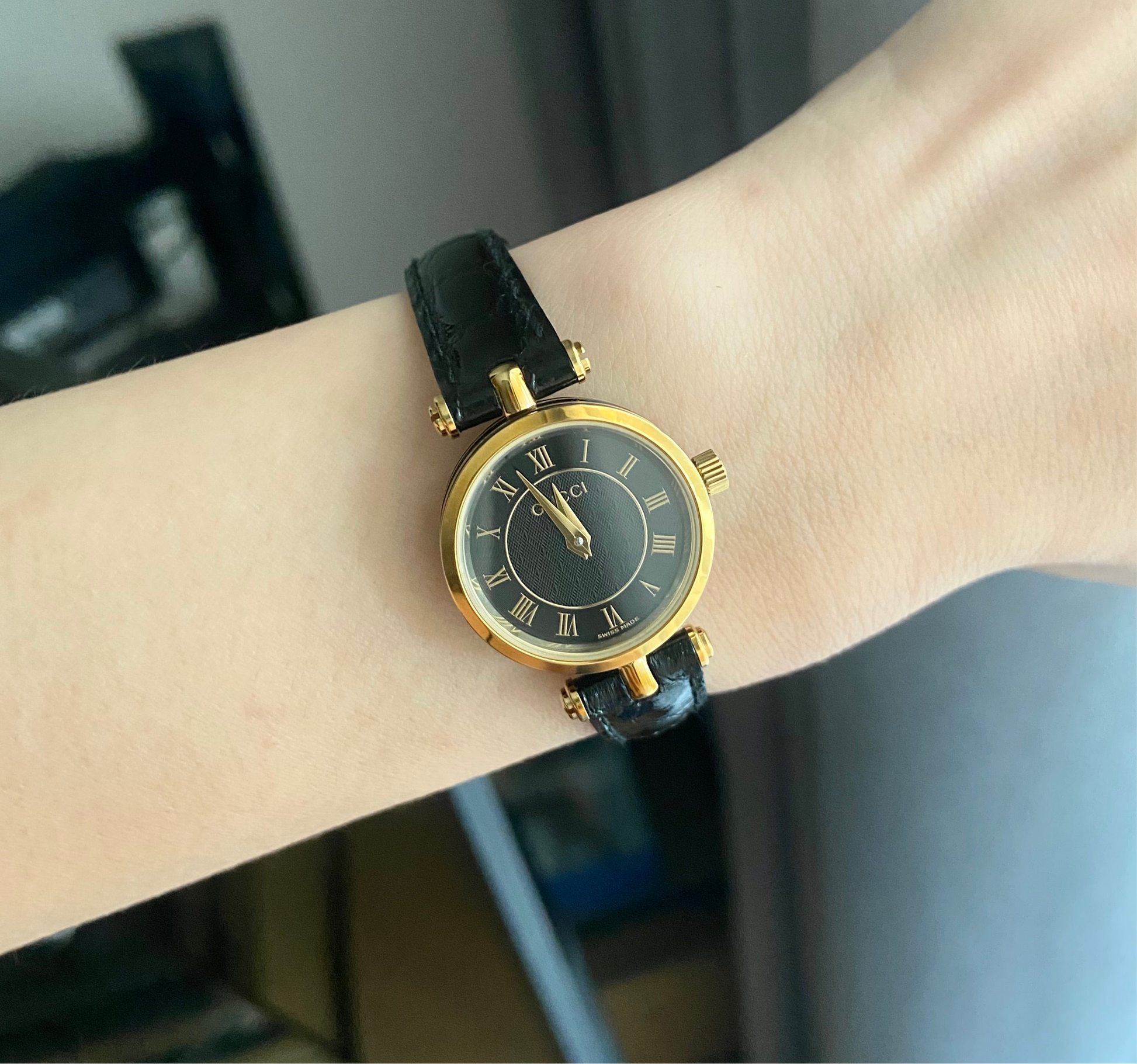 Dial: Black with Gucci texture in the middle with 2 gold tone hands.