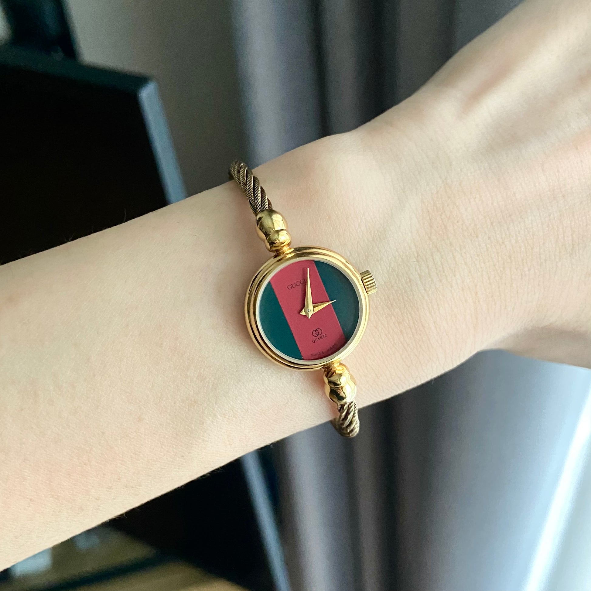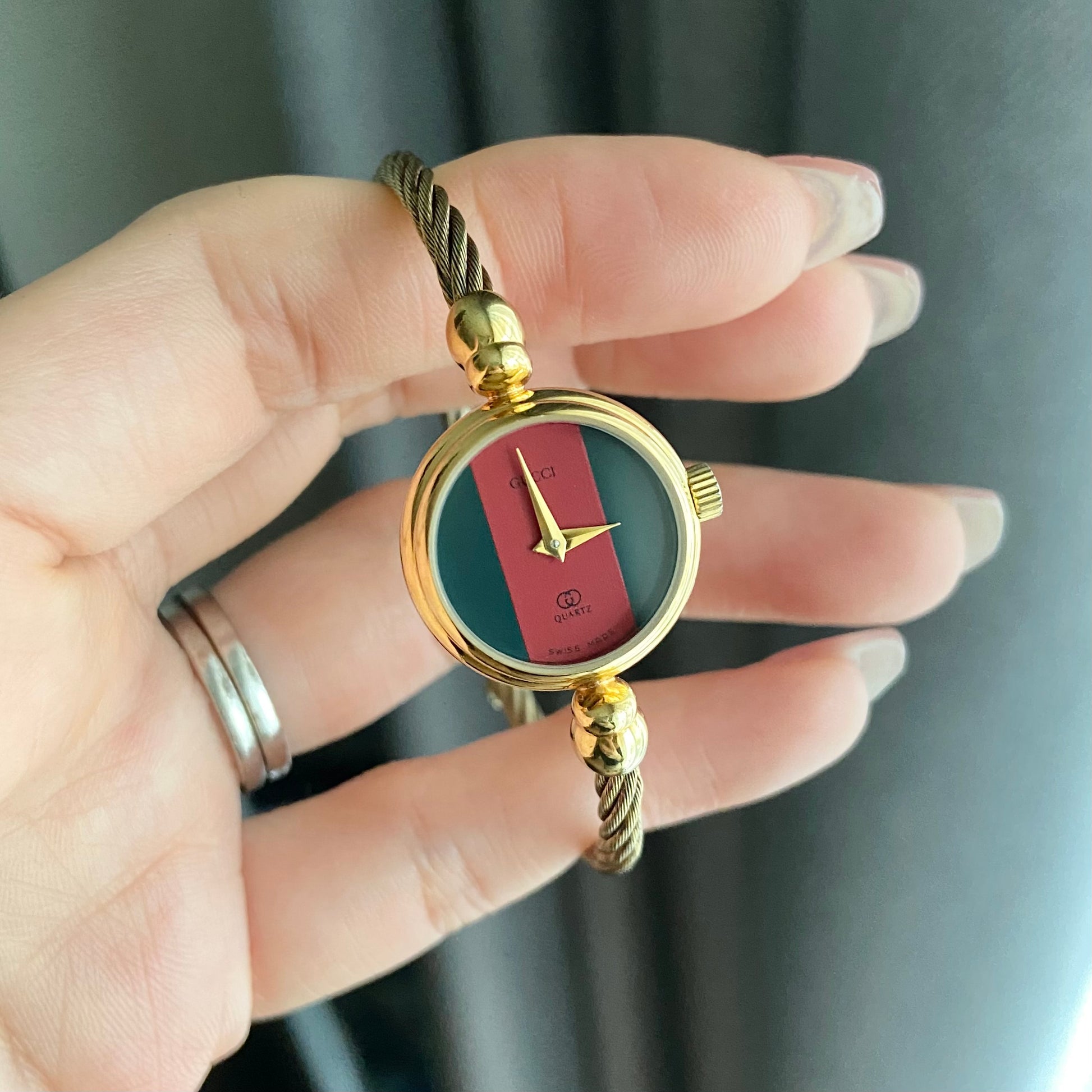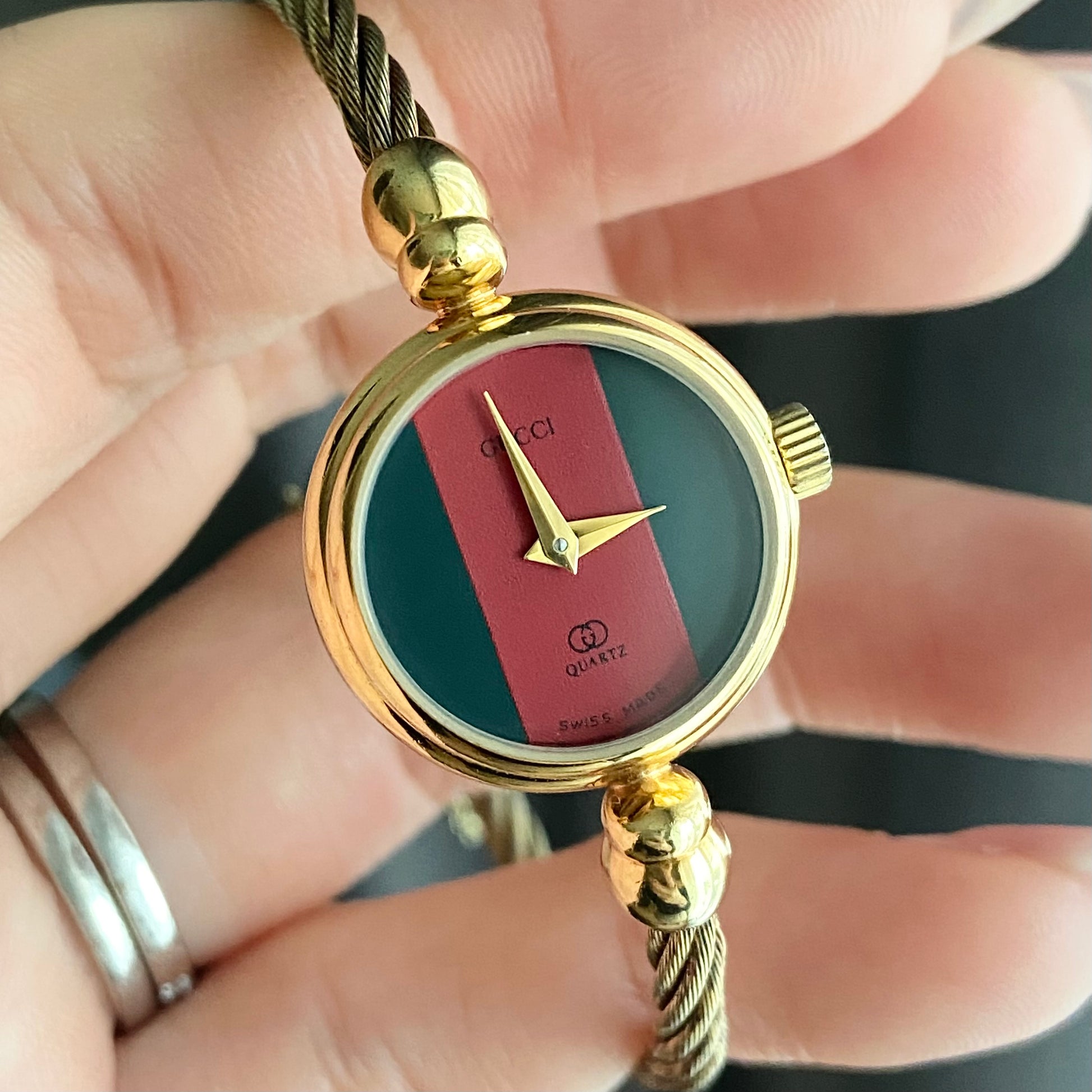 Dial: Green red green Gucci's signature color dial with 2 gold tone hands.