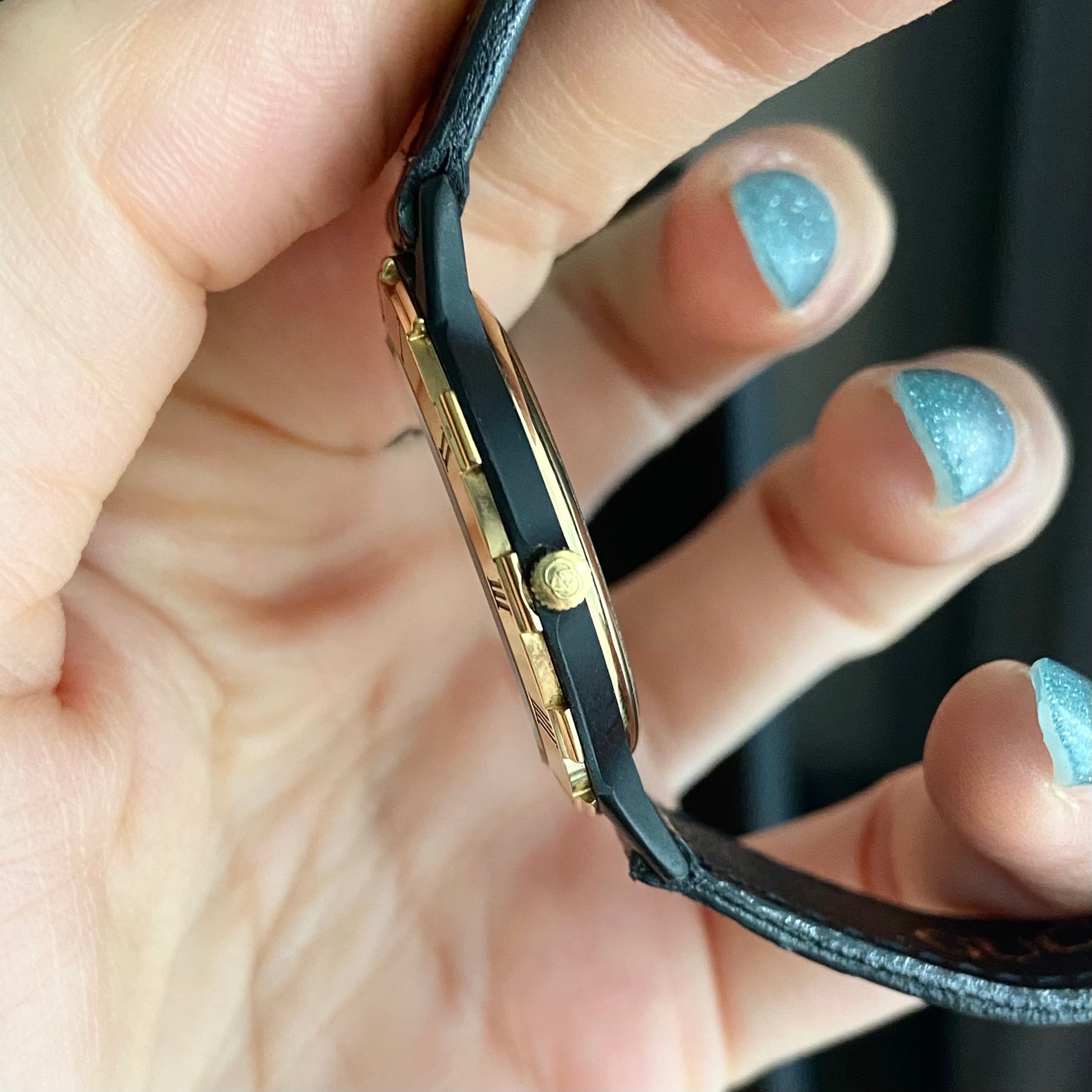 Dial: Black lacquered dial with 2 gold tone hands. Roman numerals.
