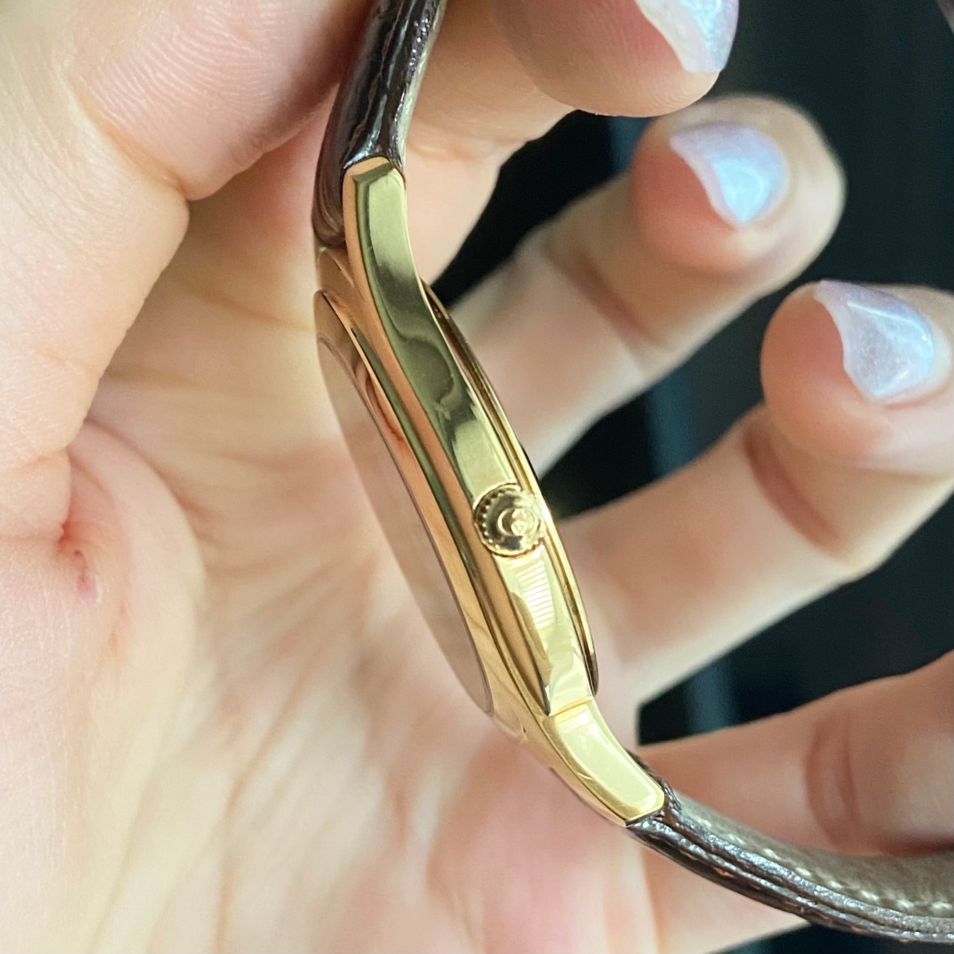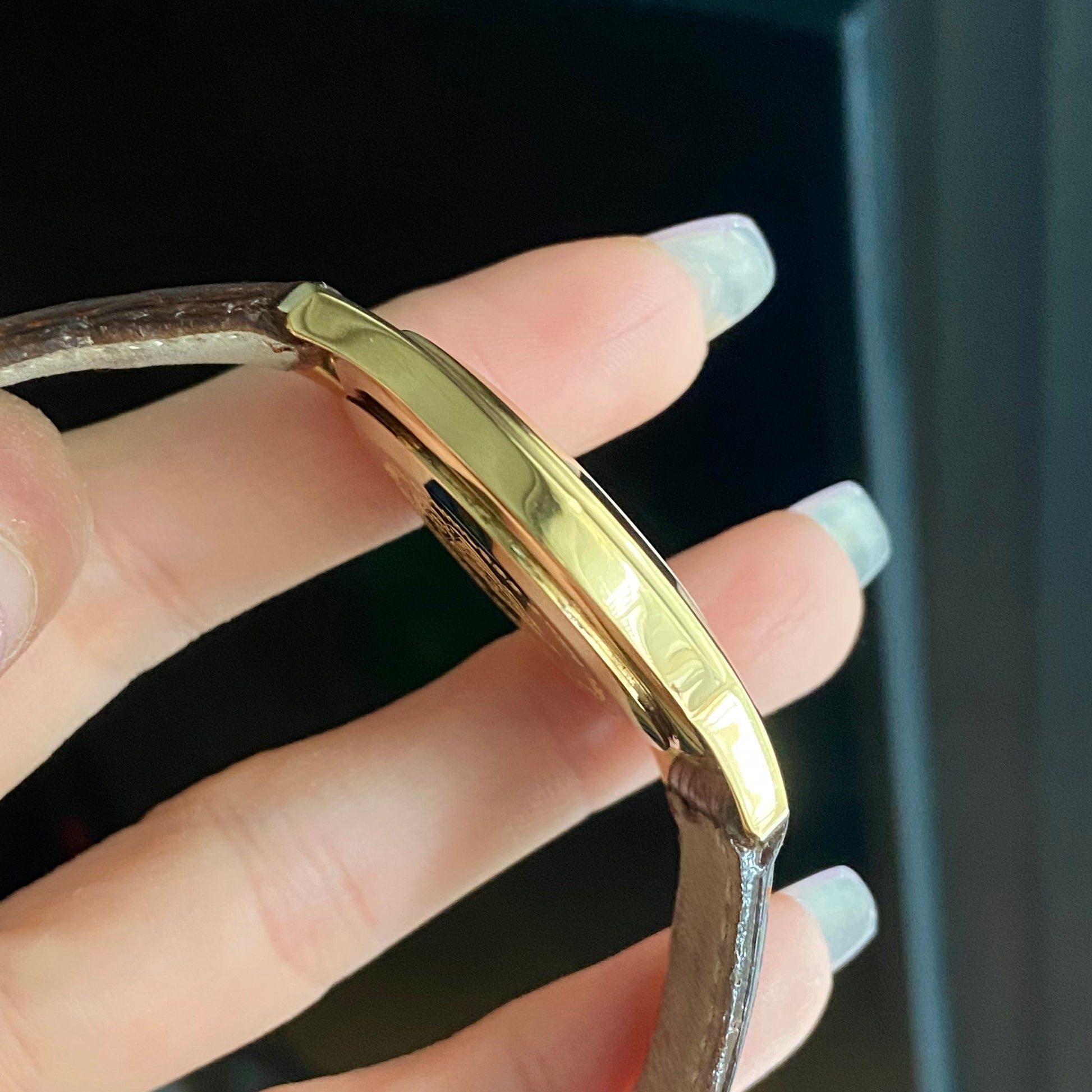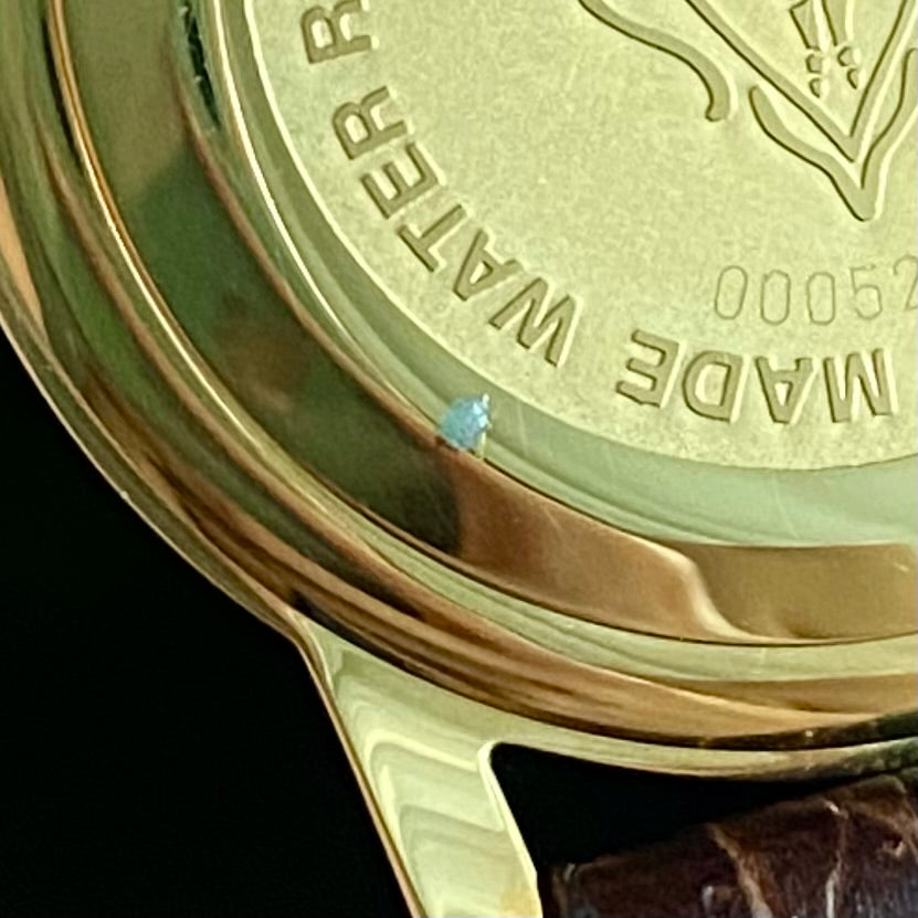 Condition: 90% it's really beautiful with almost no scratches. But there is a chipped part on the frame at the edge and a dot of gold plated scrubbed out at the back of the case.