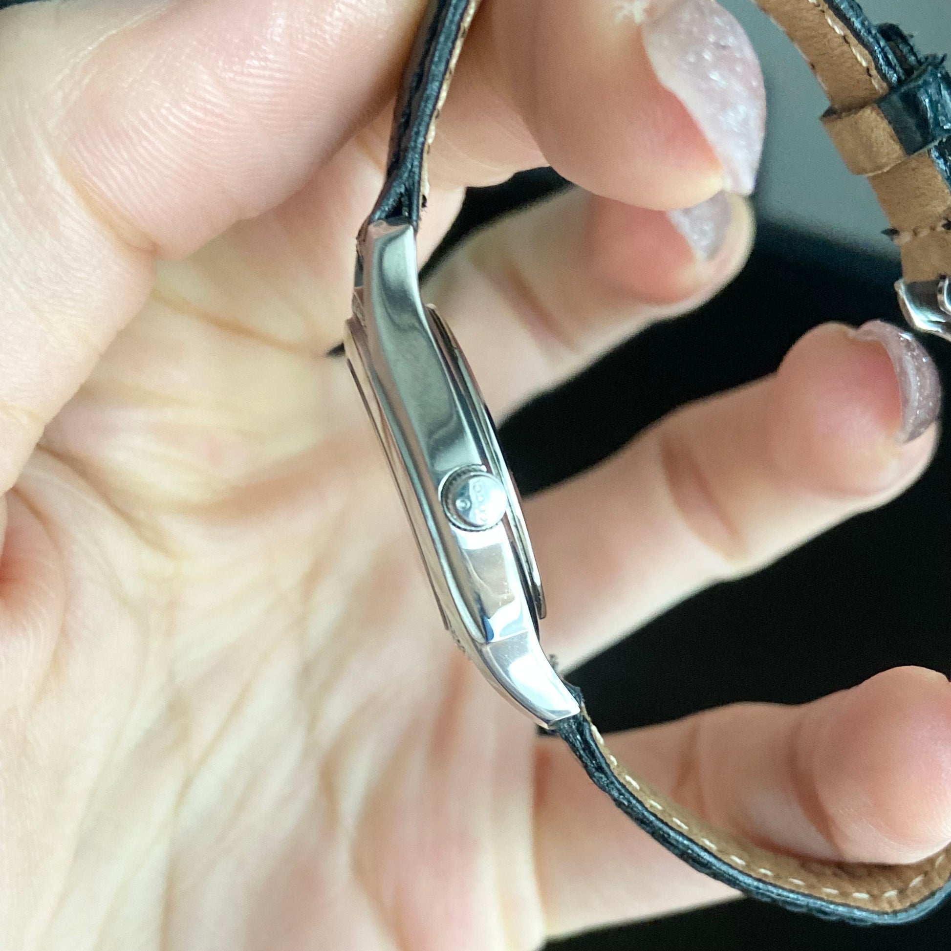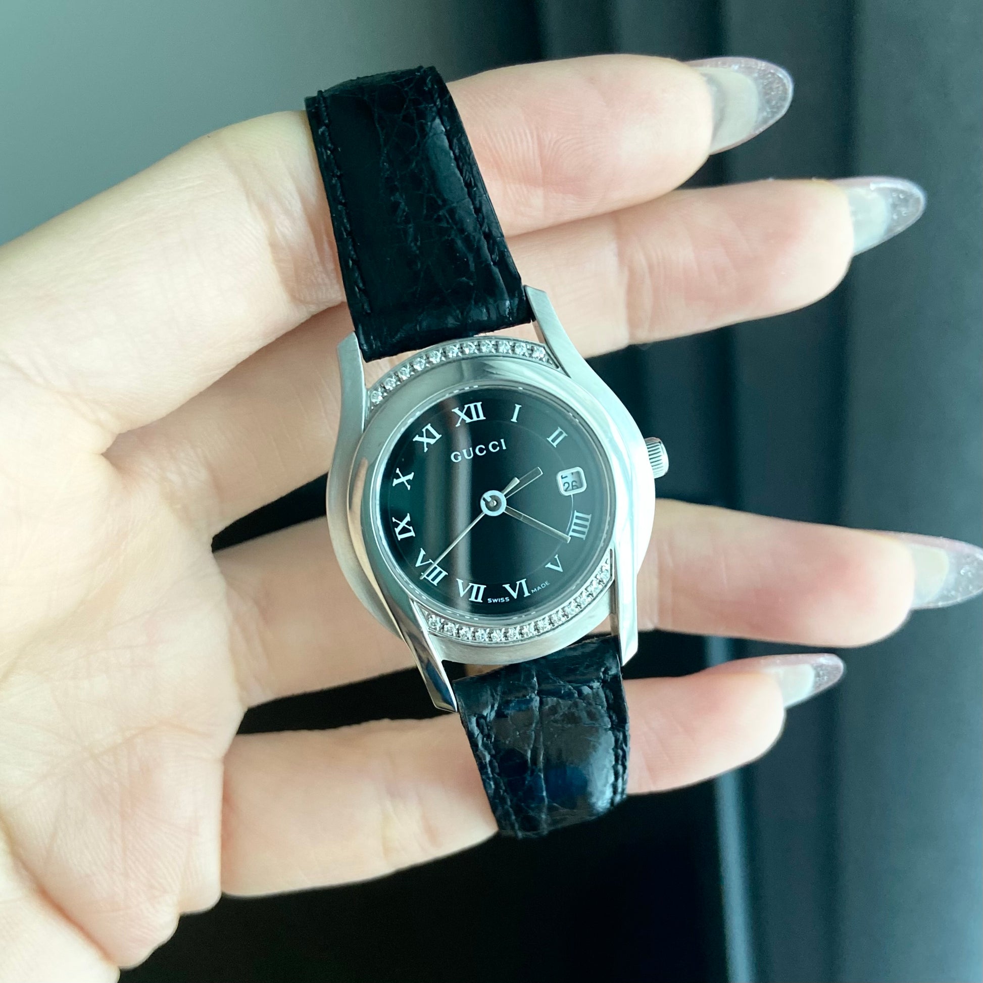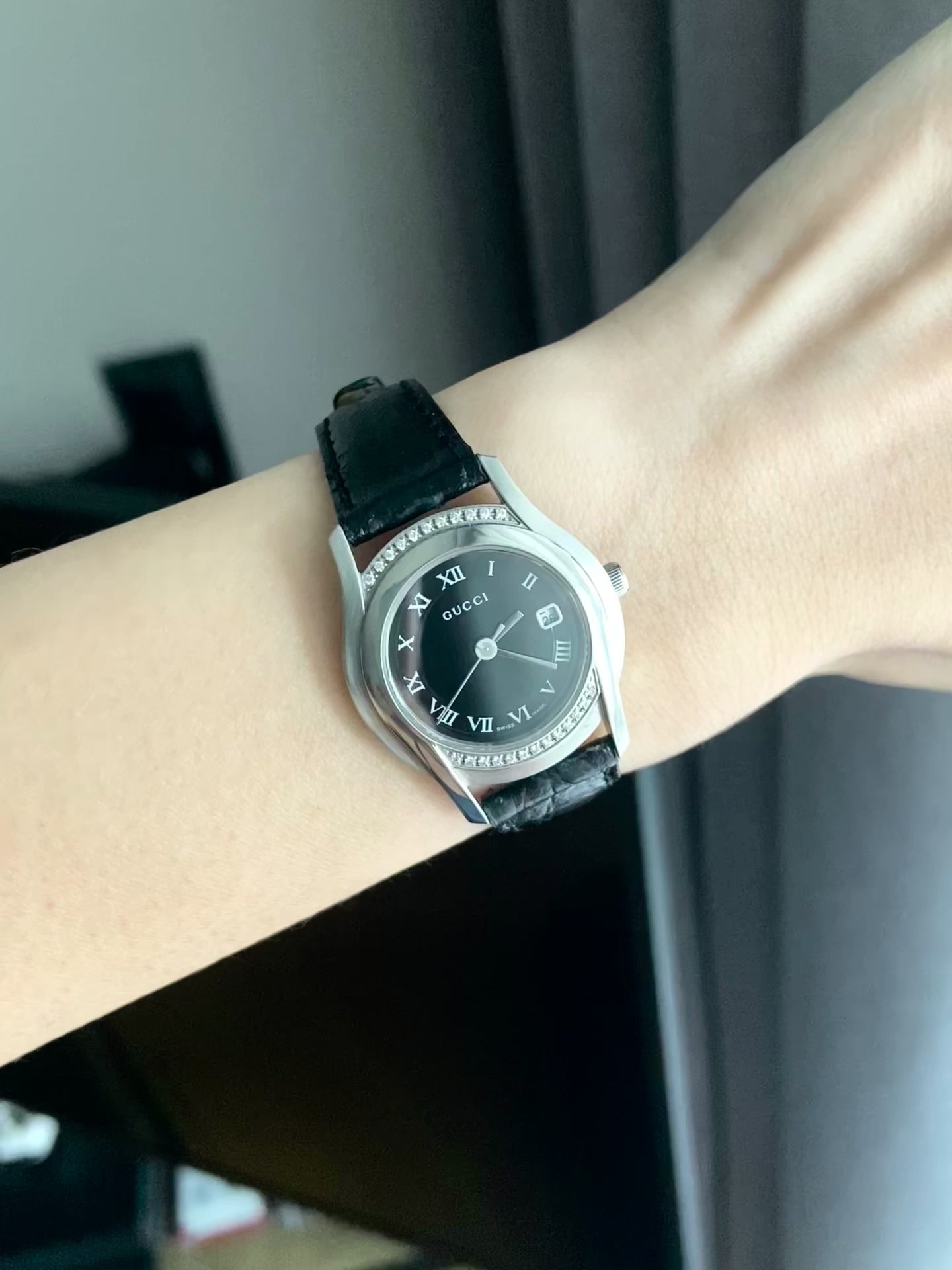 Dial: White MOP dial with 3 silver tone hands (G pinned for hands, super cute). Roman numerals. Date complication.