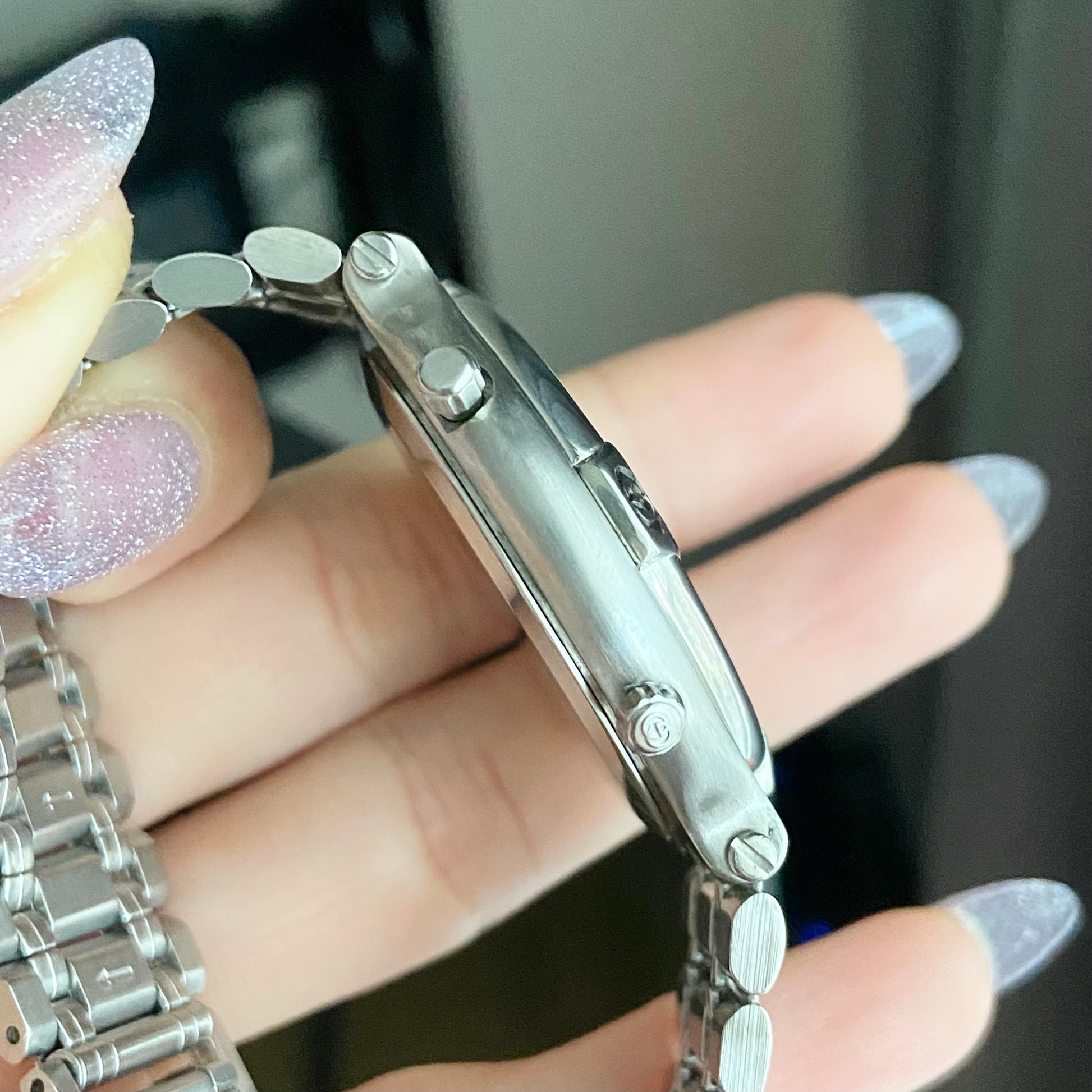 Dial: White dial with 3 silver tone hands and 3 subdials with 2 hands each (chronograph). Roman numerals.