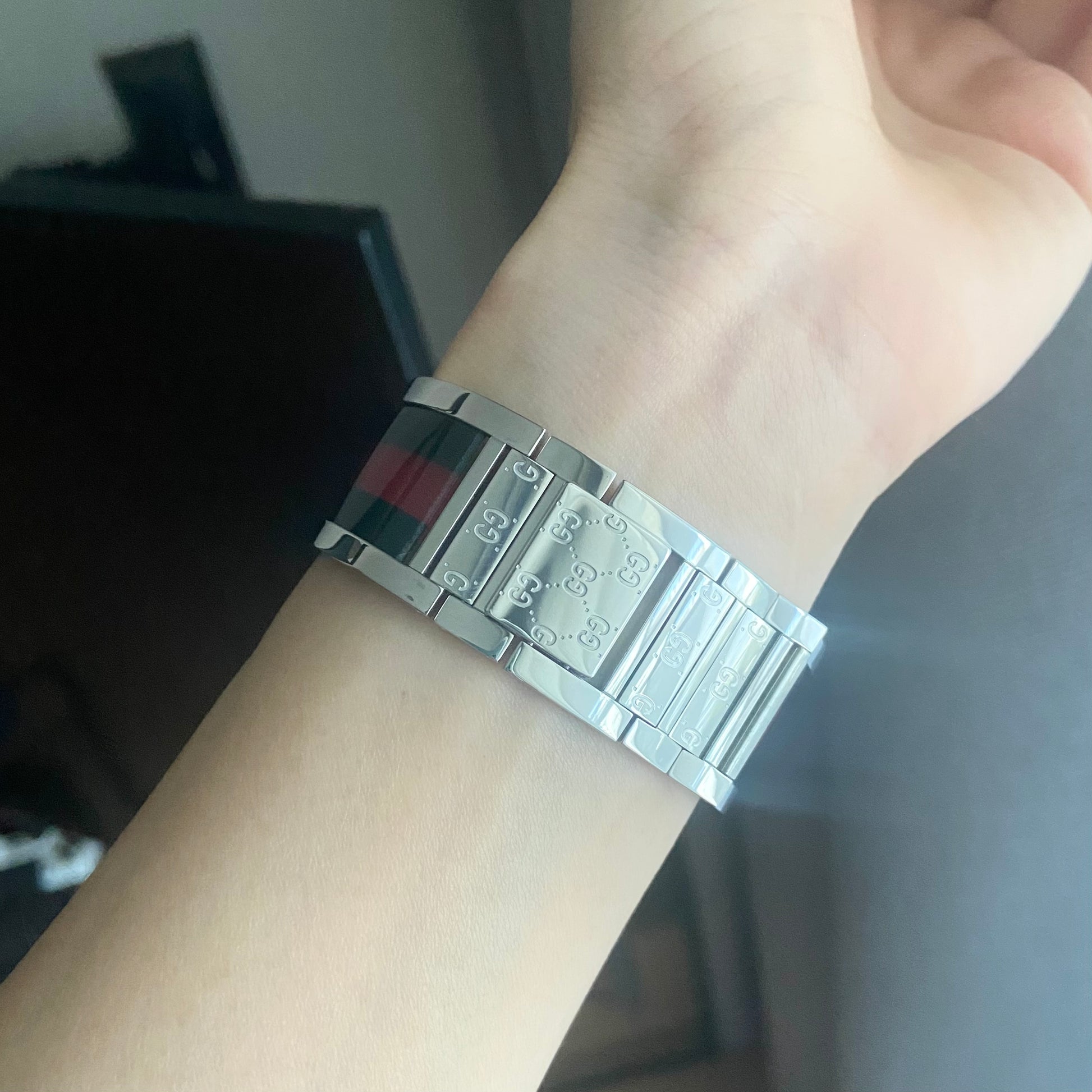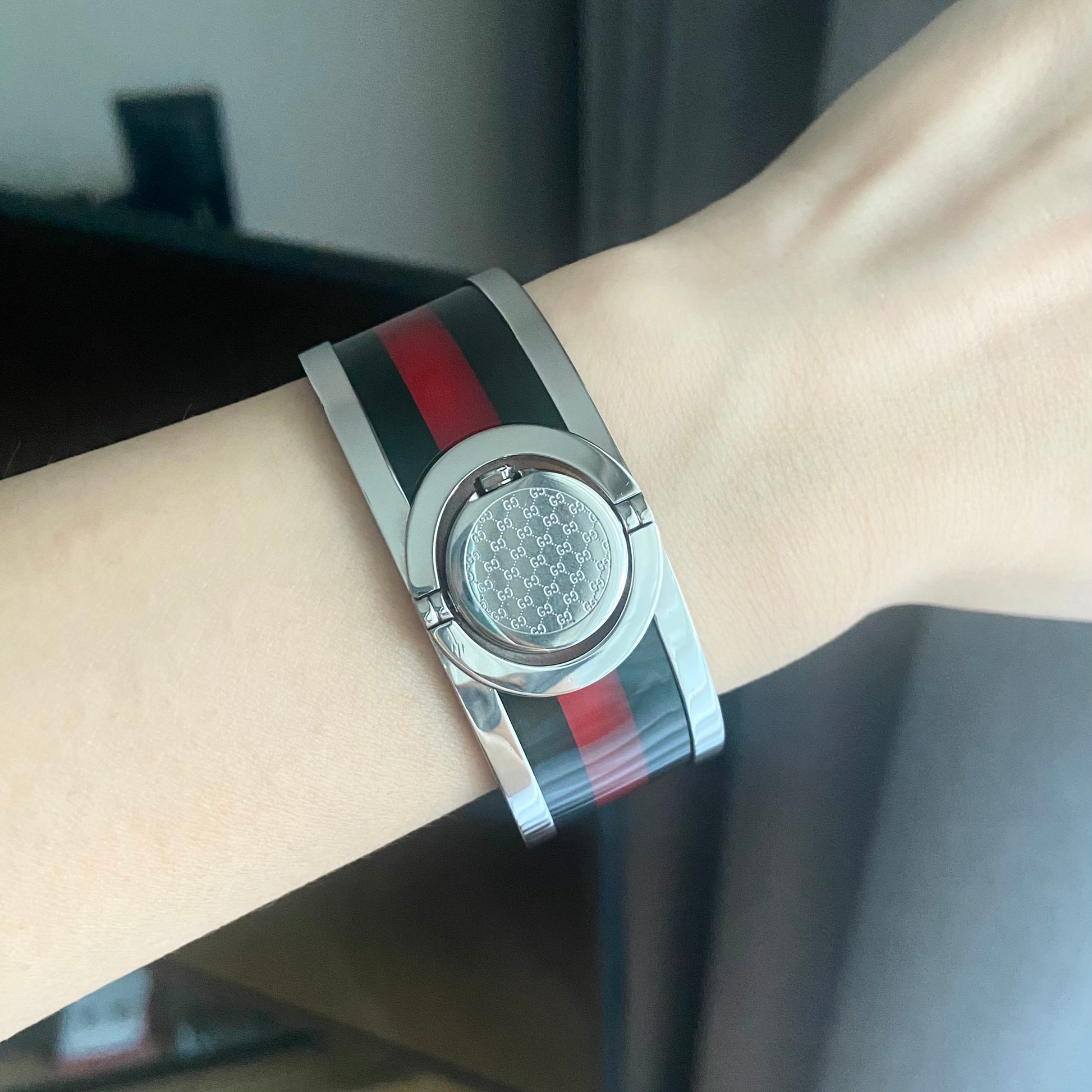 Case material: Stainless steel. Back of the case is Gucci pattern.