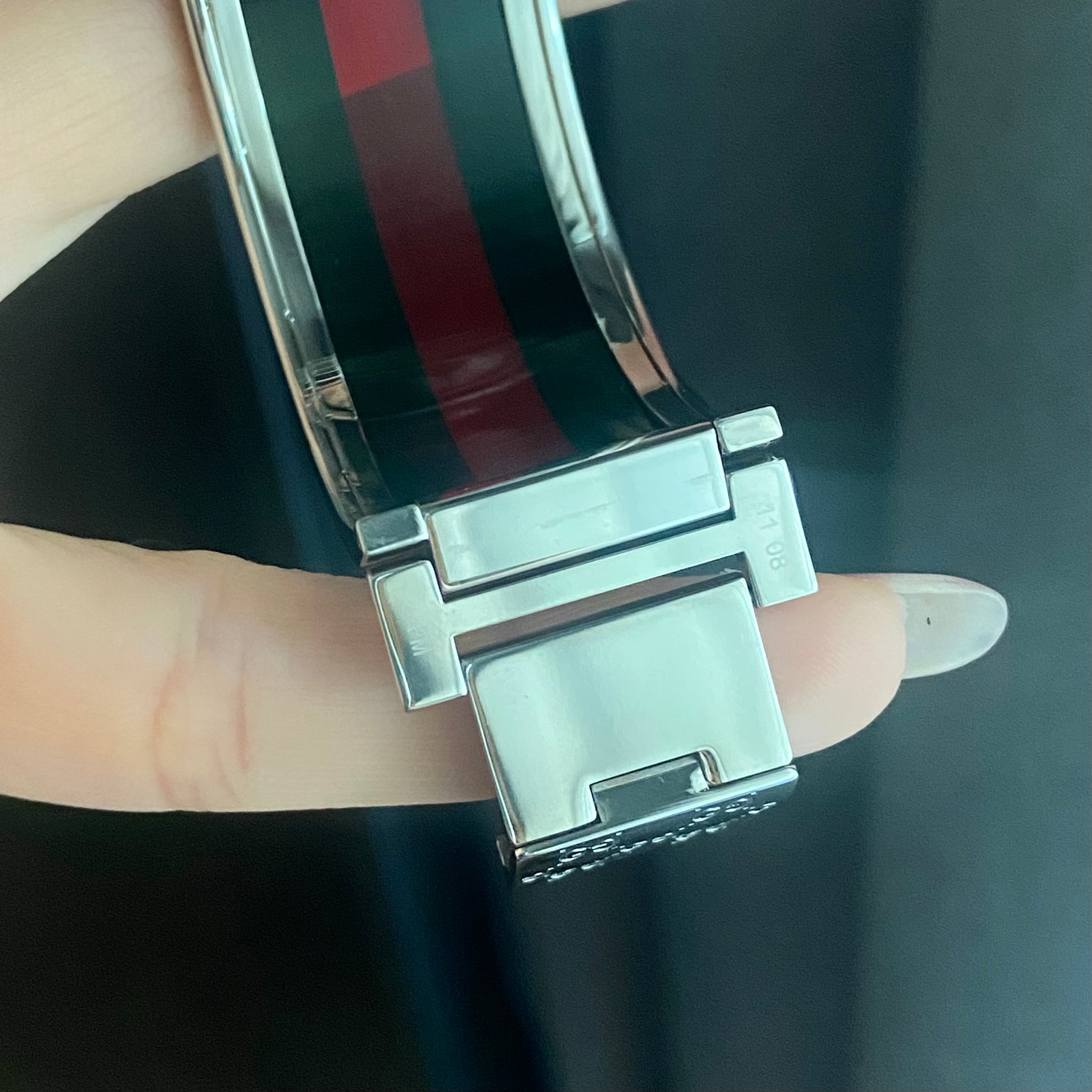 Strap material: Stainless steel/ green-red-green (Gucci color) transparent acrylic bracelet (acetate).