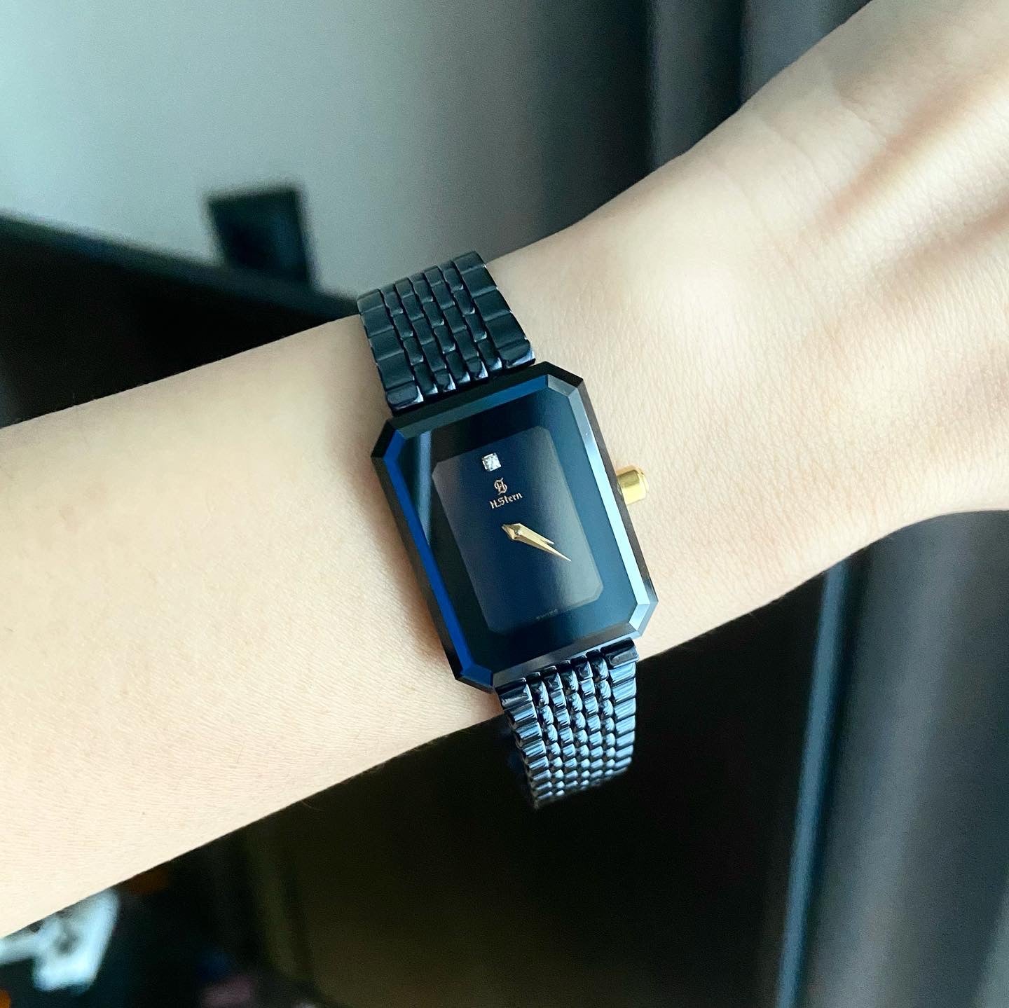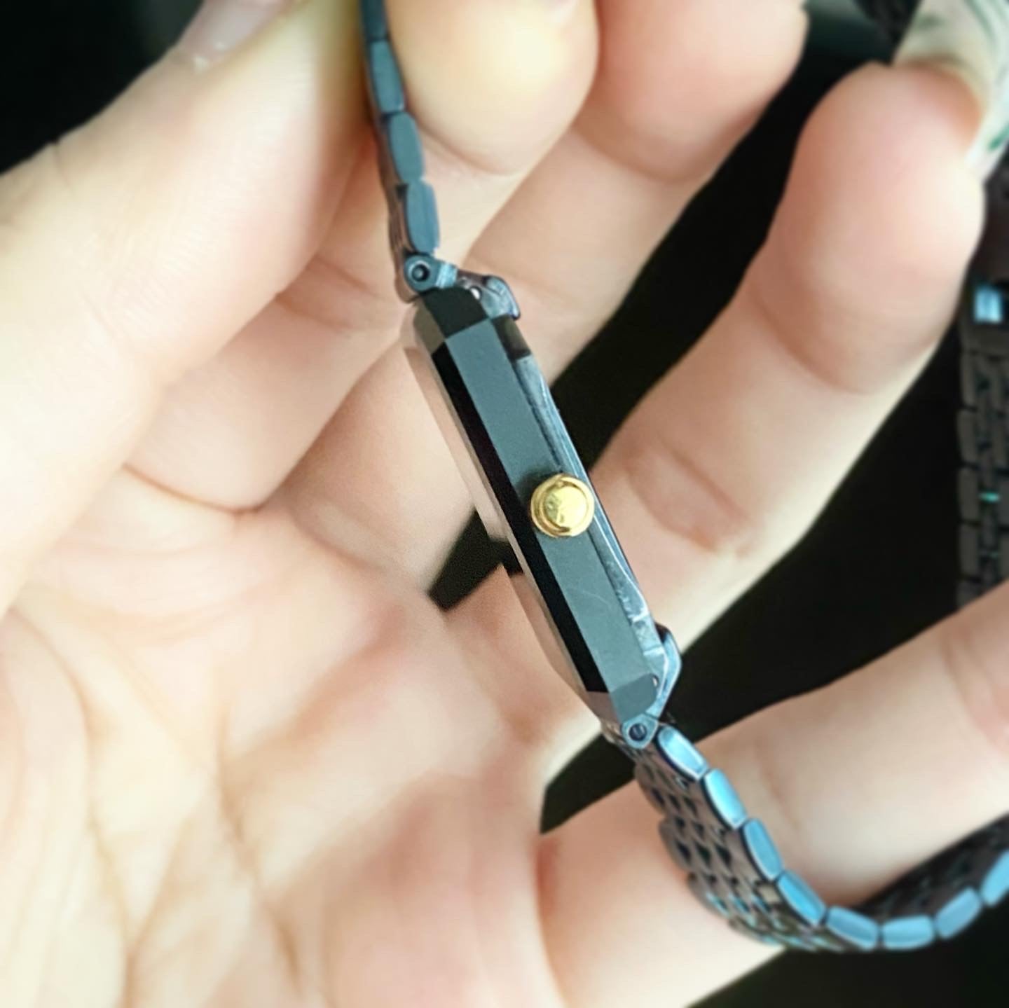 Dial: Lacquered dark bluish black dial with 2 gold tone hands. 1 Diamond index.