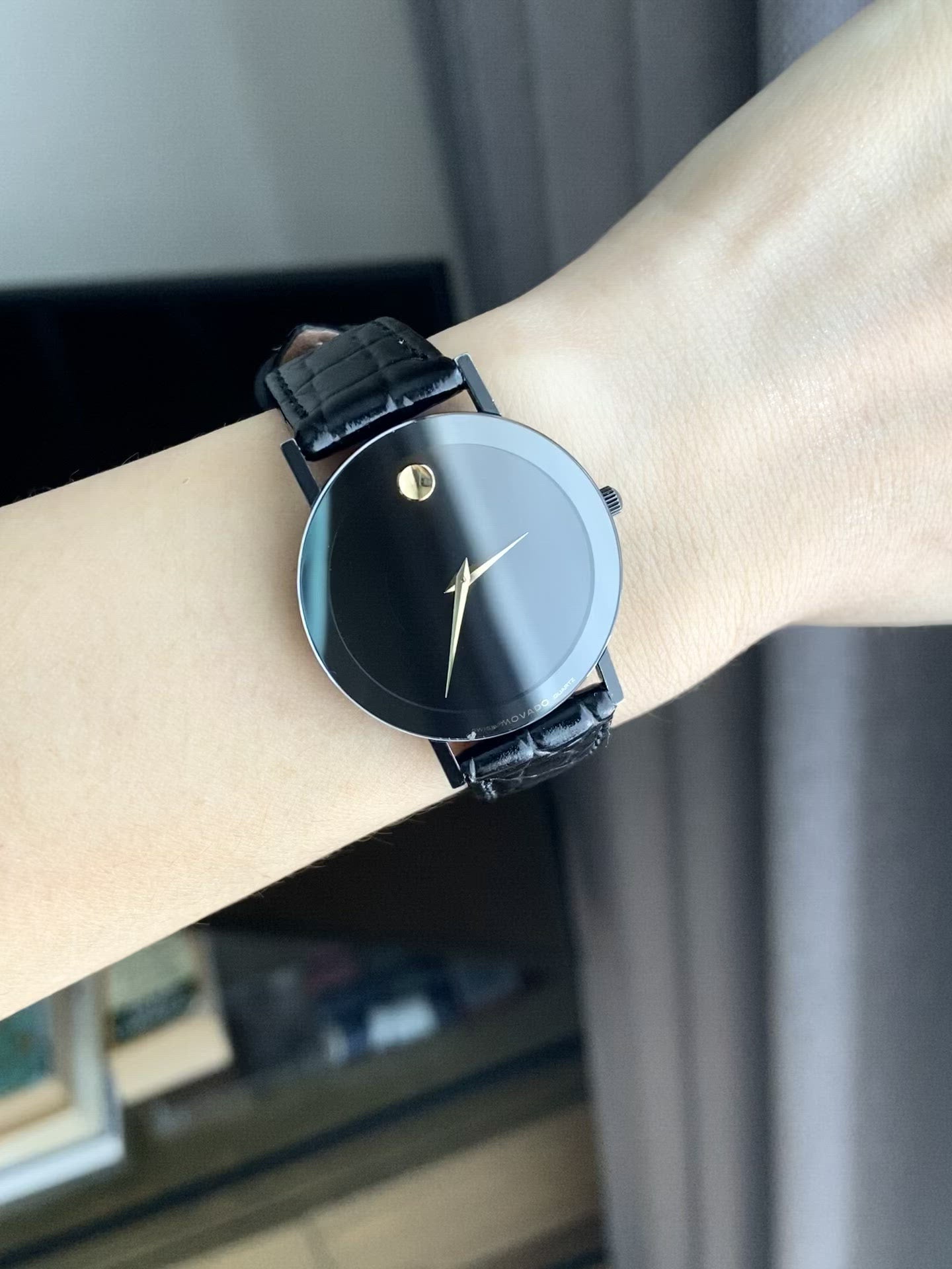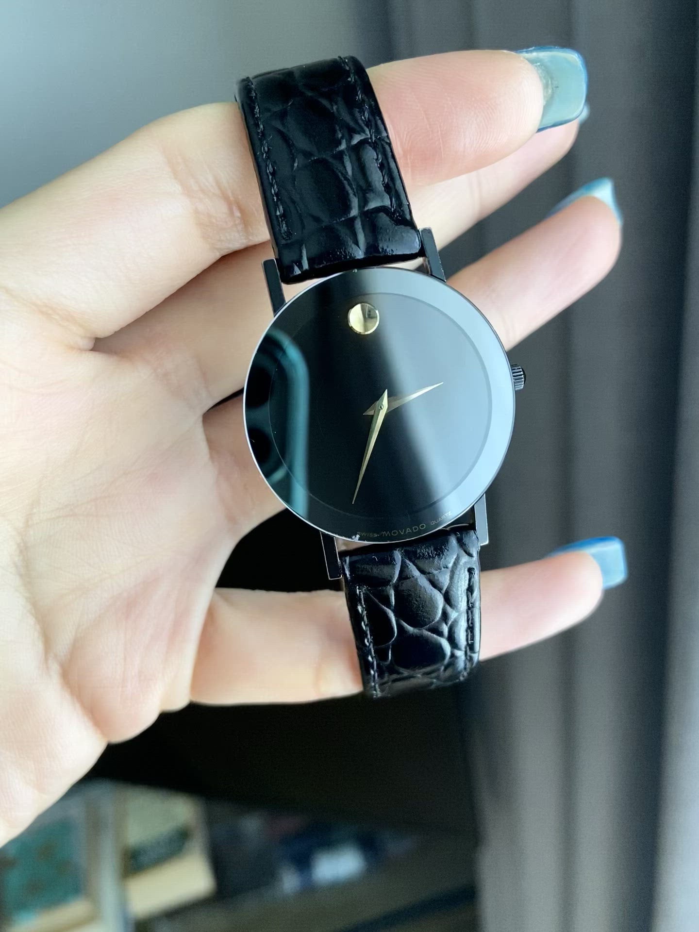 MOVADO Boysize 31mm(32รวม) หน้าปัดดำ 2เข็มทอง โลโก้แบรนด์ หลัก 12 เรียบหรูมาก กระจกกันรอย sapphire แท้เต็มเรือน ตัวเรือนรมดำ สวยมาก สายไม่เดิม เป็นสายหนังอย่างดี ลายสวยมาก สายยาว 17.5-21cm (เจาะเพิ่มได้) บัคเคิลเดิม Swiss made สภาพรวม 90%++ สวยหรูมาก กระจกมีรอยบิ่นขอบล่างตรง Swiss (ดูรูปแรก) ตำหนิไม่มีผลต่อการใช้งานเลย มีกล่องใส่แทนให้อย่างดี ยี่ห้อนี้หรูมาก สวยมาก เรือนบางมาก 🖤🖤•SALE 7,900฿•
