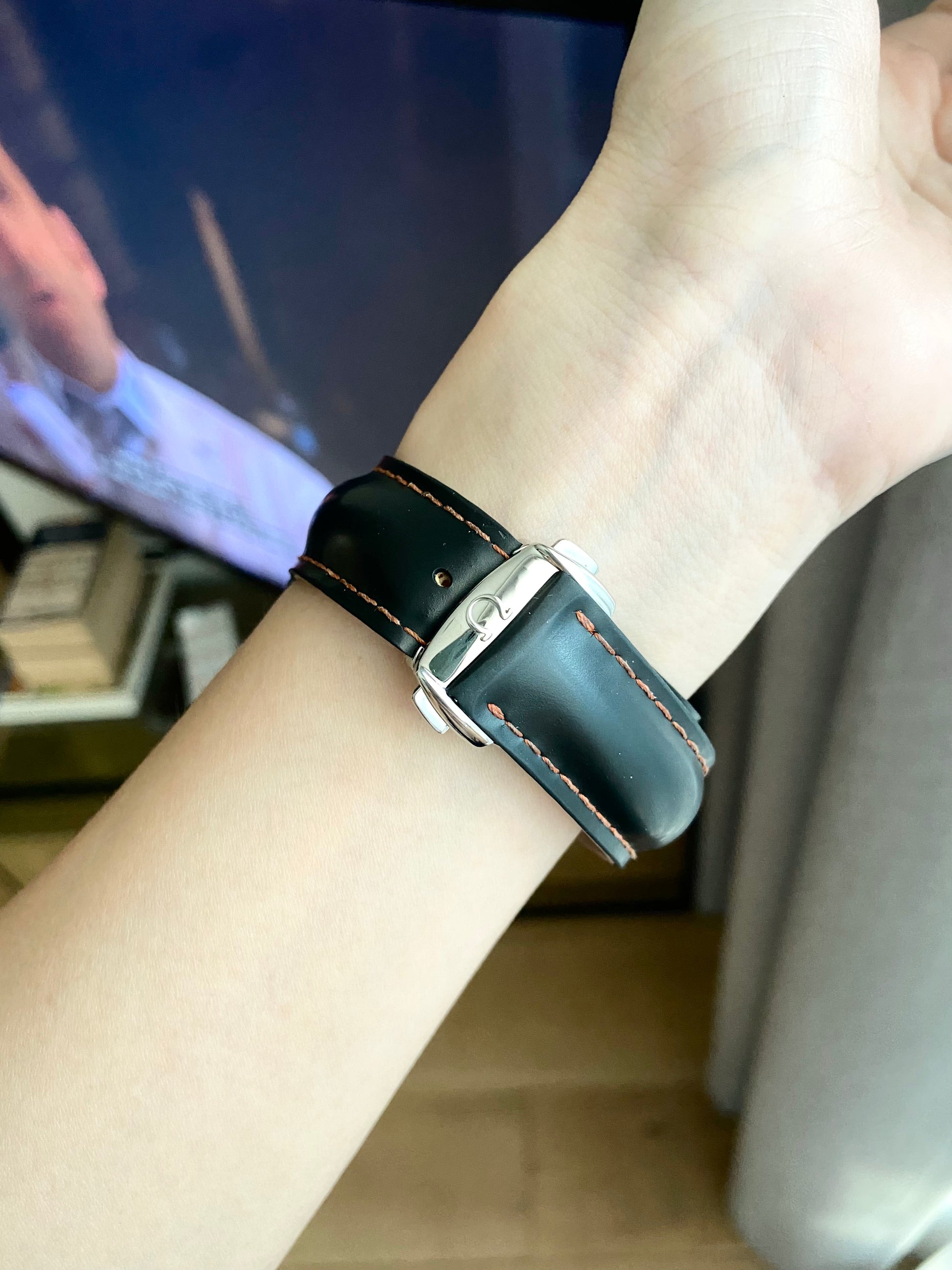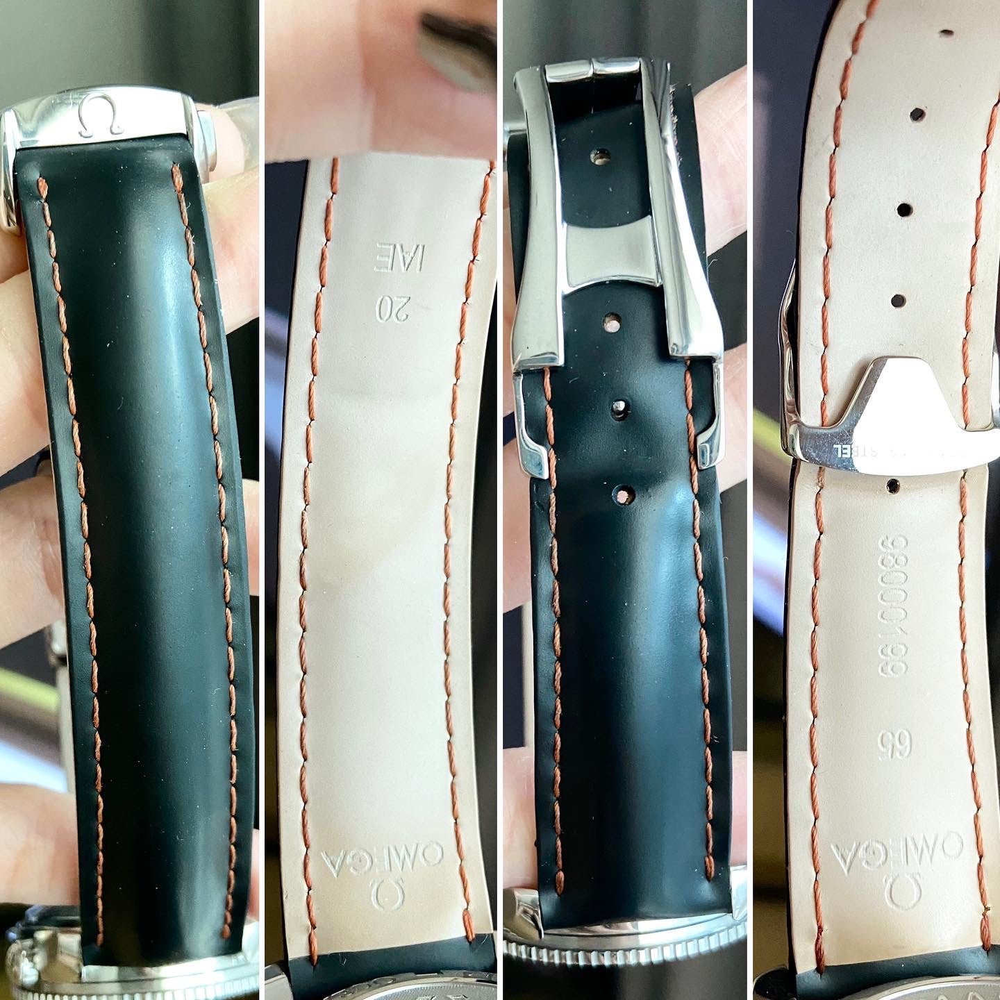 Strap: Black rubber strap with orange thread. Foldover clasp