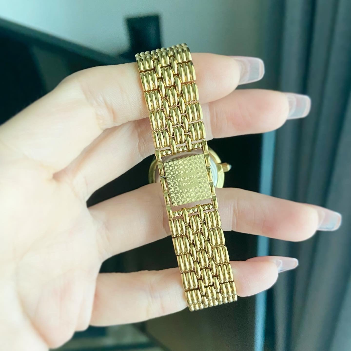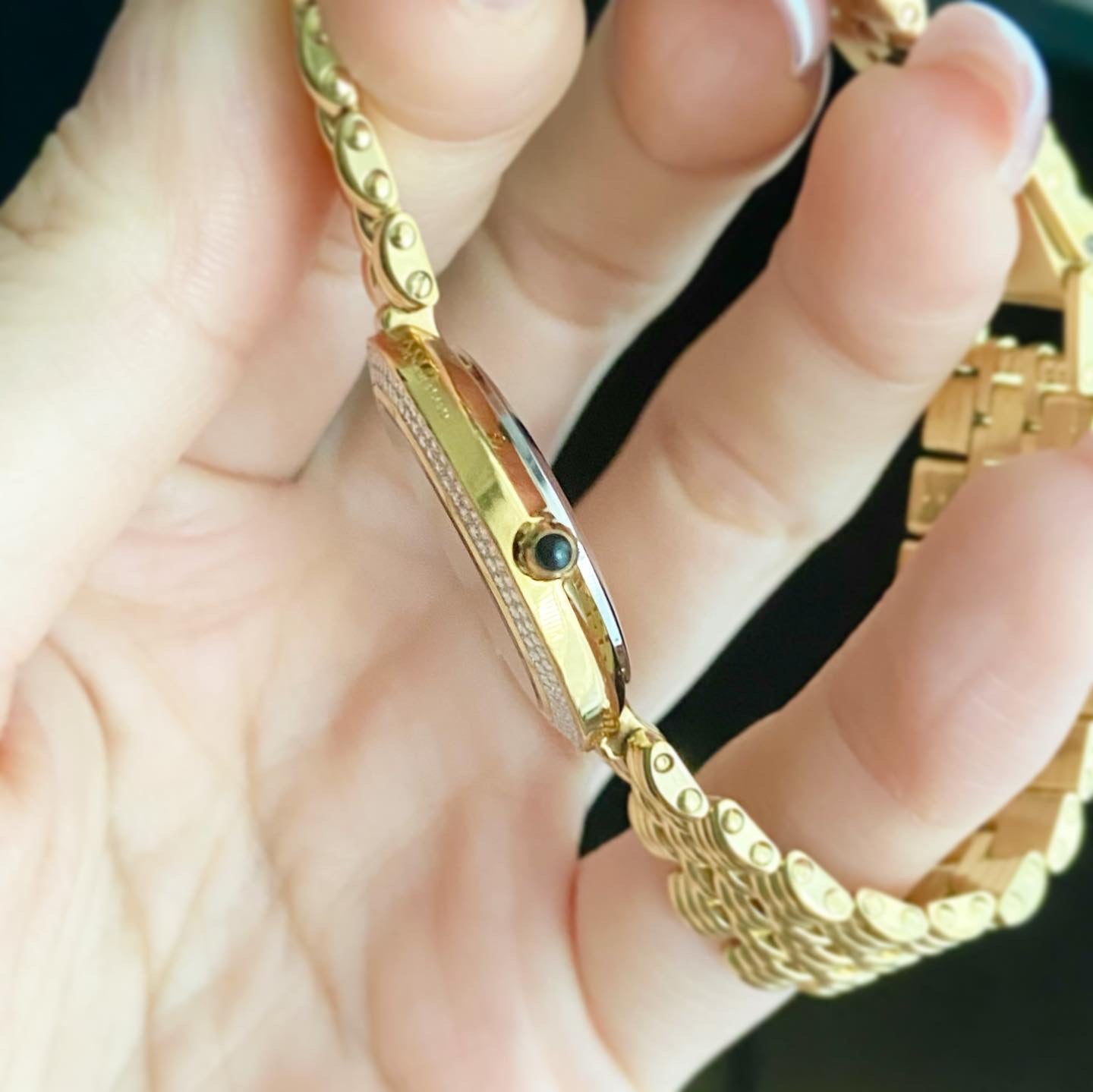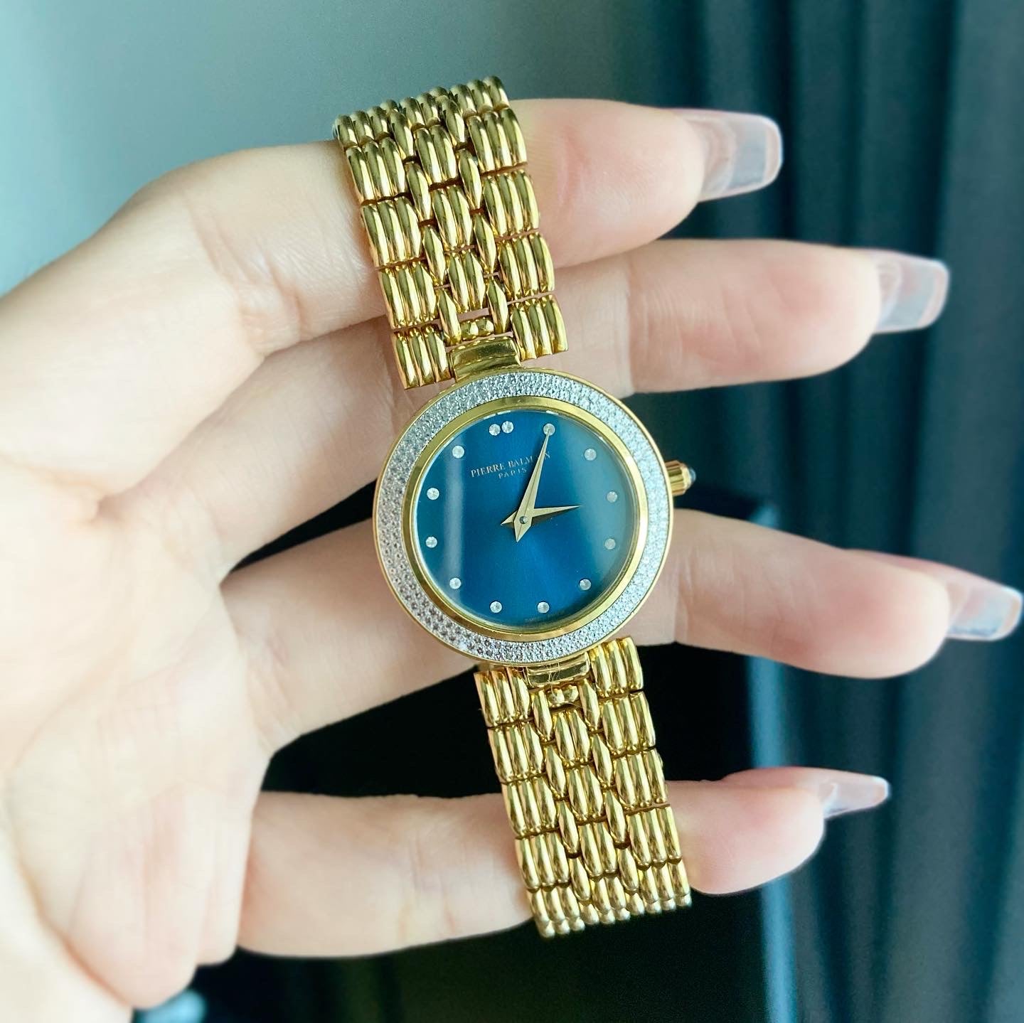 Dial: Blue dial with 2 gold tone hands. Rhinstone indices.
