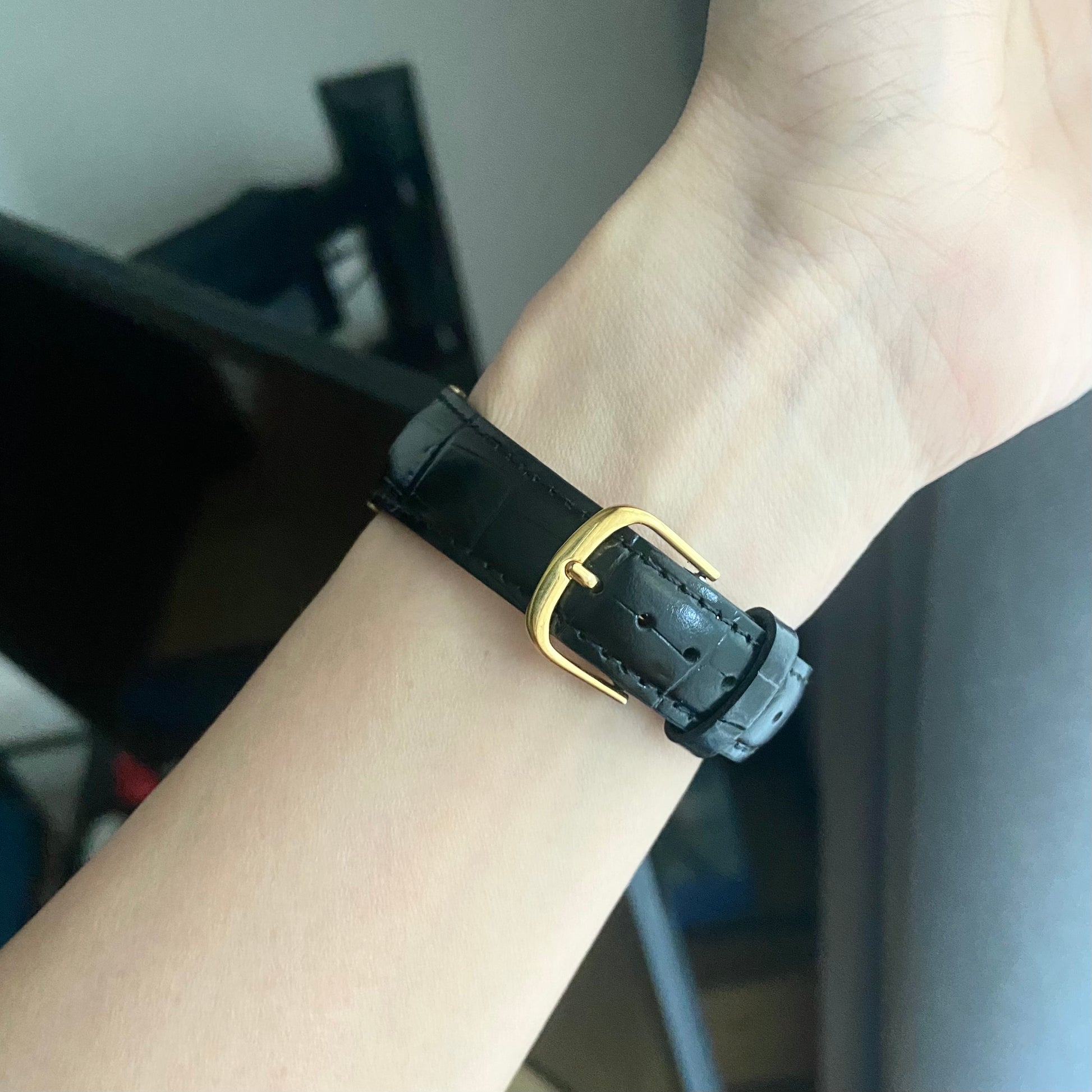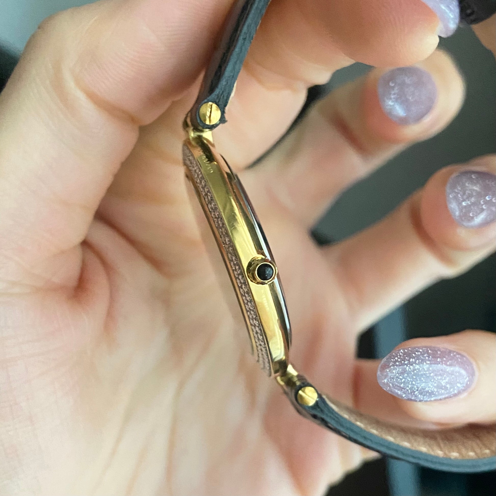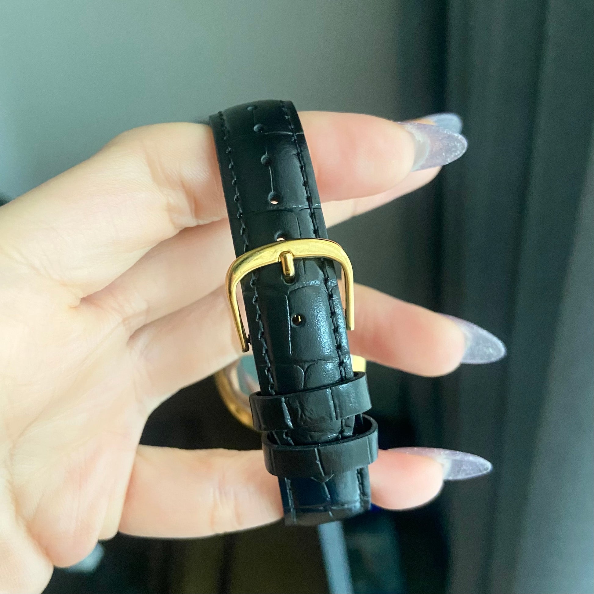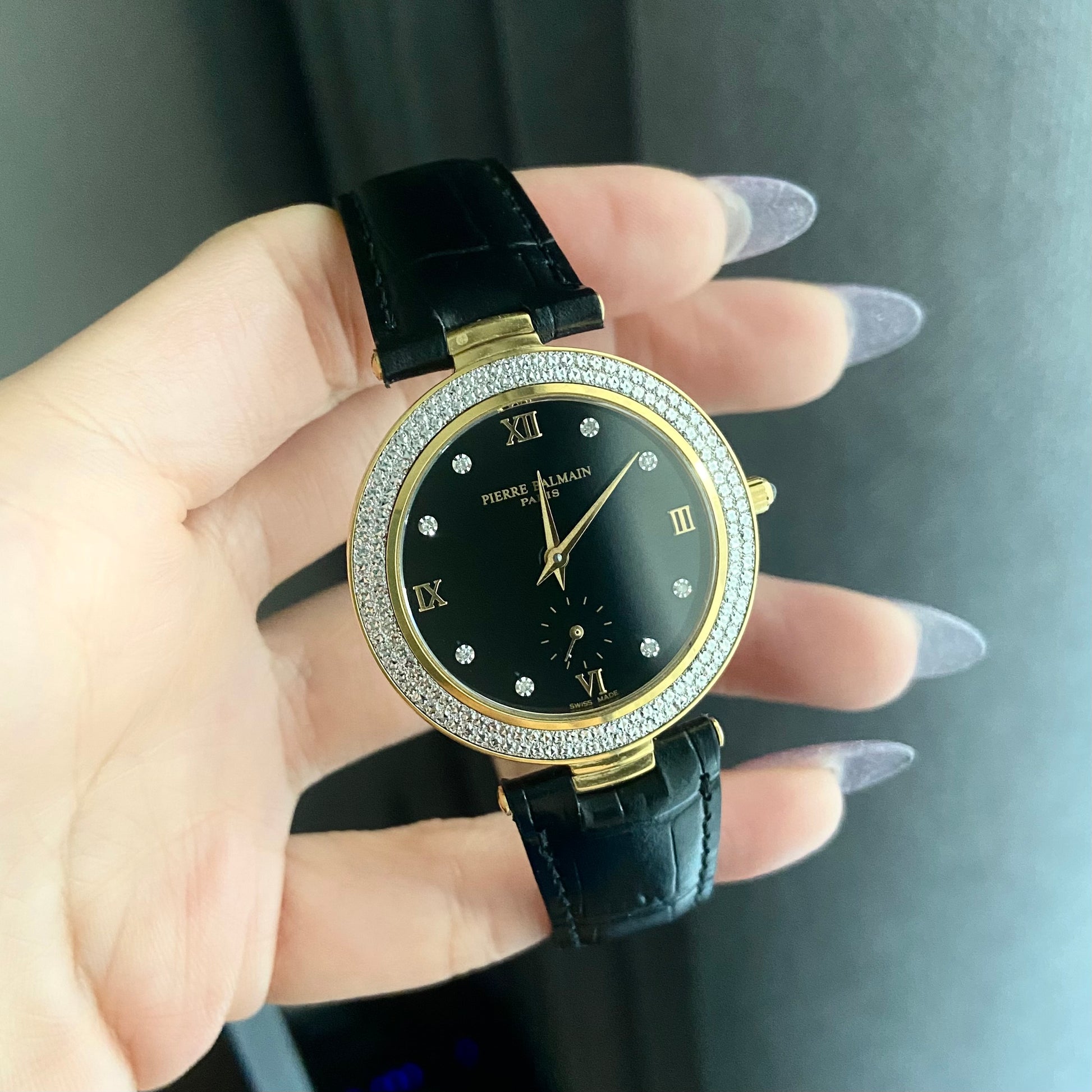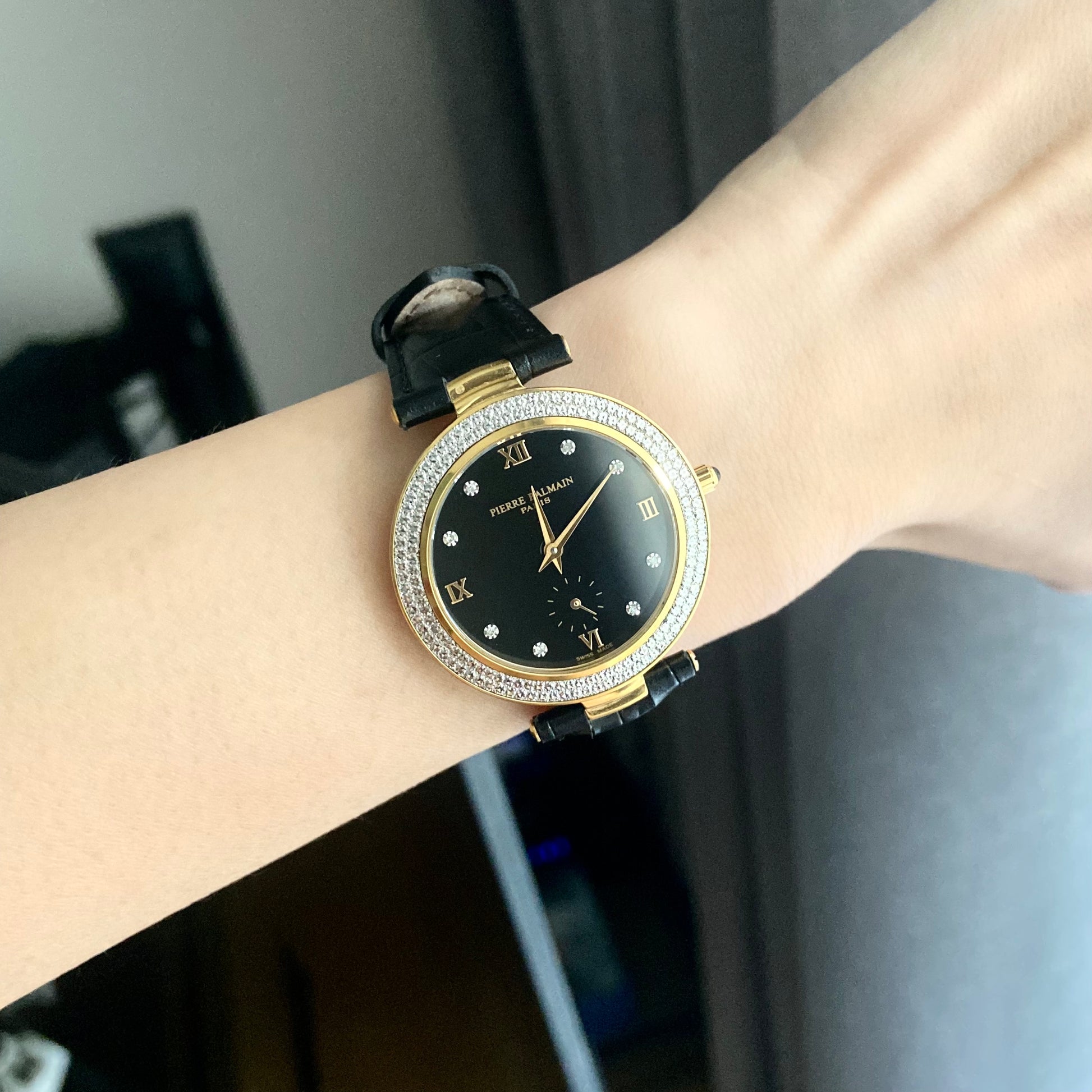 Dial: Black lacquered dial with 2 gold tone hands. Rhinestones with Roman indices.