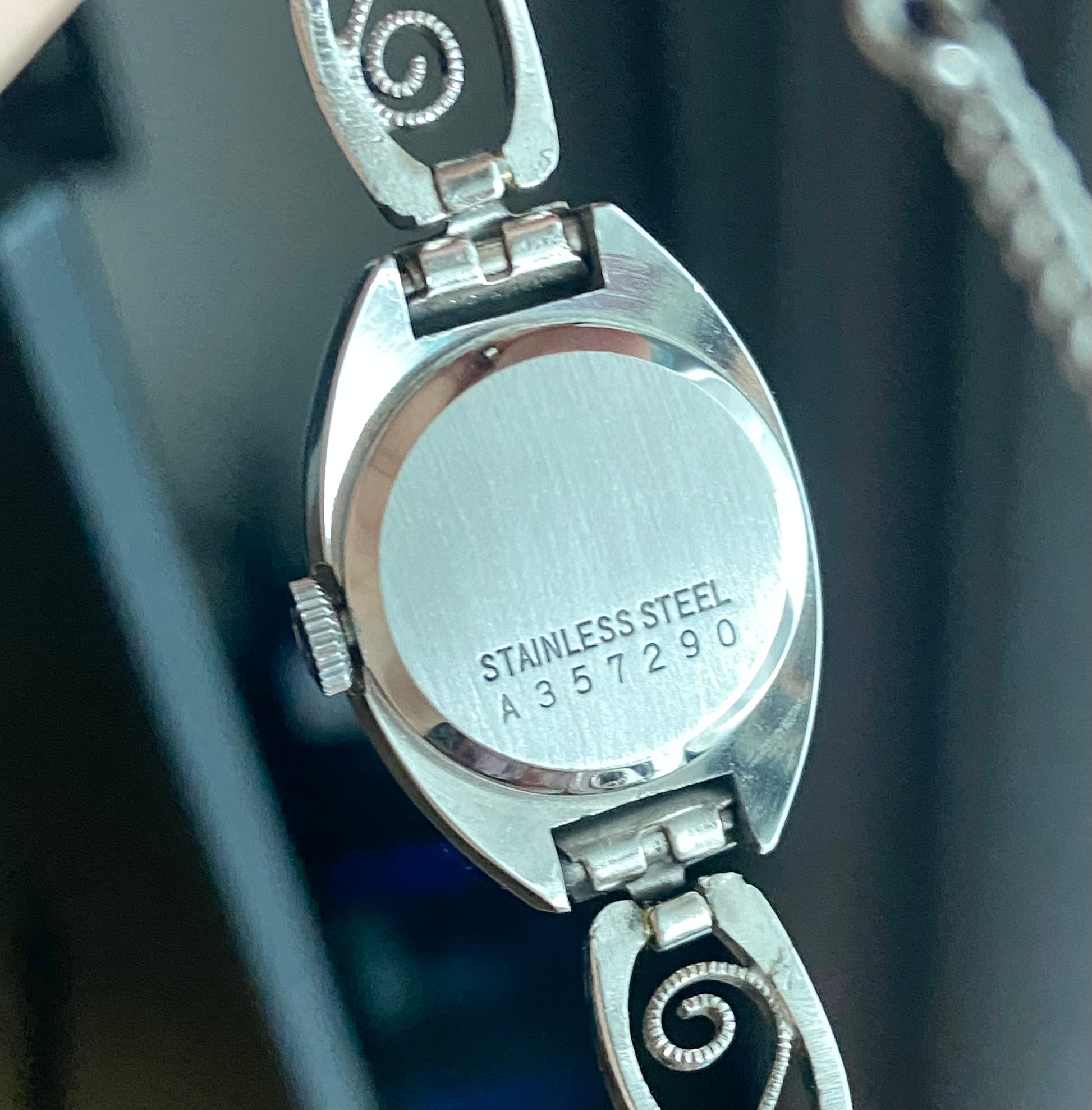 Dial: Silver tone dial with 2 silver tone hands, and stick markers.