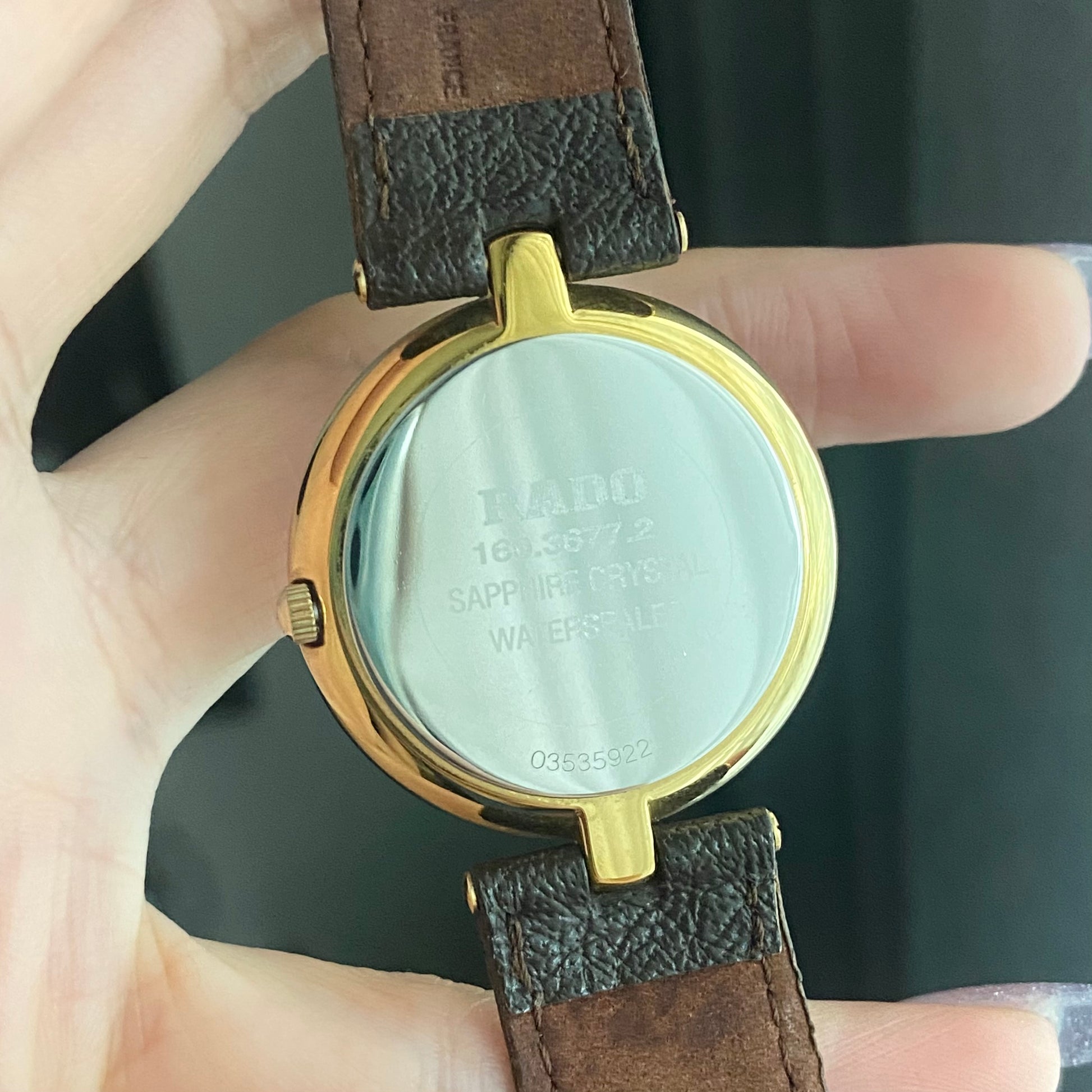 Condition: 80%++ beautiful. There marks under the glass around the edge(on gold frame under the glass). There are minor scratches on some part of the case. The leather is used. Inner leather is darken.