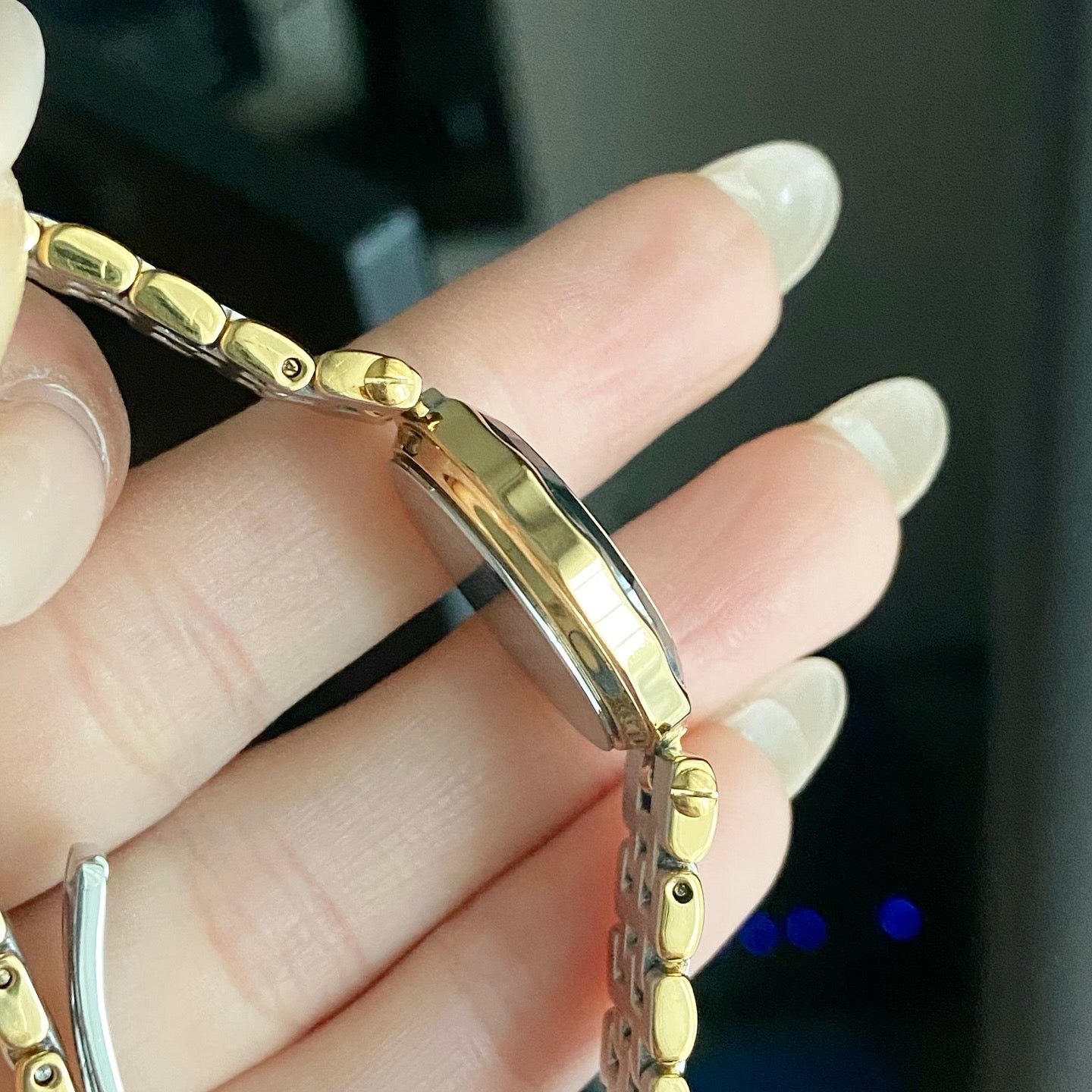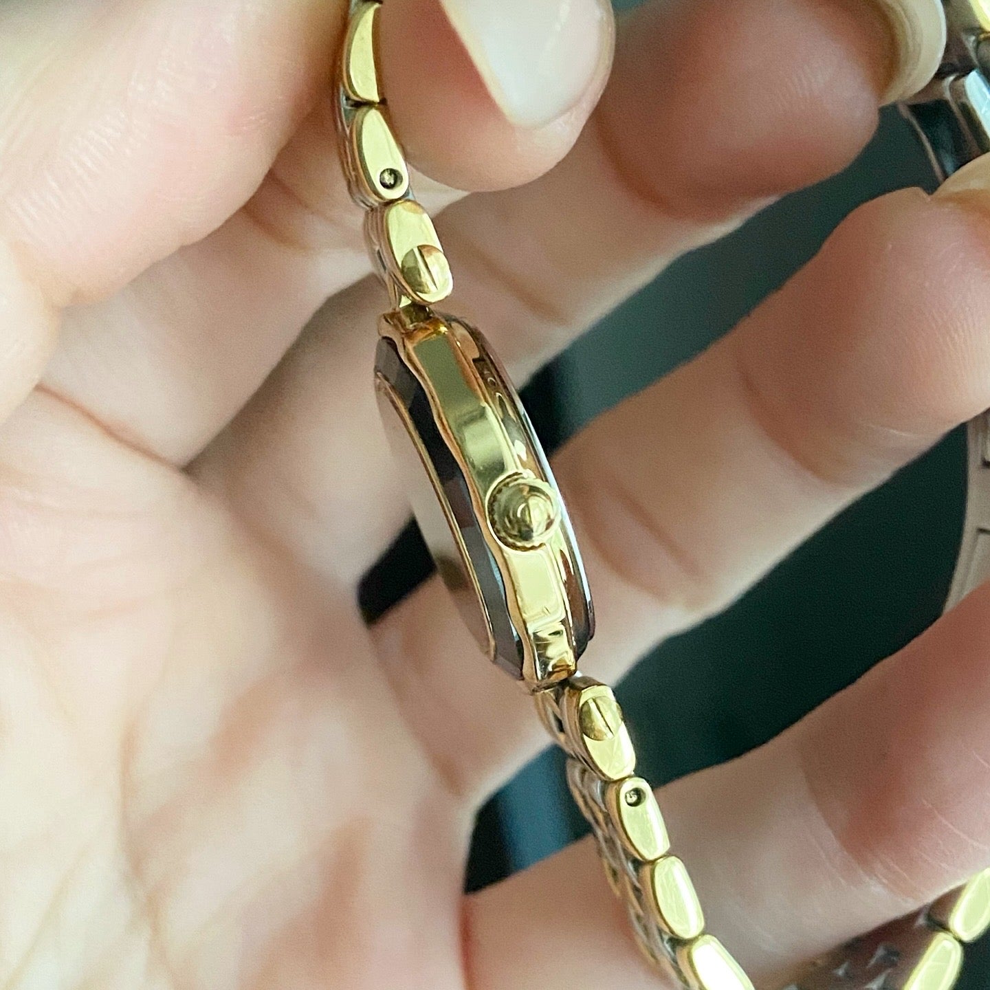 Dial: Brushed shimmered gold tone dial with 2 gold tone hands.