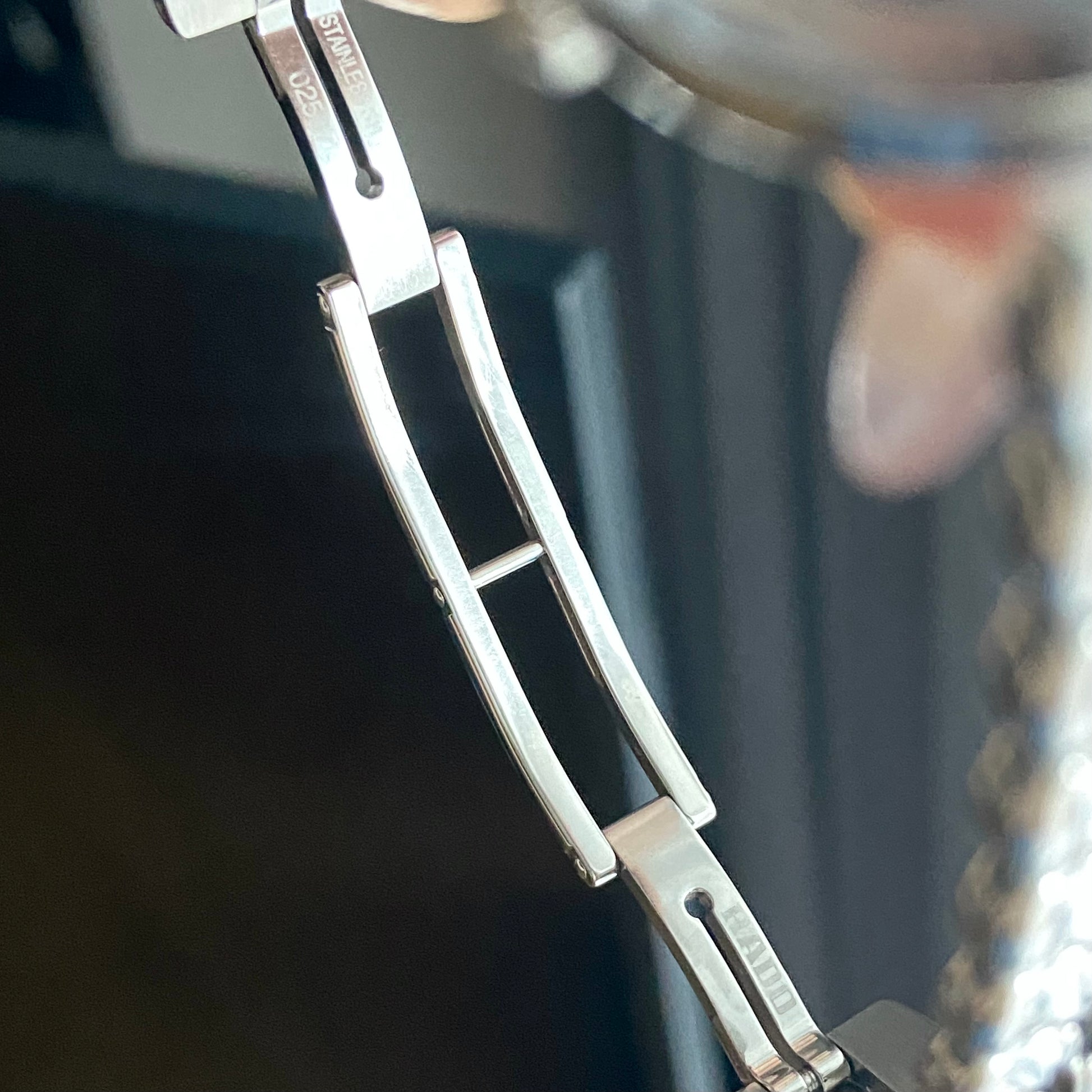 Glass:Full surface sapphire crystal with side cuts that enhance light reflection, a signature of this model.