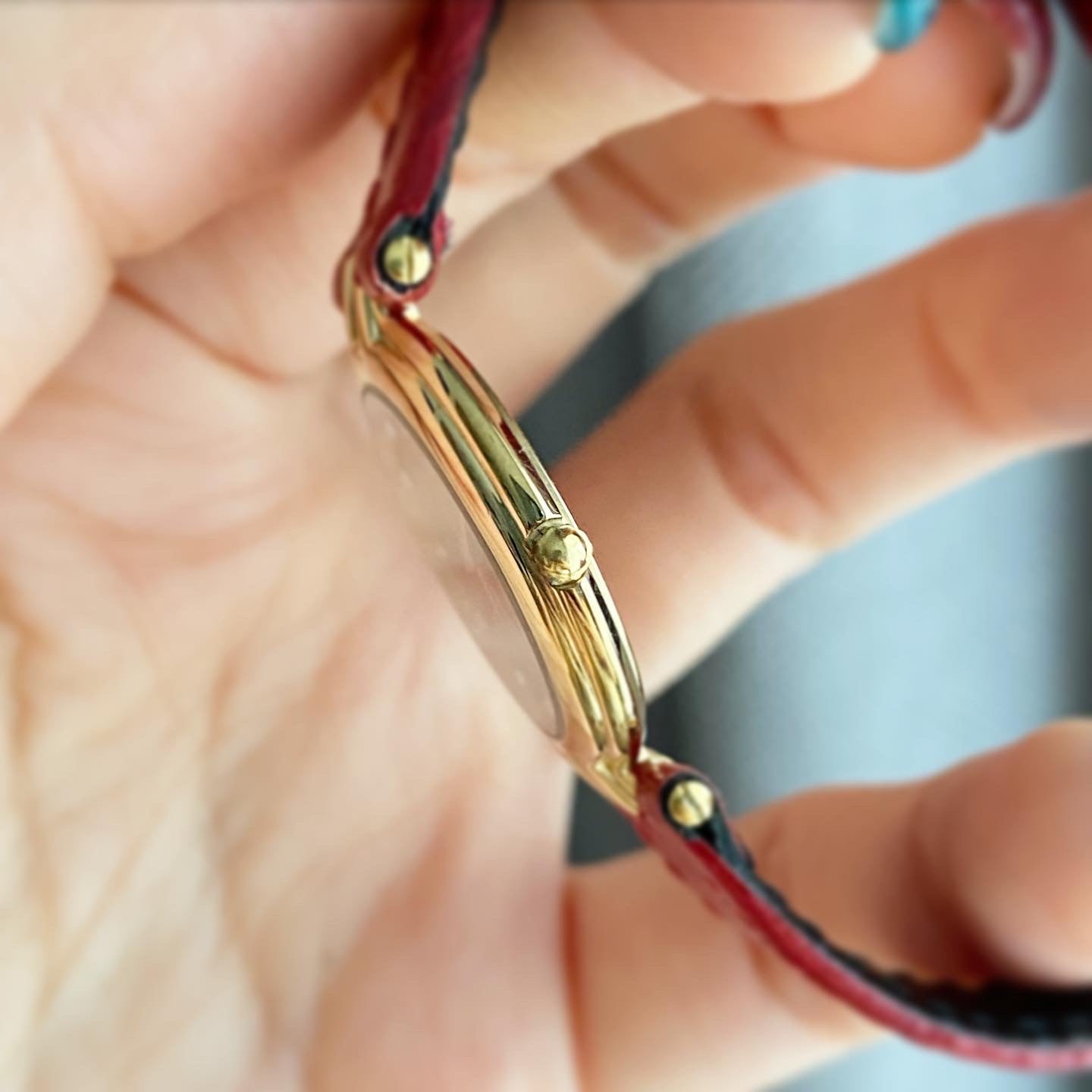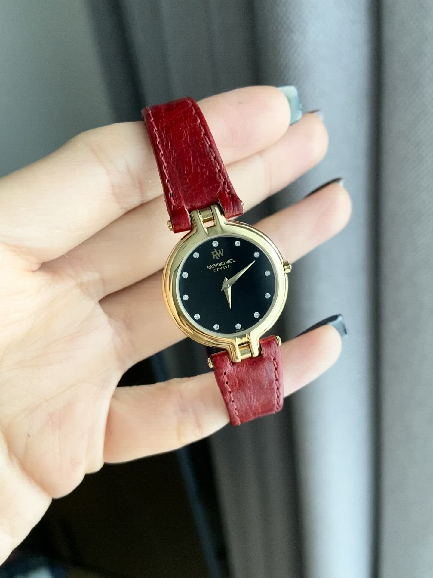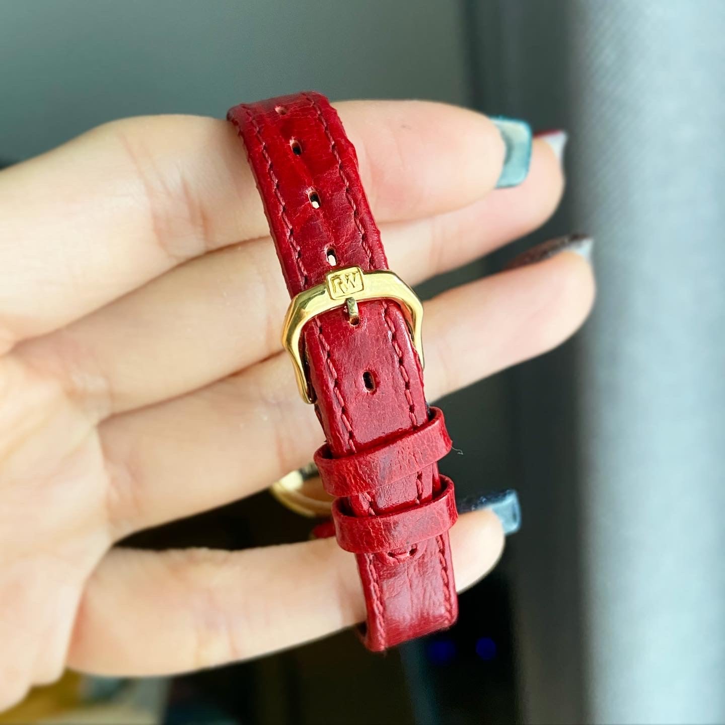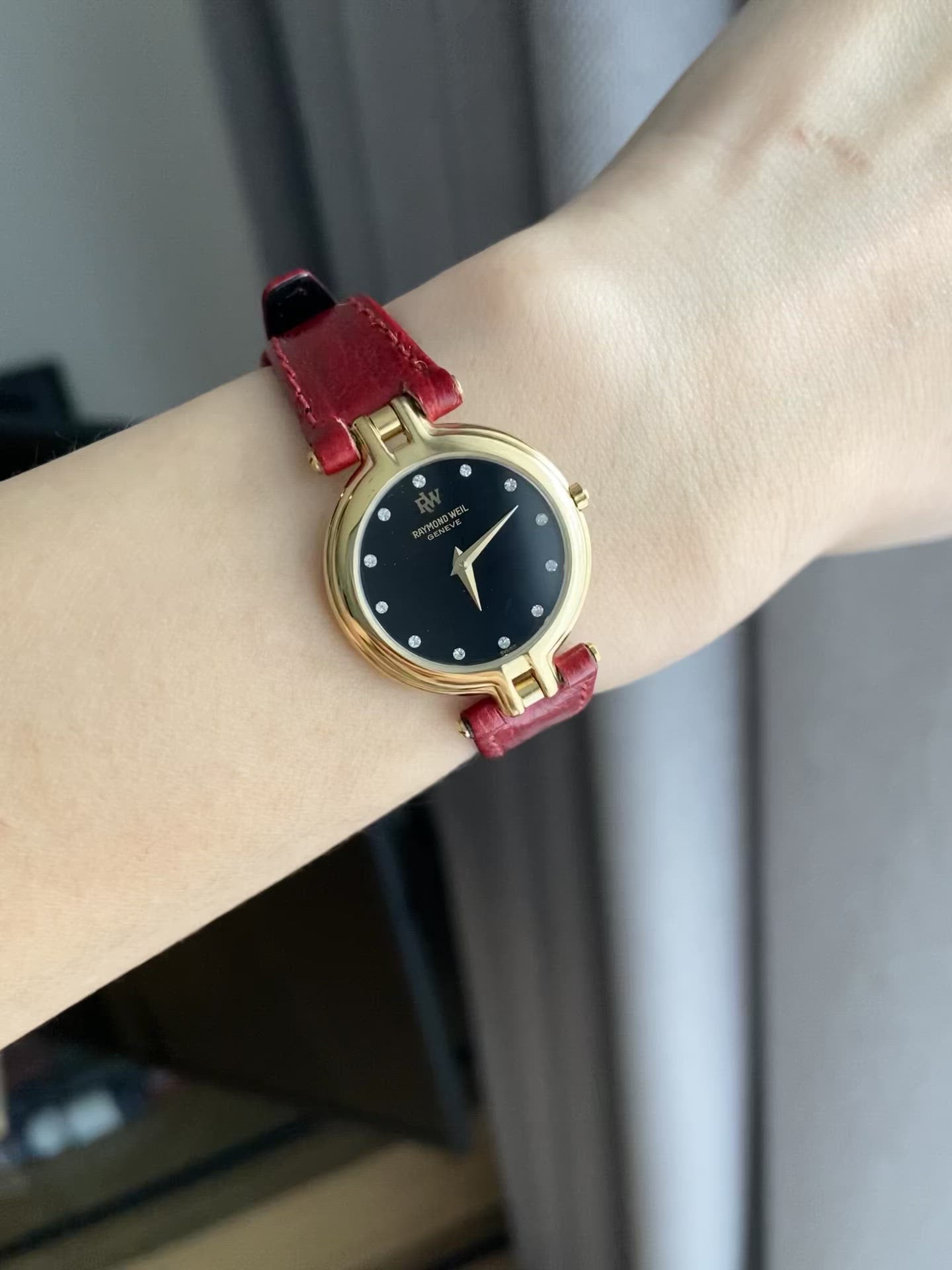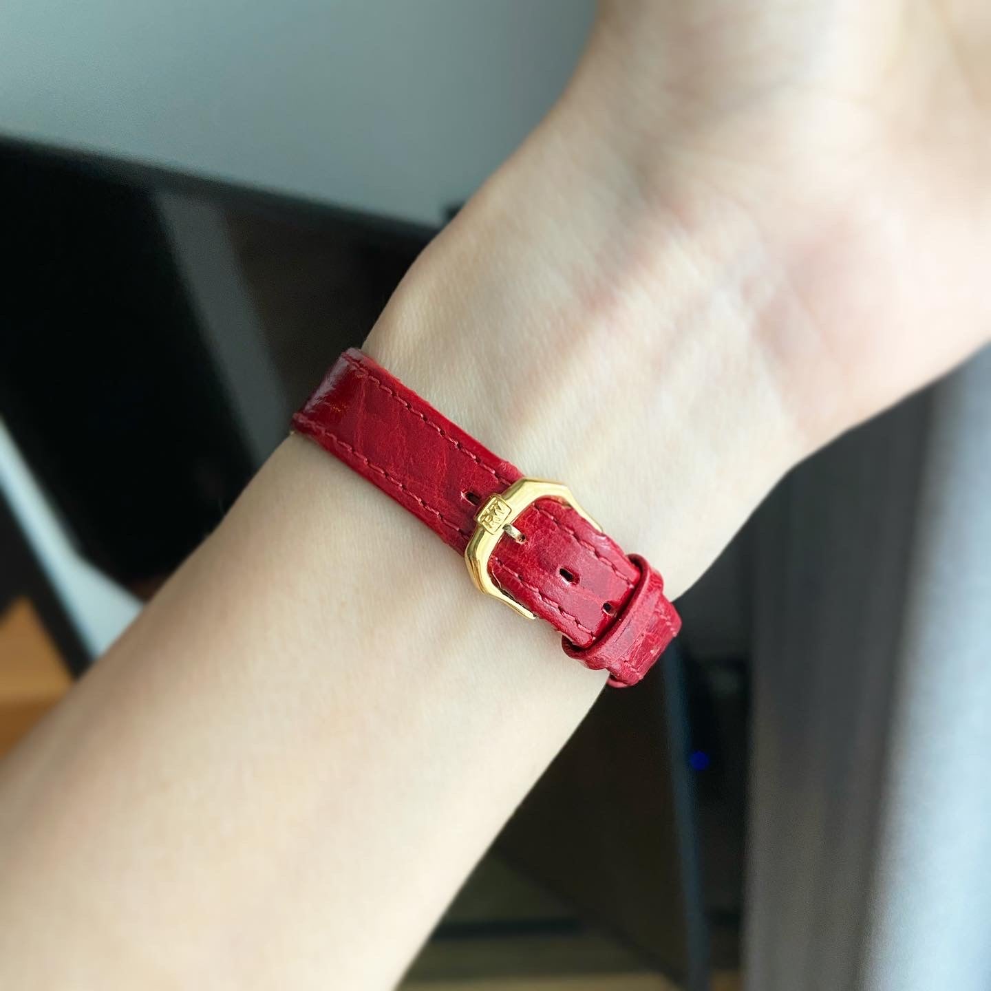Ladies size 23mm(25รวม) หน้าปัดดำ 2เข็มทอง หลักเพชร (Rhinestones) สวยมาก ตัวเรือนทอง เรือนบางมาก 18KGP 10M สวยมากๆ สายไม่เดิม เป็นหนังแท้เปลี่ยนใหม่อย่างดี สีแดง สวยมาก สายยาว 14-18.2cm บัคเคิลเดิม Swiss made สภาพรวม 95%+ สวยหรูใหม่มาก หรูมาก ซีลกันรอยฝาหลังติดอยู่ เรือนบาง สวยมาก มีกล่องใส่แทนให้อย่างดี 🖤♥️