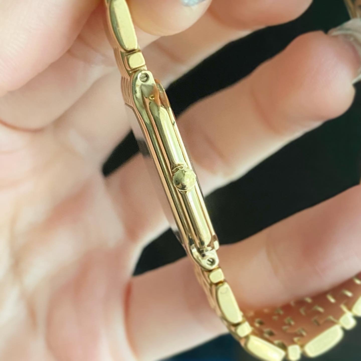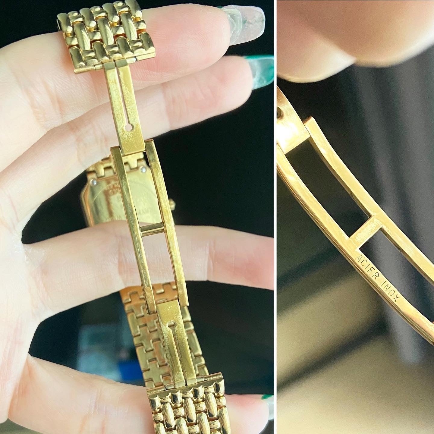 Dial: Black with 2 gold tone hands. Rhinestones around the edge of the dial 2 rounds(very beautiful). Date complication.