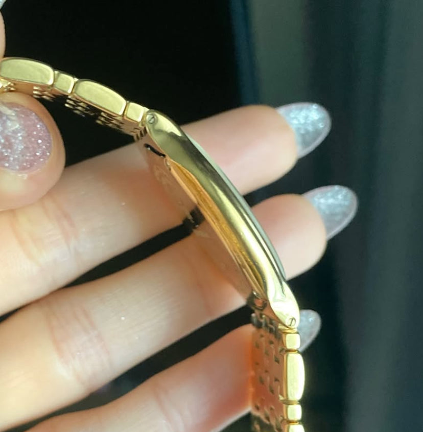 Dial: Black with 2 gold tone hands. Rhinestones around the edge of the dial 2 rounds(very beautiful).