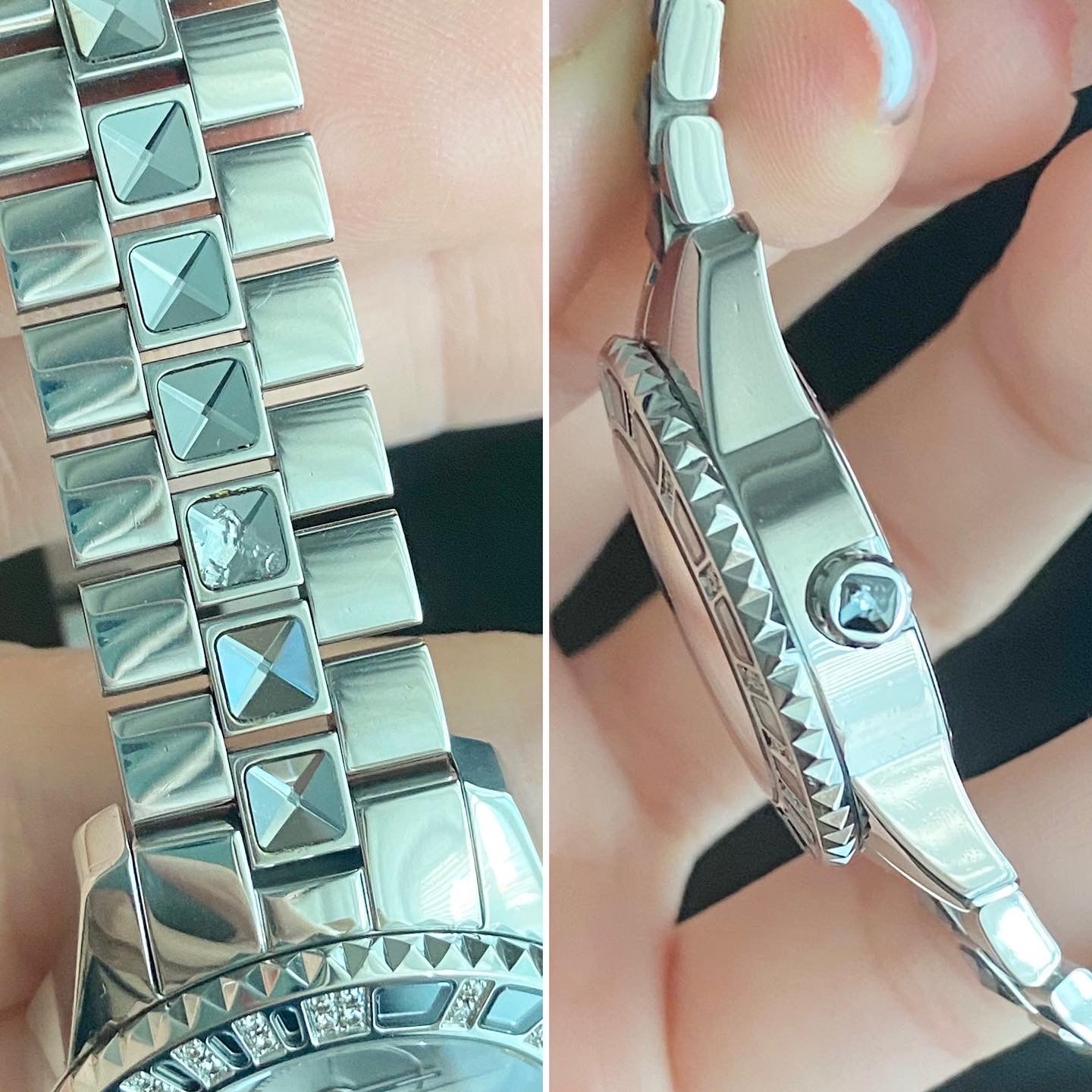 Case: Stainless steel with 44p diamonds (0.28cts) and gray crystals frame. Crystal crown.
