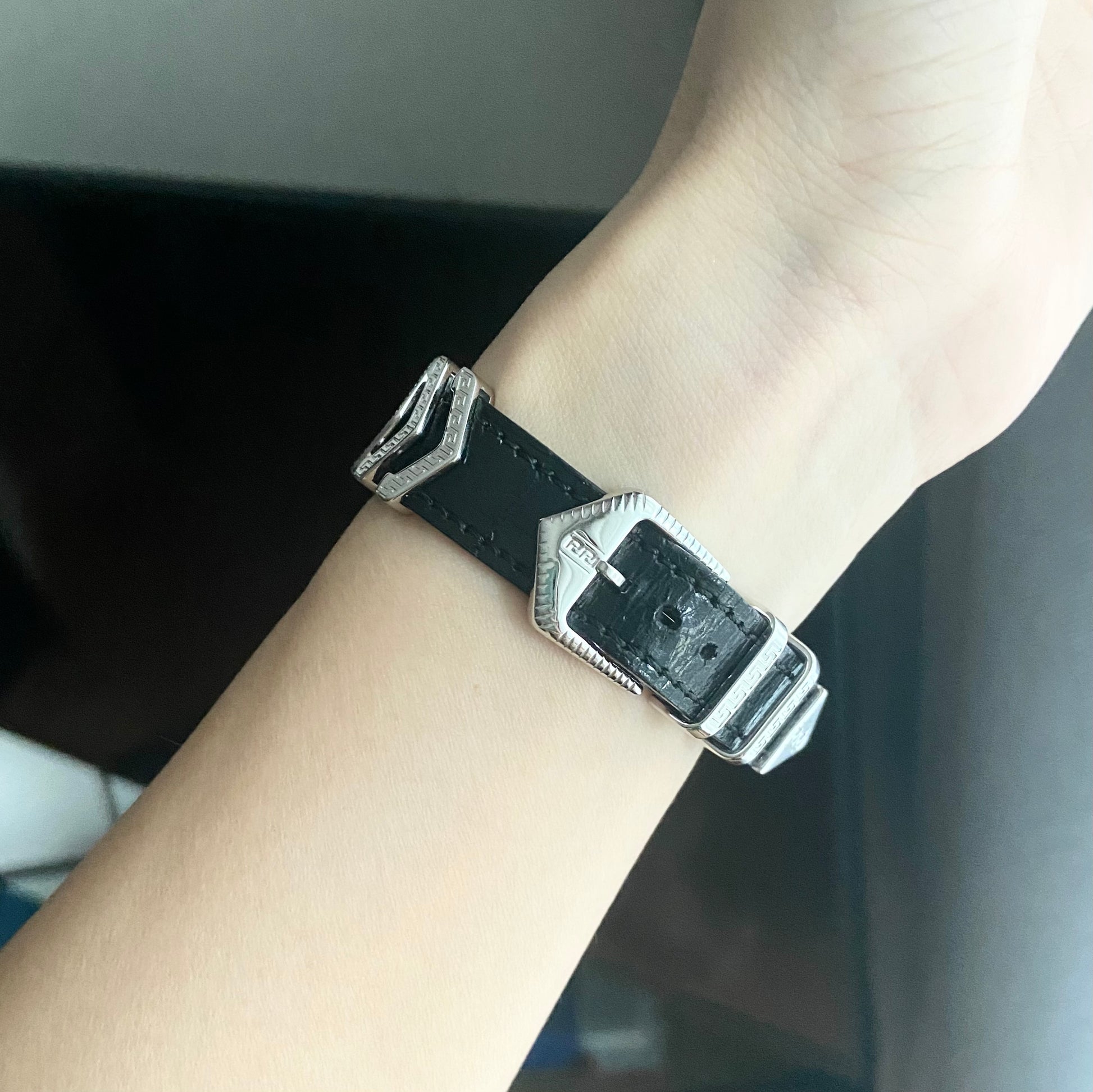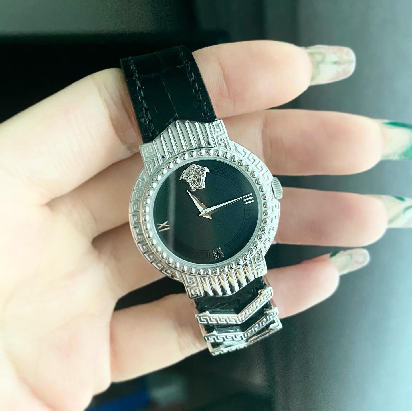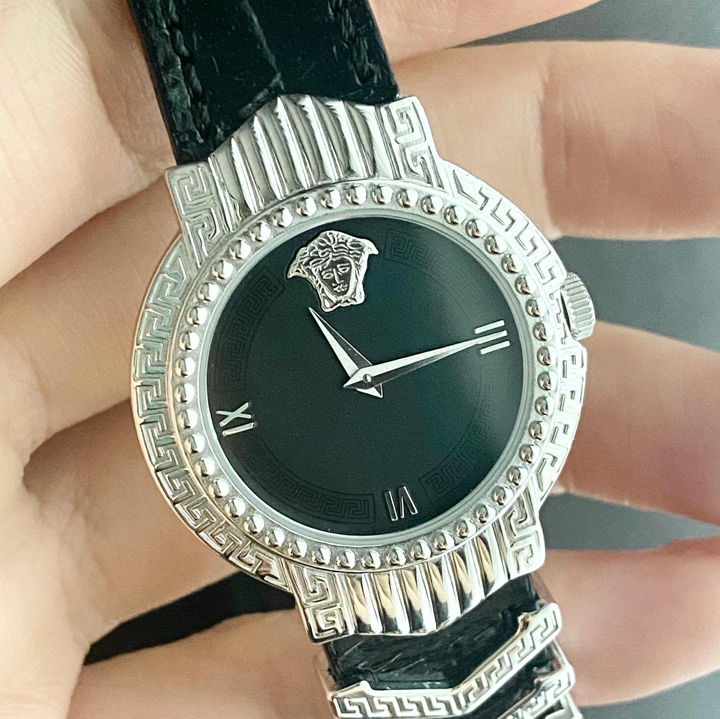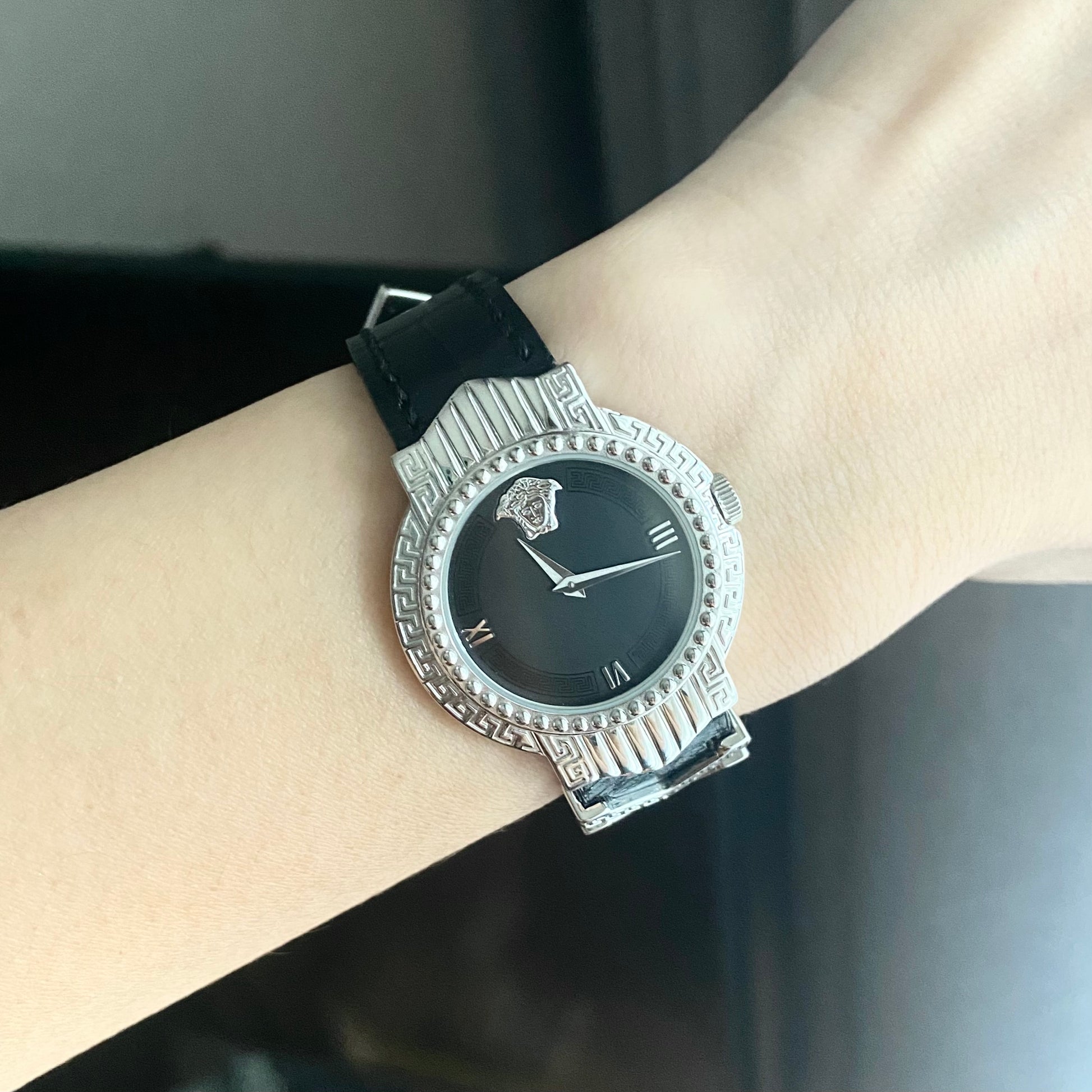 Dial: Matte black with Versace pattern in lacquered black around the dial with 2 silver tone hands. 3 Roman numerals with Medusa head at 12o'clock.