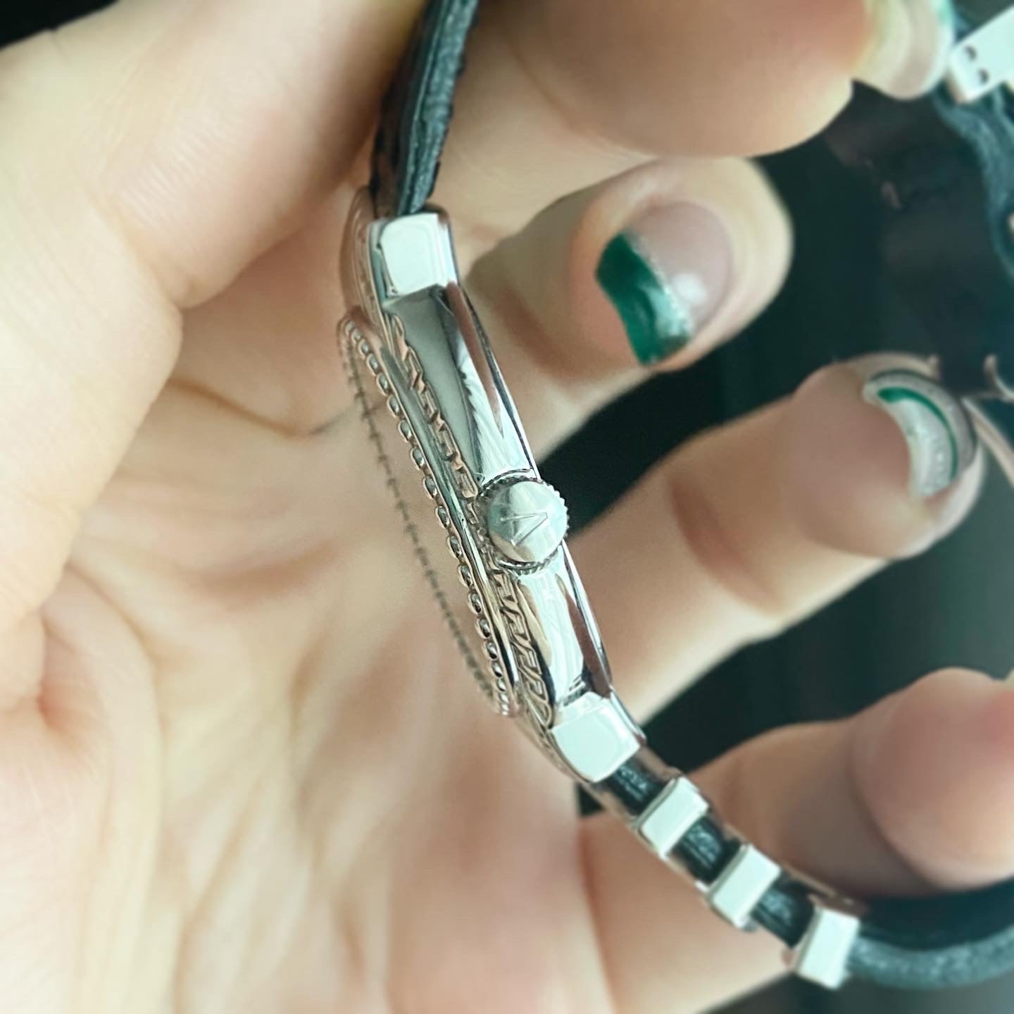 Strap: Leather with white gold plated 10M buckle and parts.
