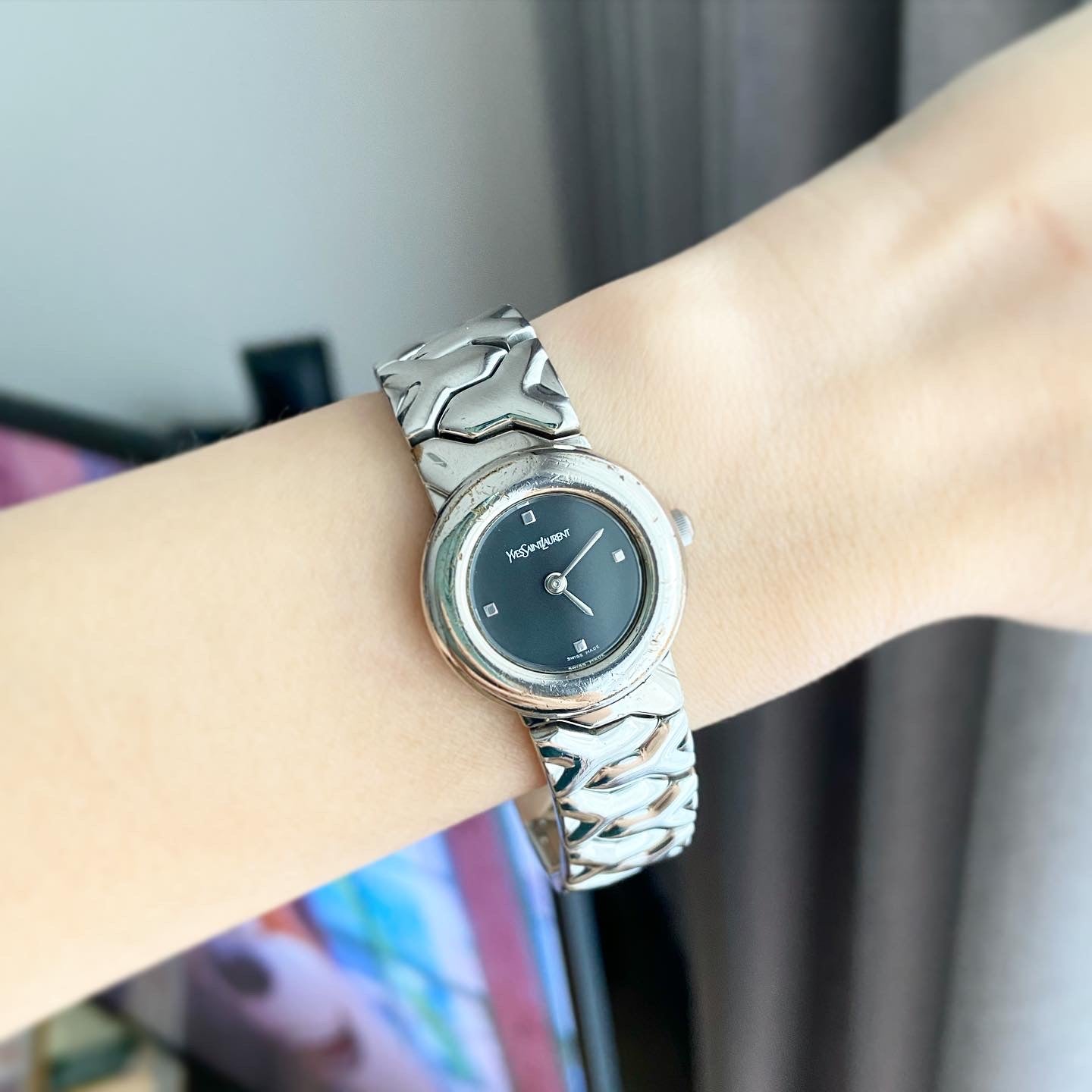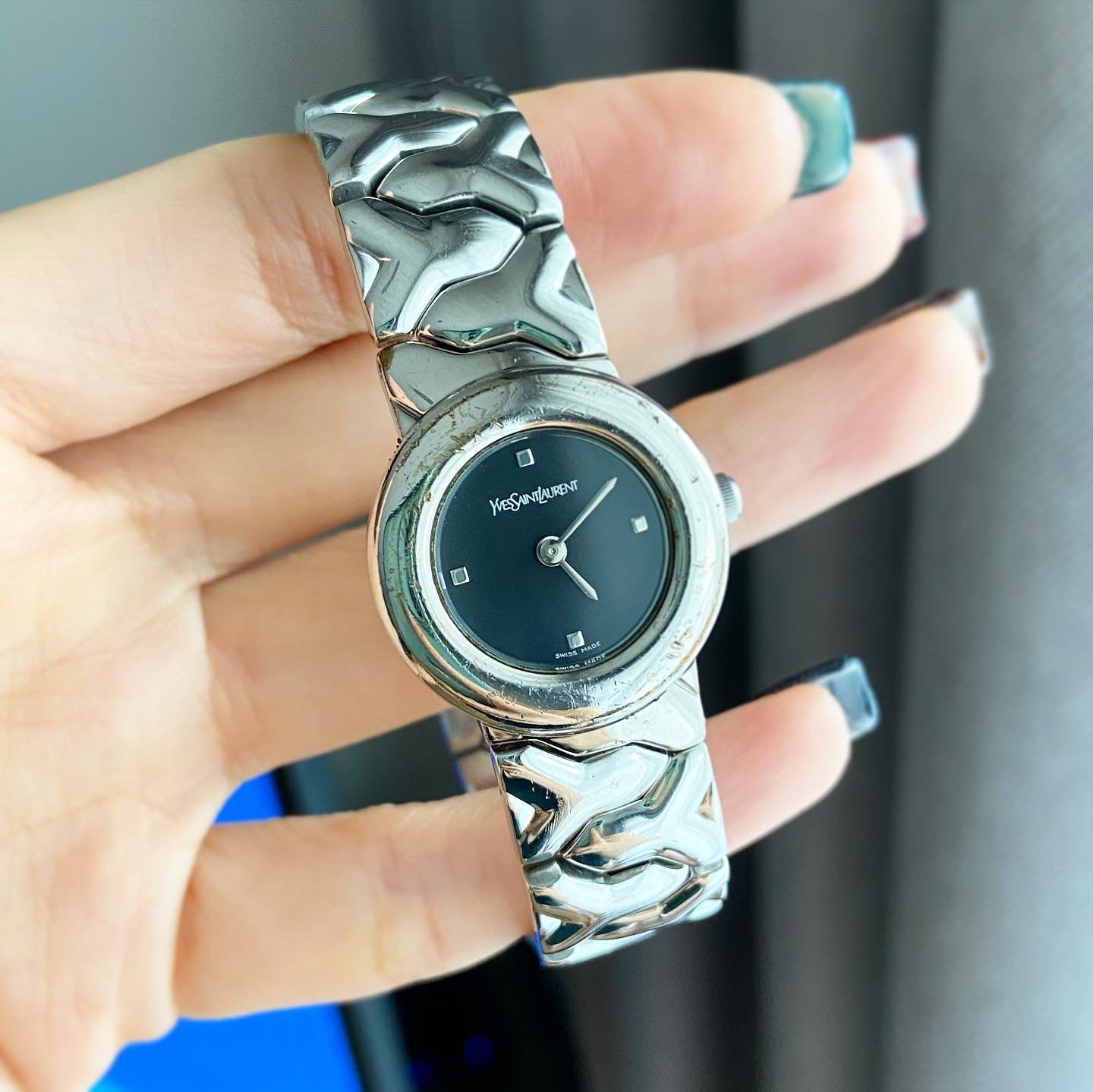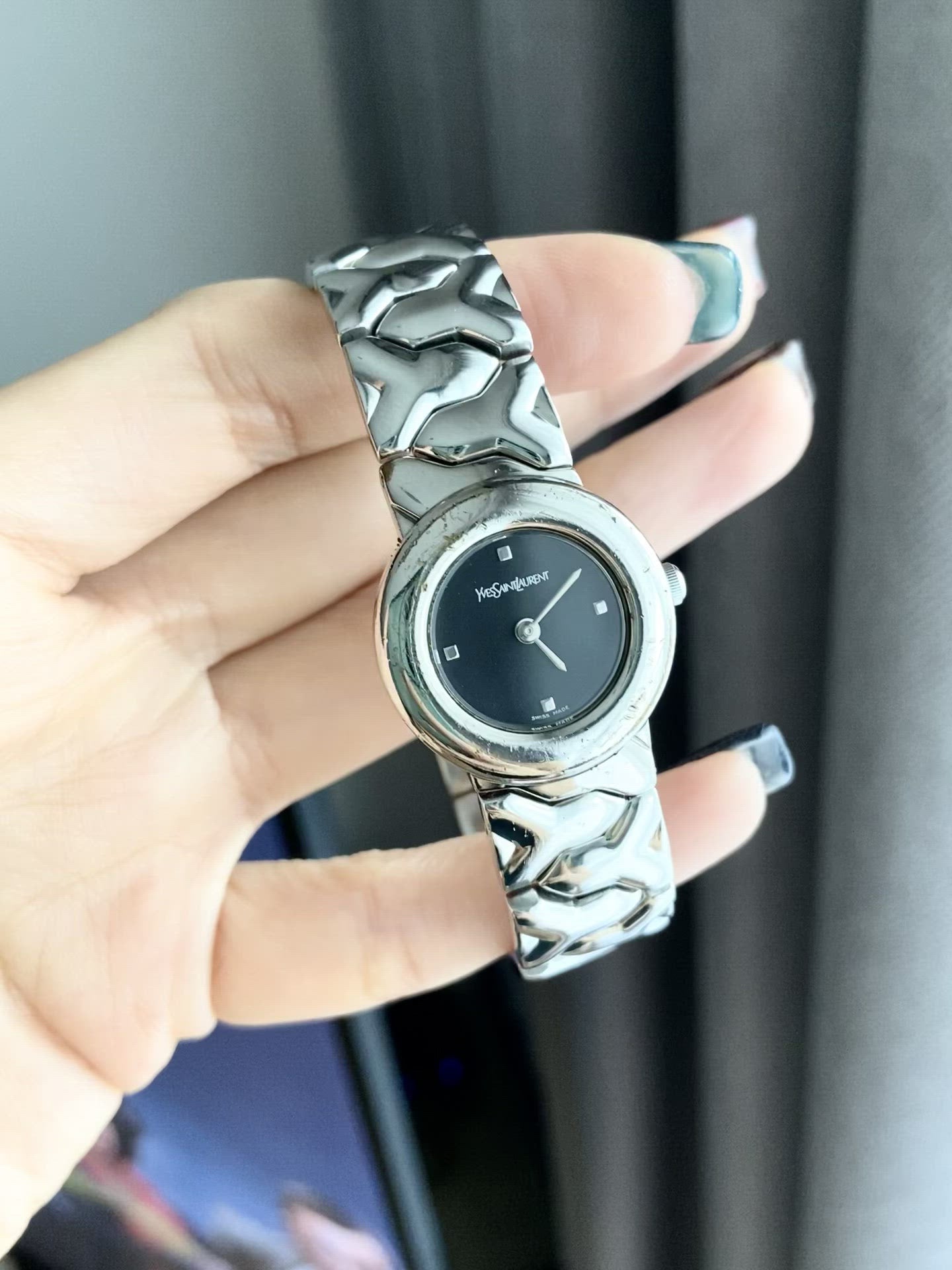 YSL Ladies size 24mm (26รวม) หน้าปัดดำแมท 2เข็มเงิน ตัวเรือนและสายสีเงิน สายตัว Y ไขว้ ทั้งสาย น่ารักมากกก สายยาว 17.5cm ตัดได้ Swiss made สภาพรวม 85%+++ กระจกไร้รอย สวยหรู กรอบมีรอยจากการใช้งาน มีเฟดออกทอง ไม่มีผลต่อการใช้งาน มีกล่องอย่างดีใส่แทนให้ 🖤🤍