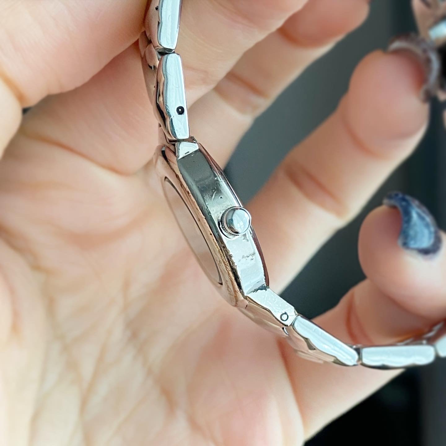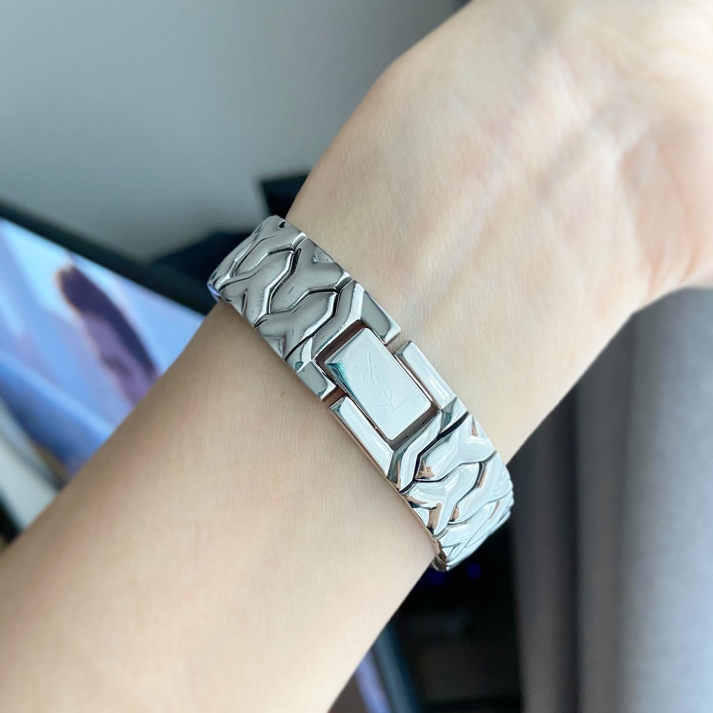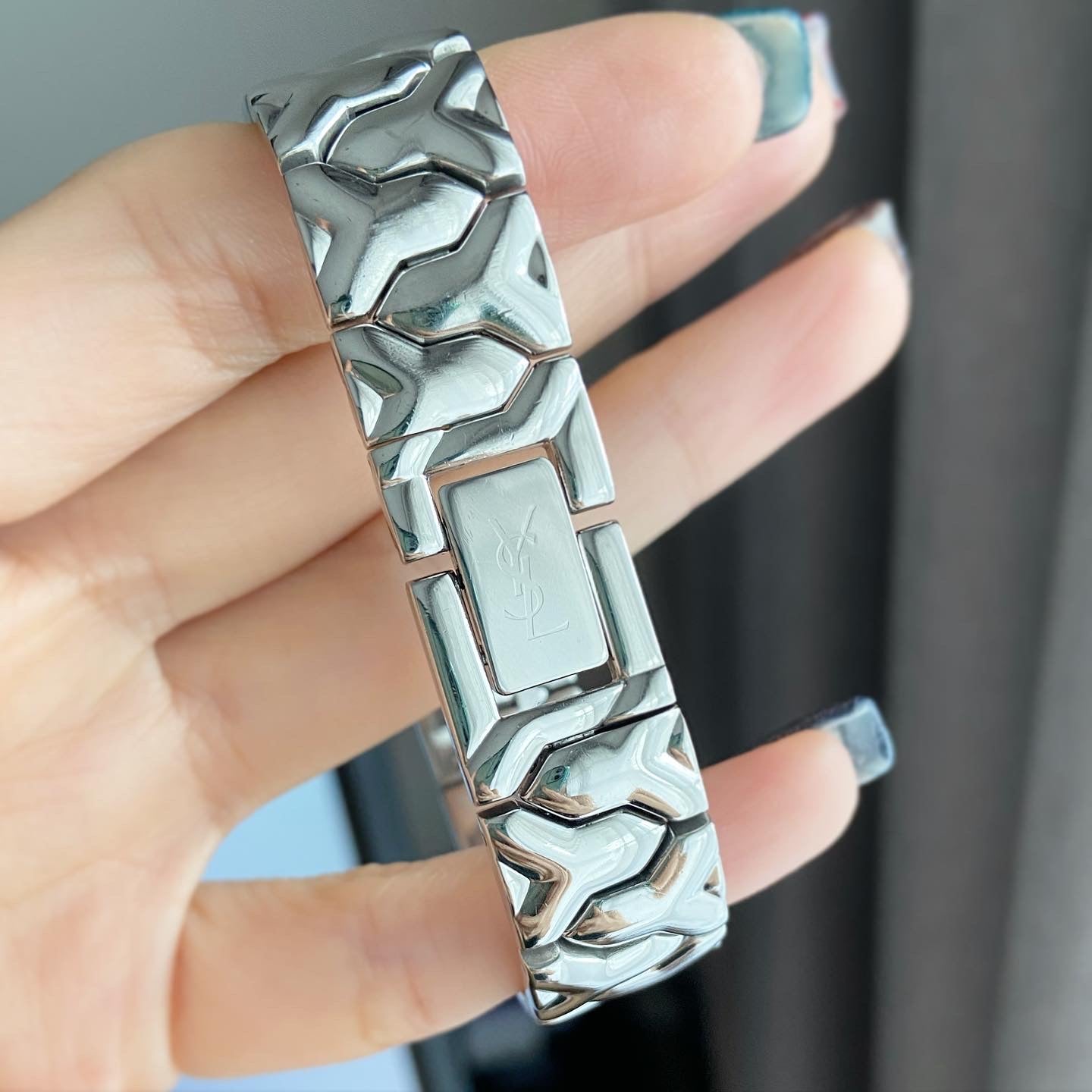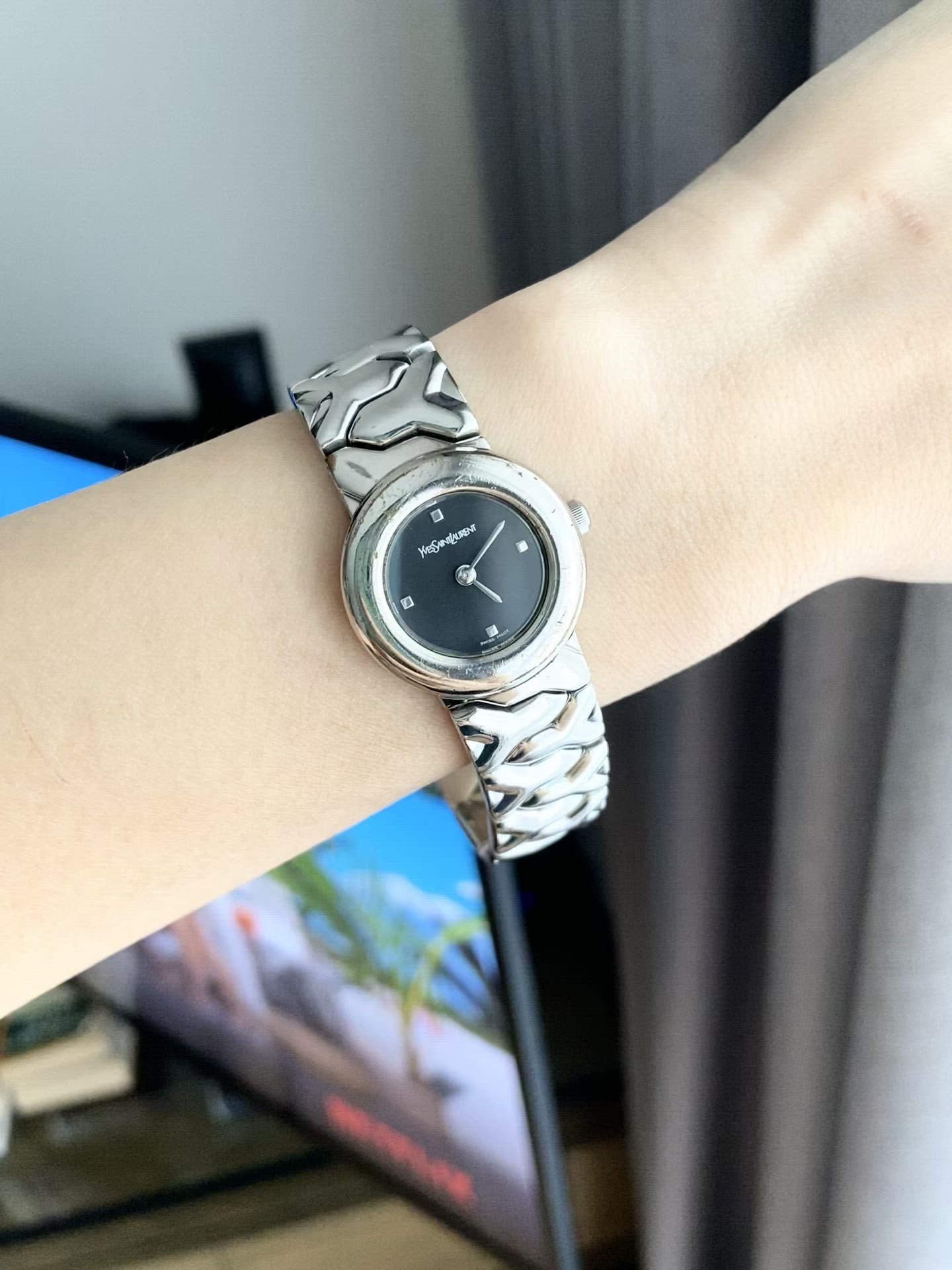 YSL Ladies size 24mm (26รวม) หน้าปัดดำแมท 2เข็มเงิน ตัวเรือนและสายสีเงิน สายตัว Y ไขว้ ทั้งสาย น่ารักมากกก สายยาว 17.5cm ตัดได้ Swiss made สภาพรวม 85%+++ กระจกไร้รอย สวยหรู กรอบมีรอยจากการใช้งาน มีเฟดออกทอง ไม่มีผลต่อการใช้งาน มีกล่องอย่างดีใส่แทนให้ 🖤🤍